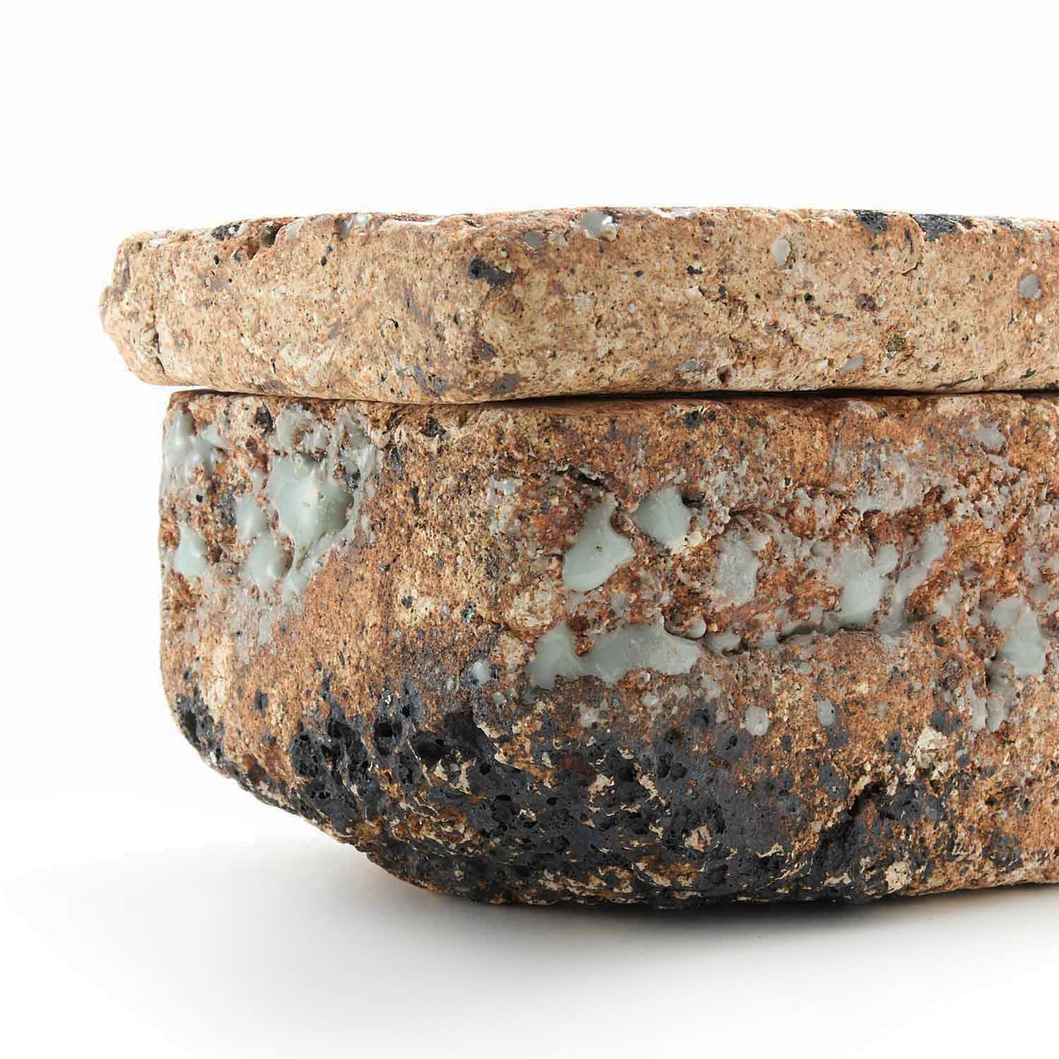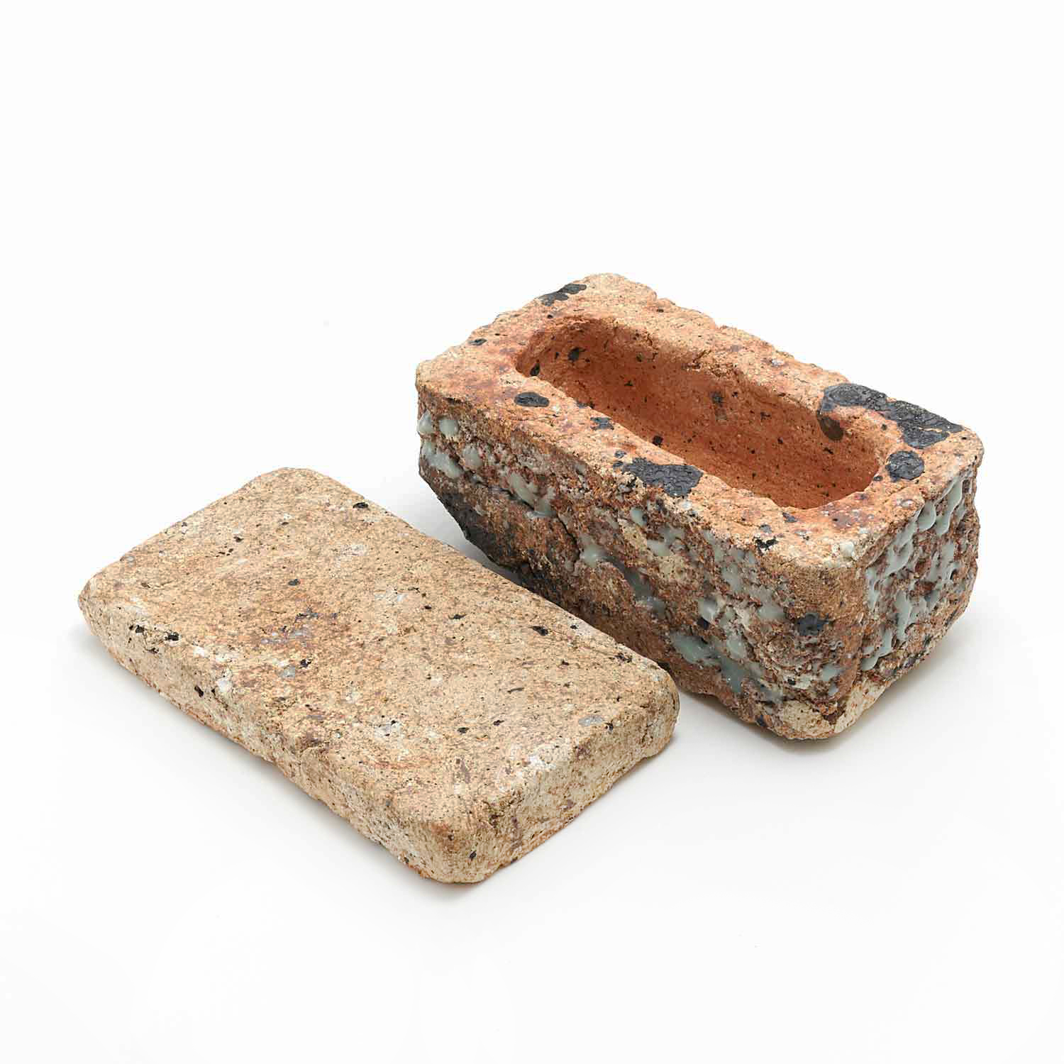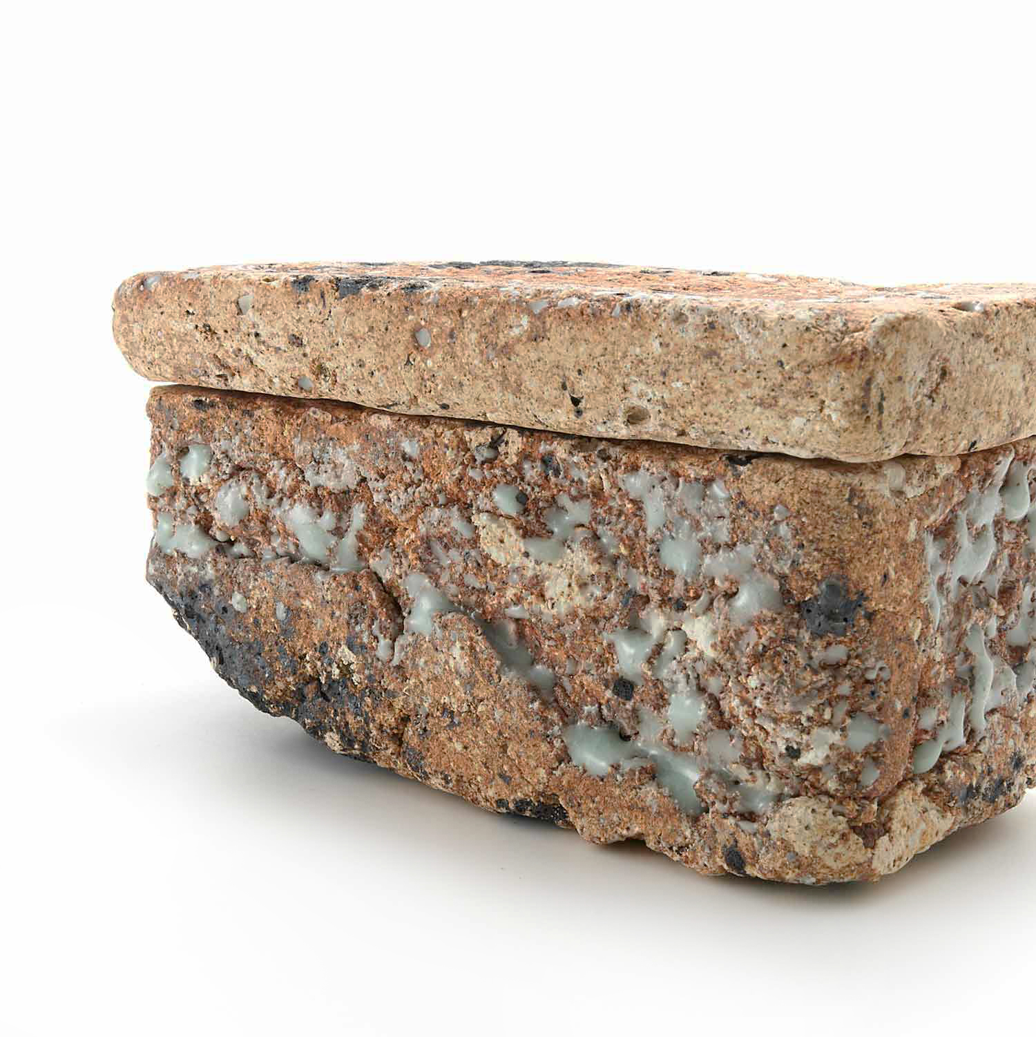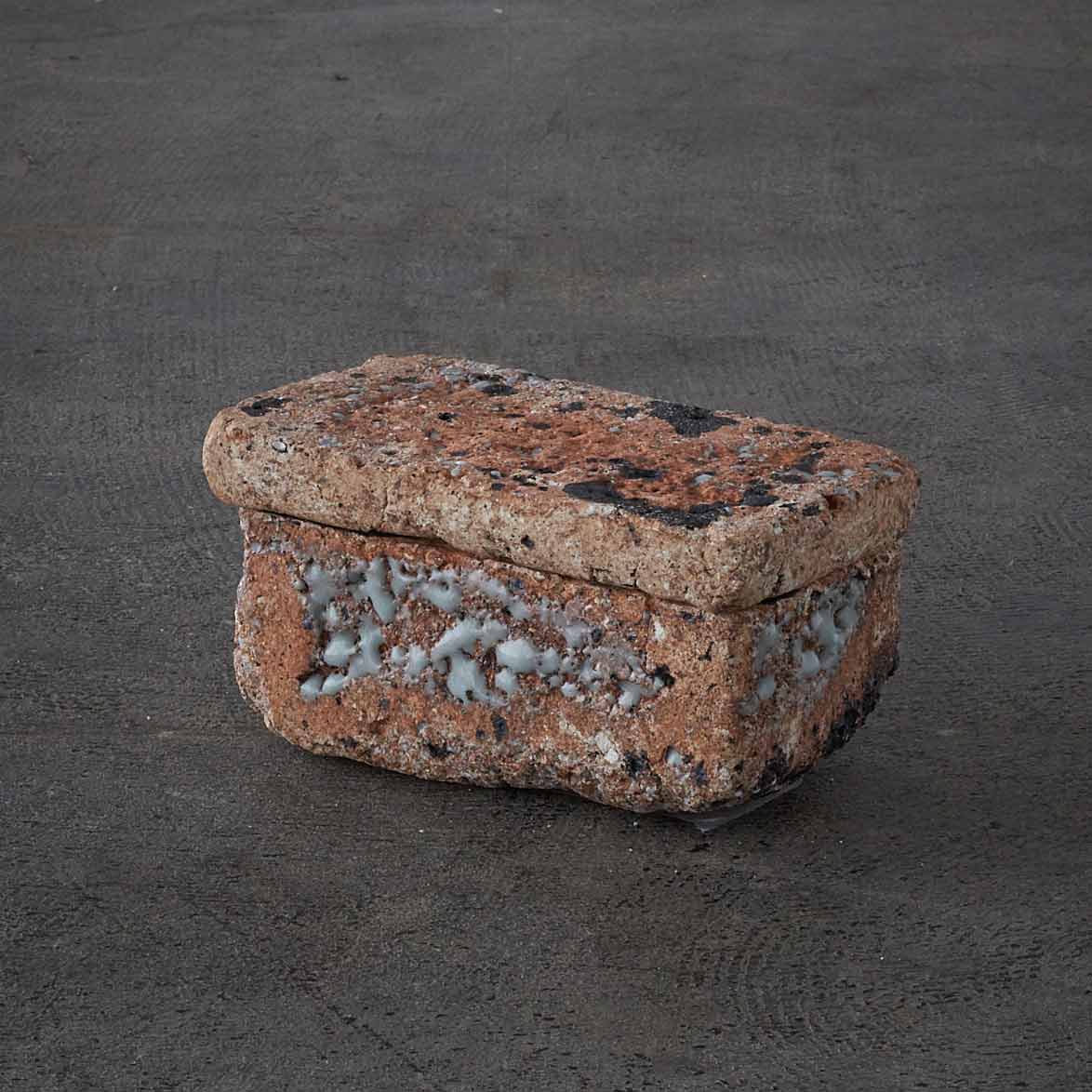 ローマ時代の漆喰の箱の写しから、この匣のシリーズの制作が始まりました。土やガラス質の素材、時には藁なども入れ毎回粘土を作ってから制作をしているため全く同じ質感の作品はありません。
