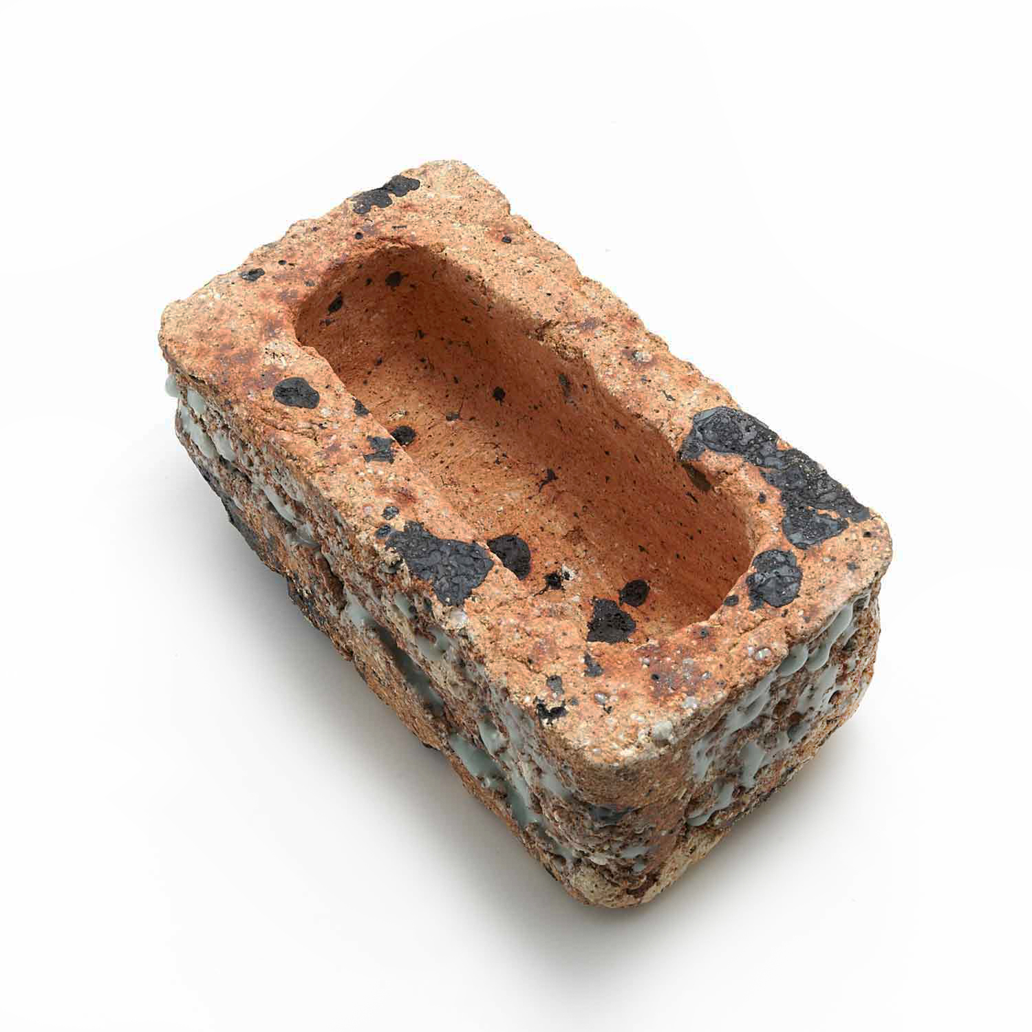 The glassy material mixed with the clay and iron blew out wildly in this cool piece. The color of the clay is also beautiful.