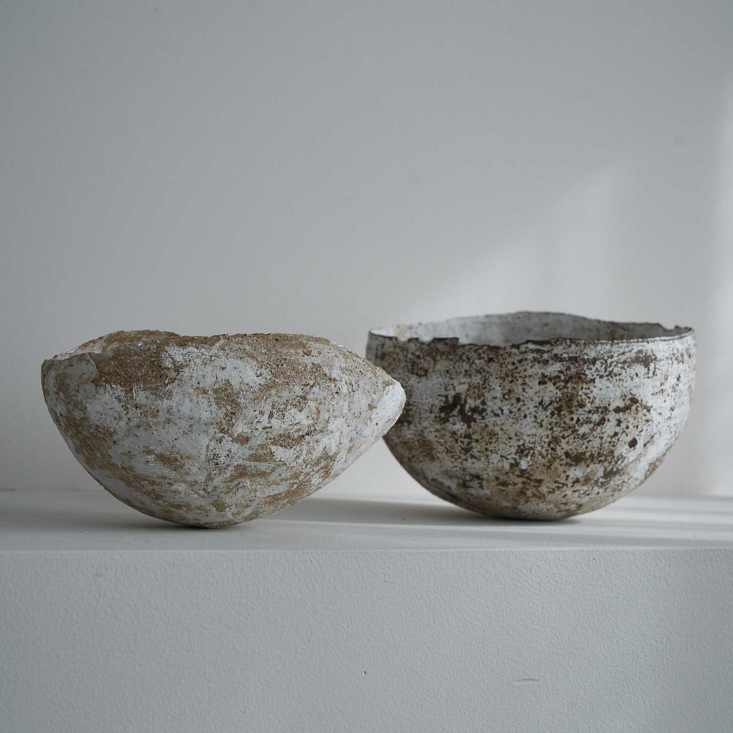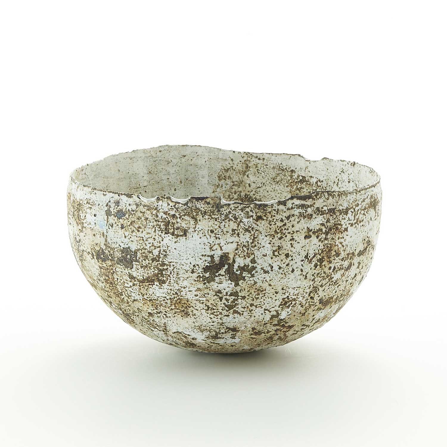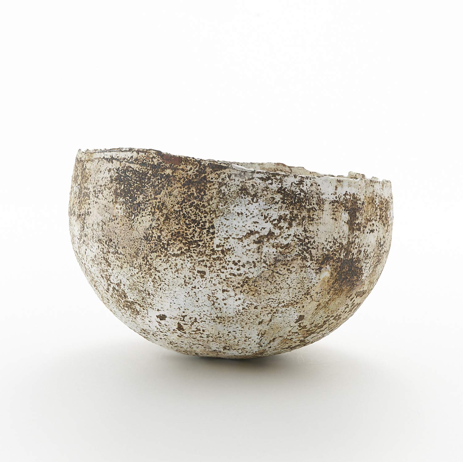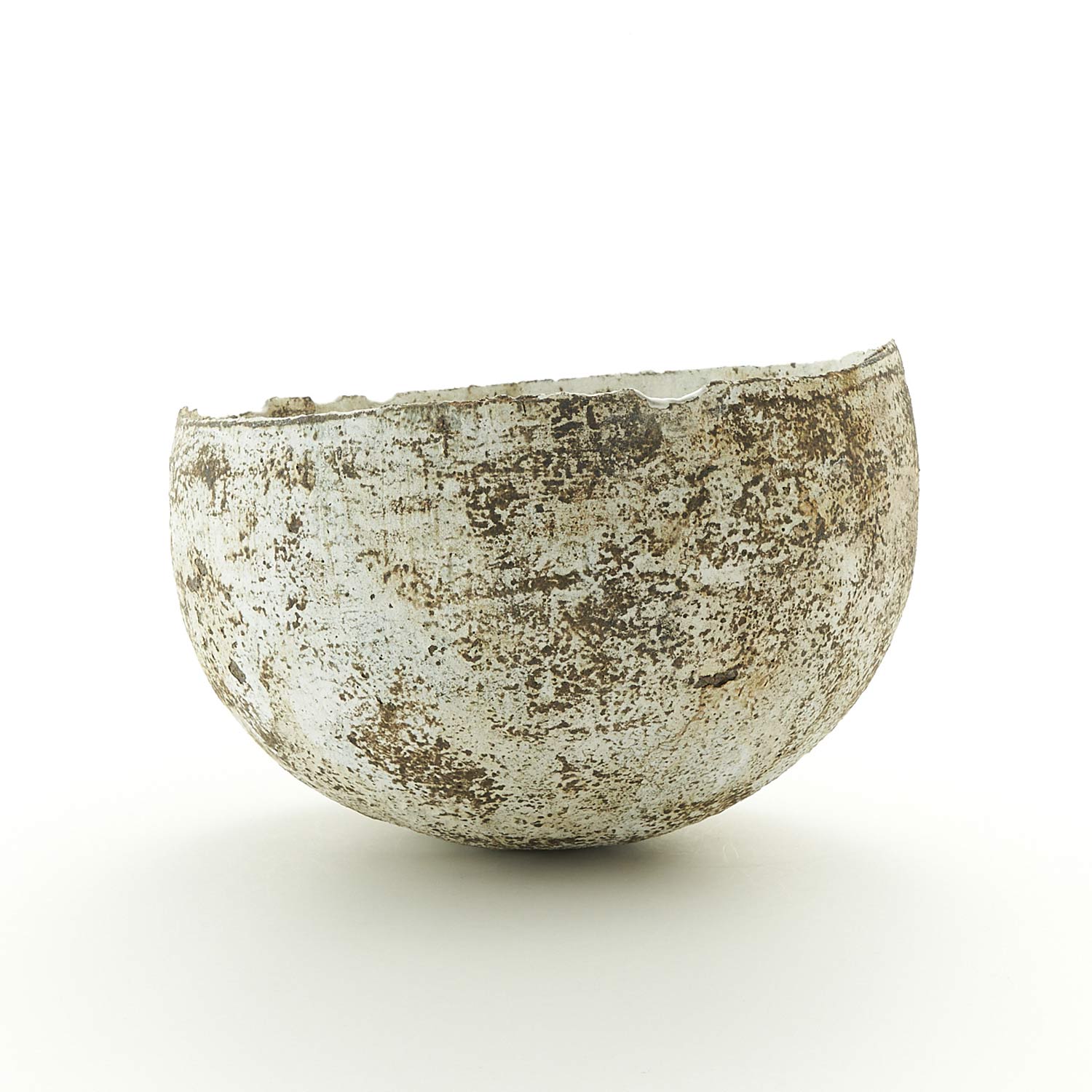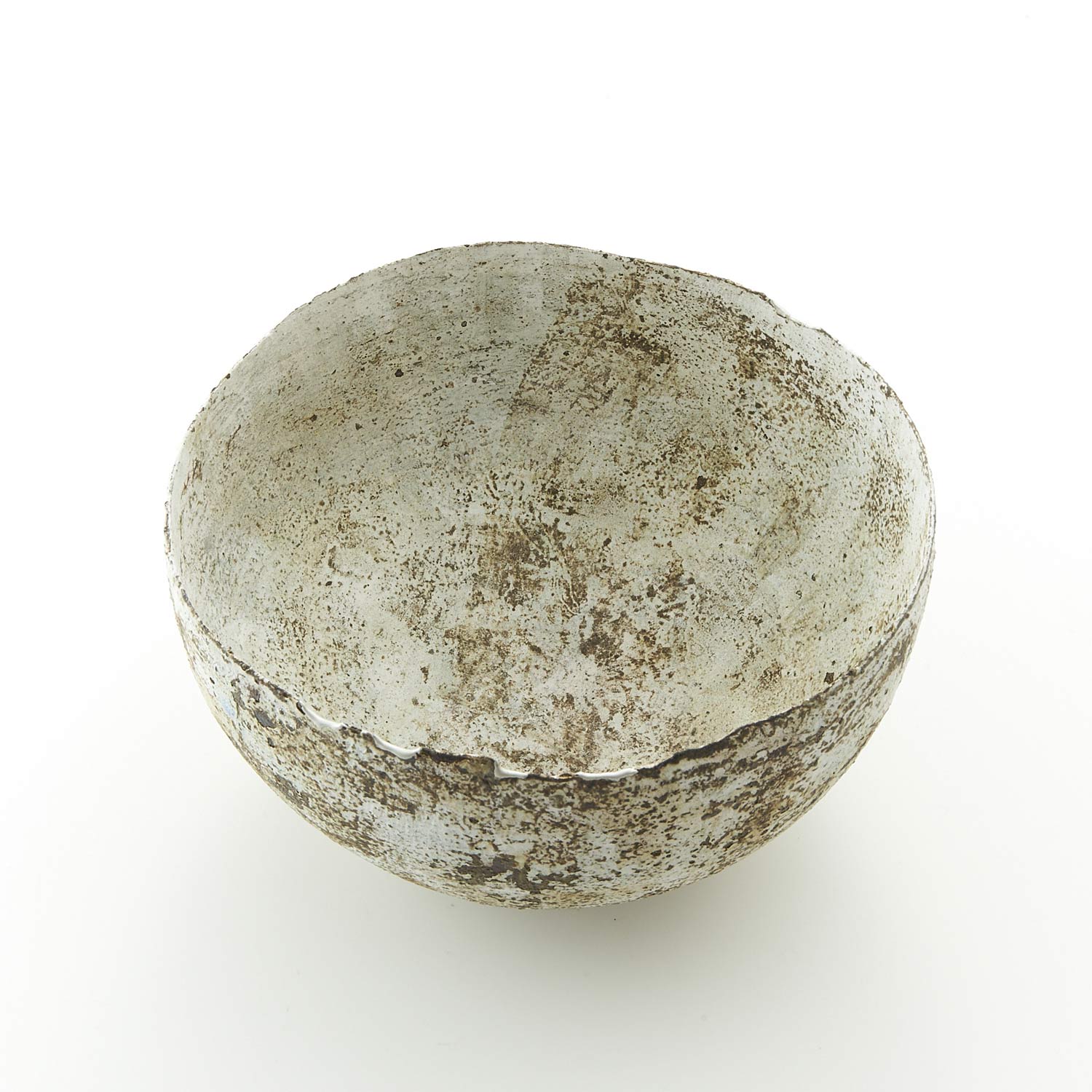 白とこげ茶が織りなすドライな質感。心地よい碗形の作品です。揺らぎのある口縁には銀の蒔絵を施しています。底面を設定していないので、色々な置き方を楽しんでいただけます。