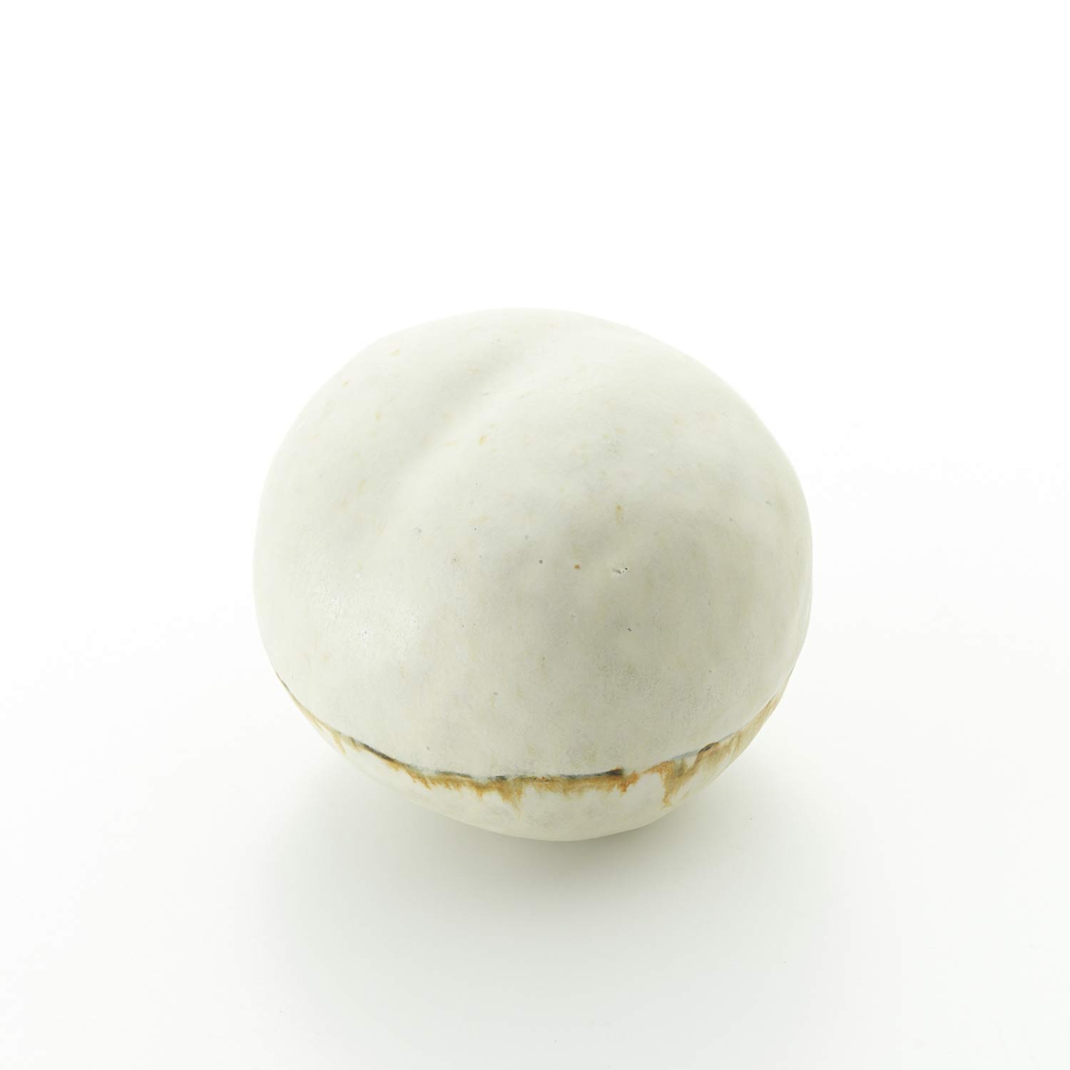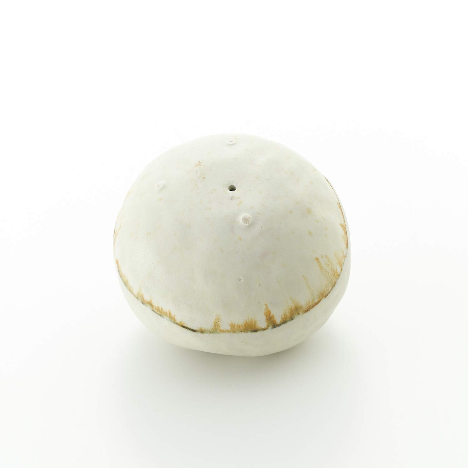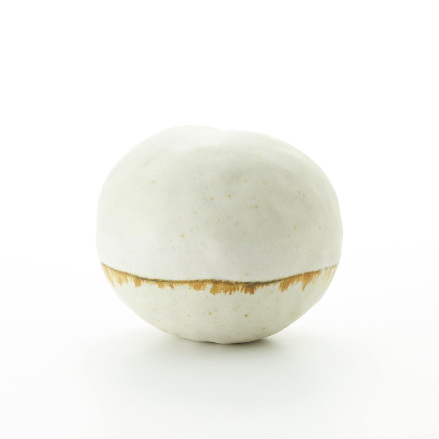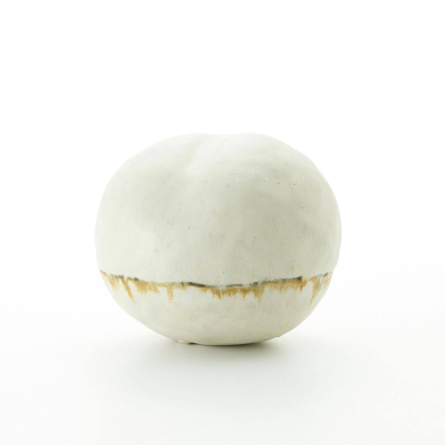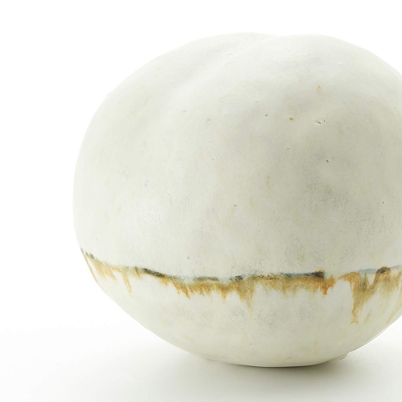 桃のような形の白が美しいオブジェ。鉄釉のラインがアクセントになっています。
