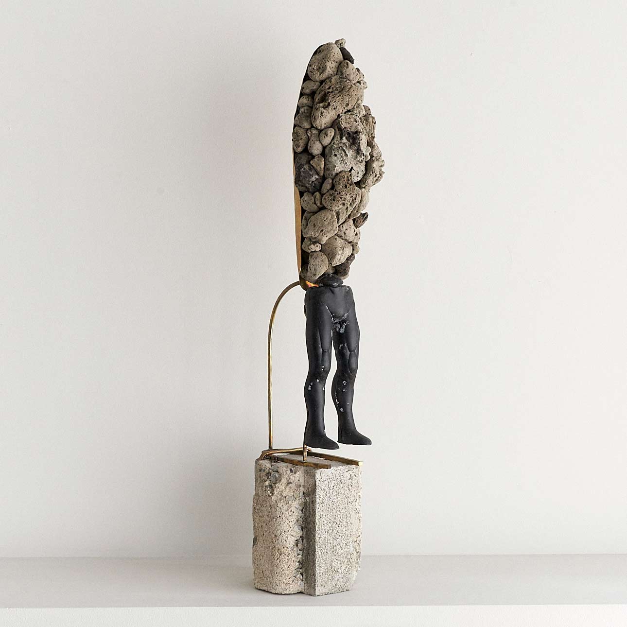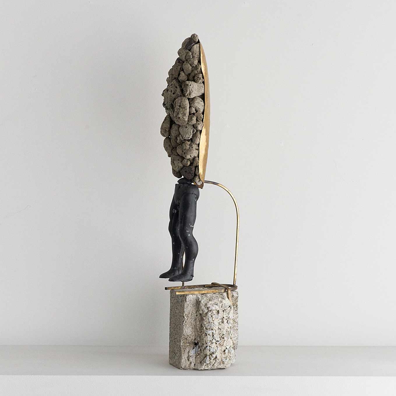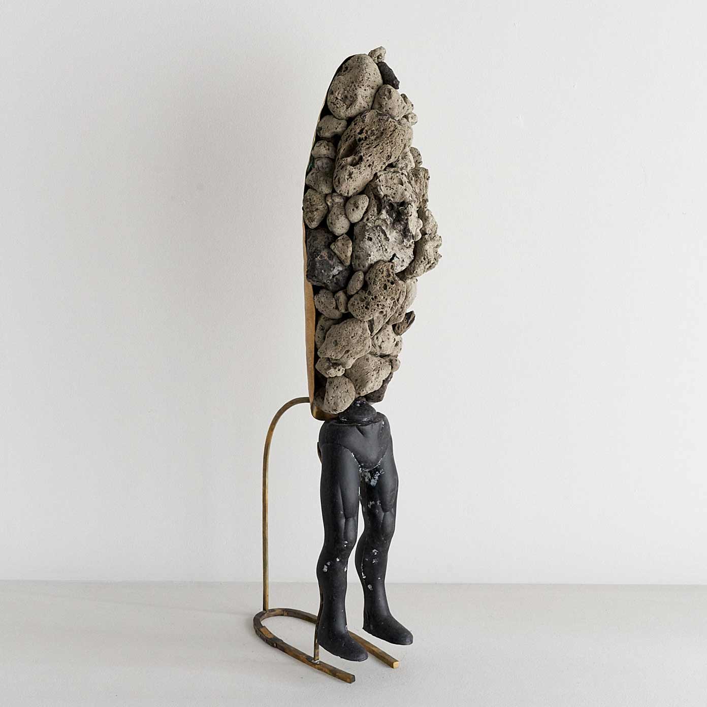 This pumice stone man is the star of this exhibition. This unique piece is finished in brass, combining a pumice stone washed up on the beach and a doll's foot. It has the appearance of a specter lurking in the jungle.