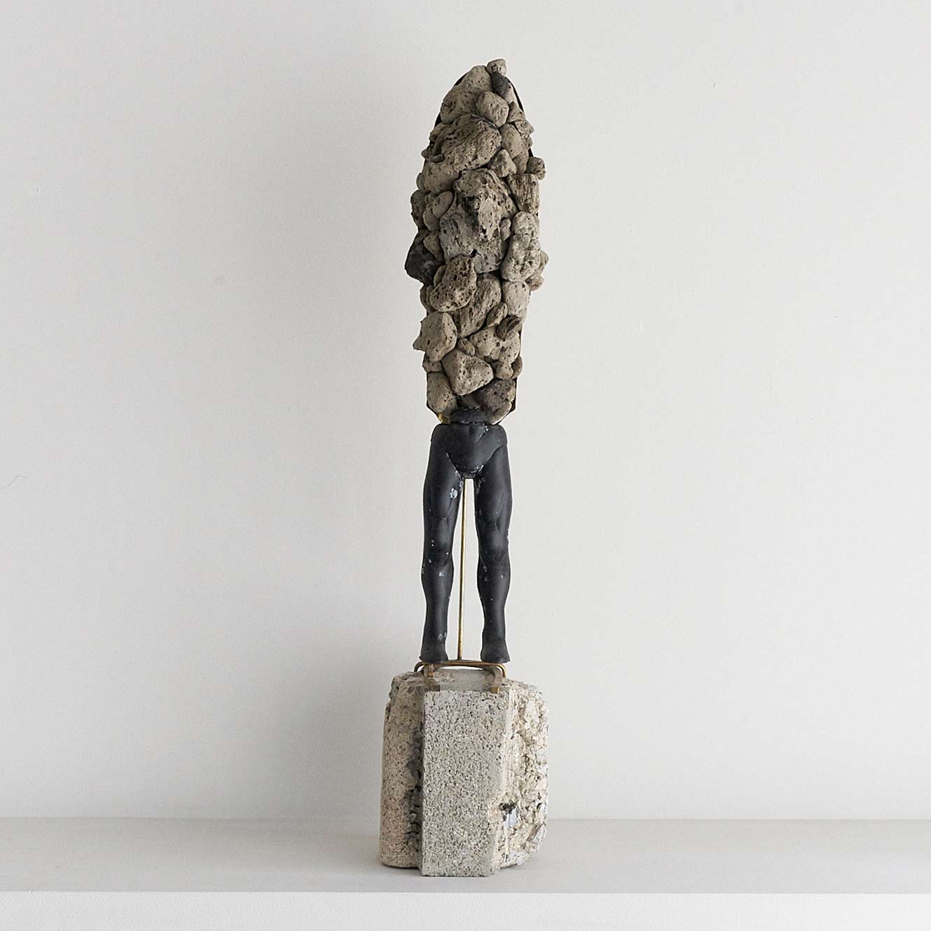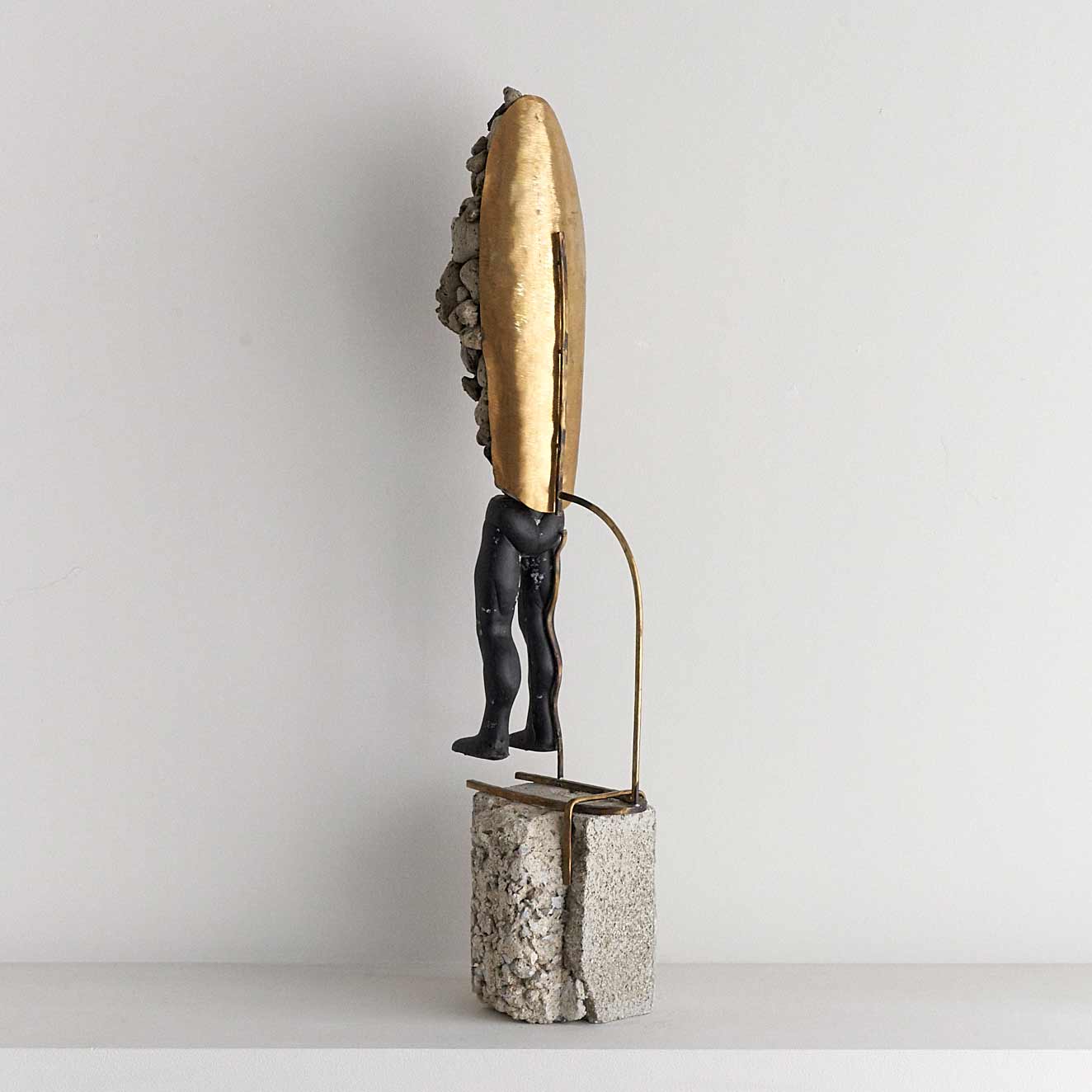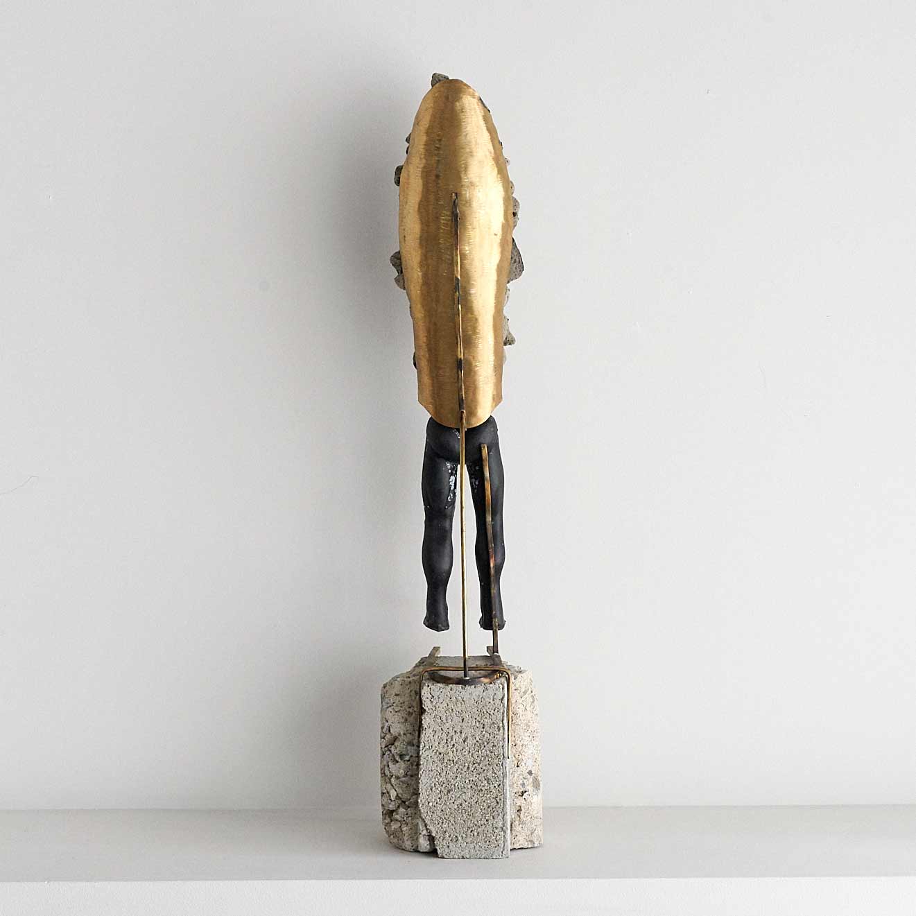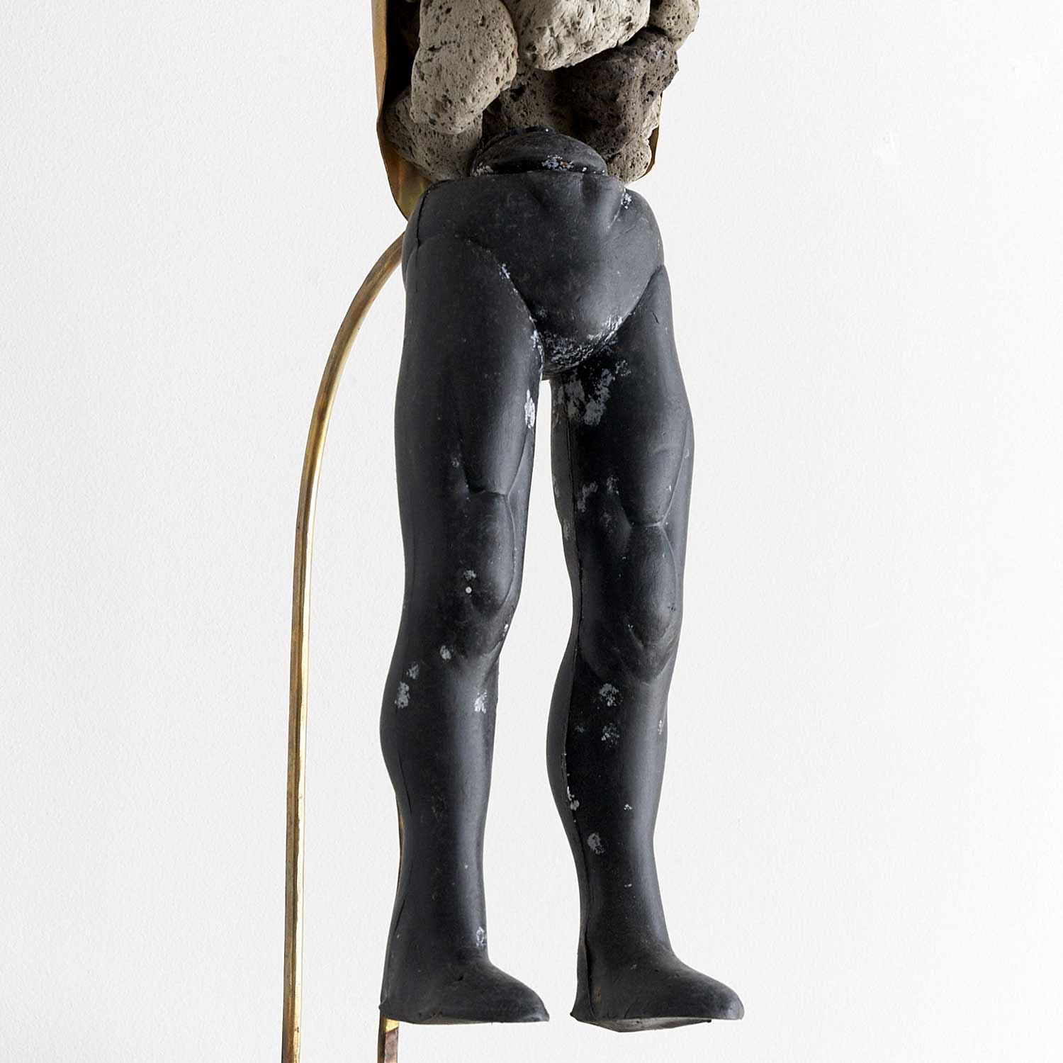 This pumice stone man is the star of this exhibition. This unique piece is finished in brass, combining a pumice stone washed up on the beach and a doll's foot. It has the appearance of a specter lurking in the jungle.