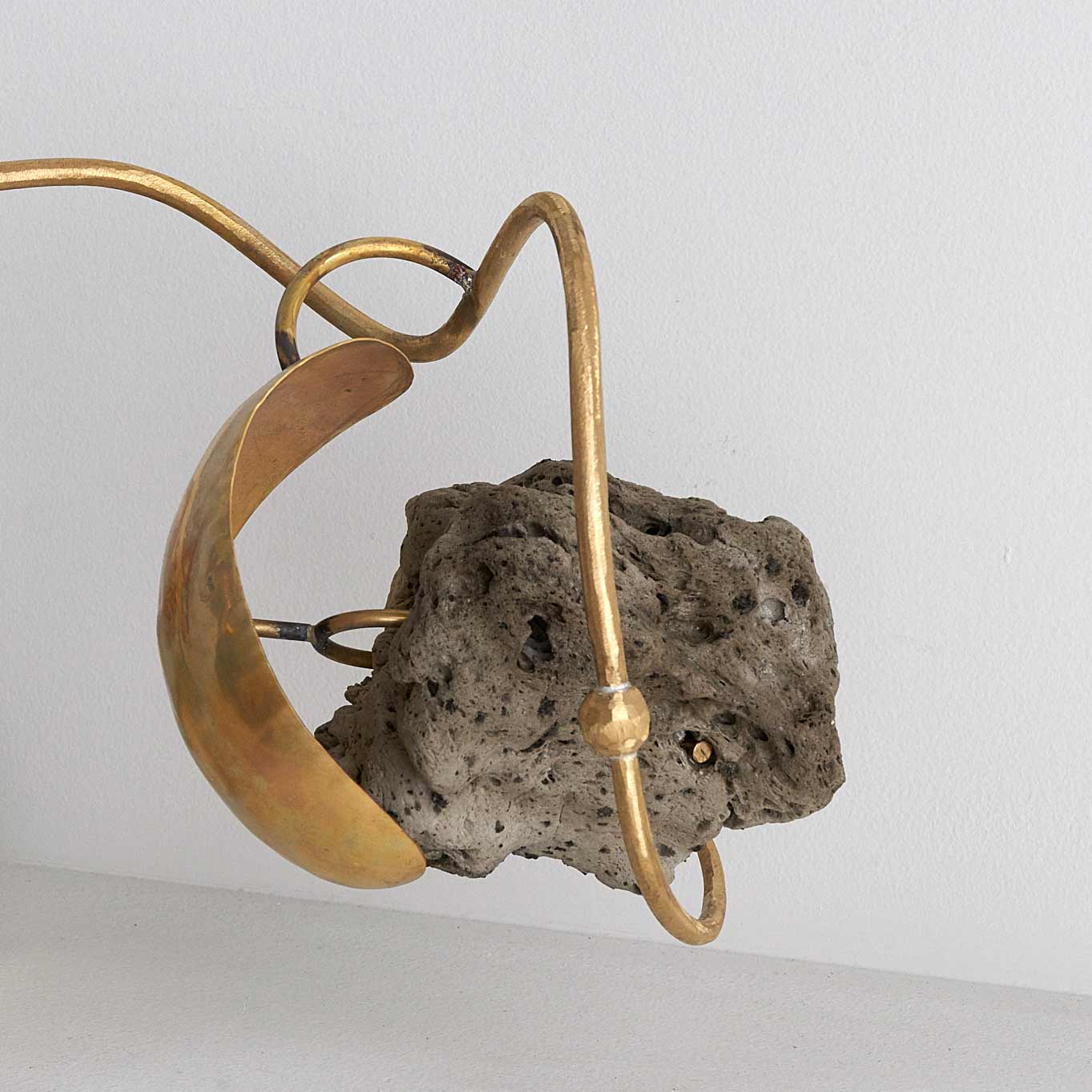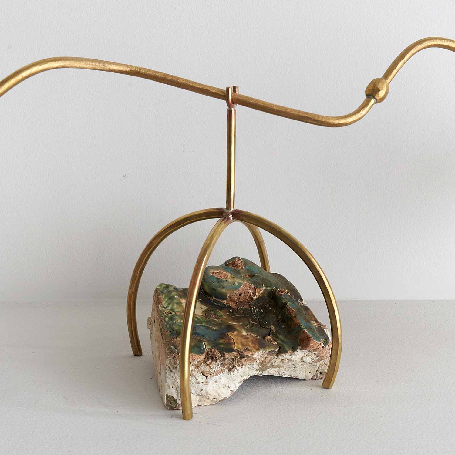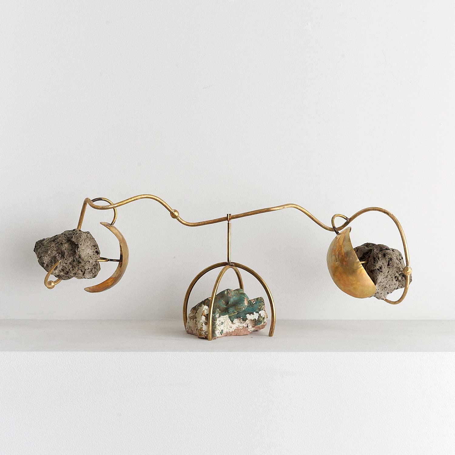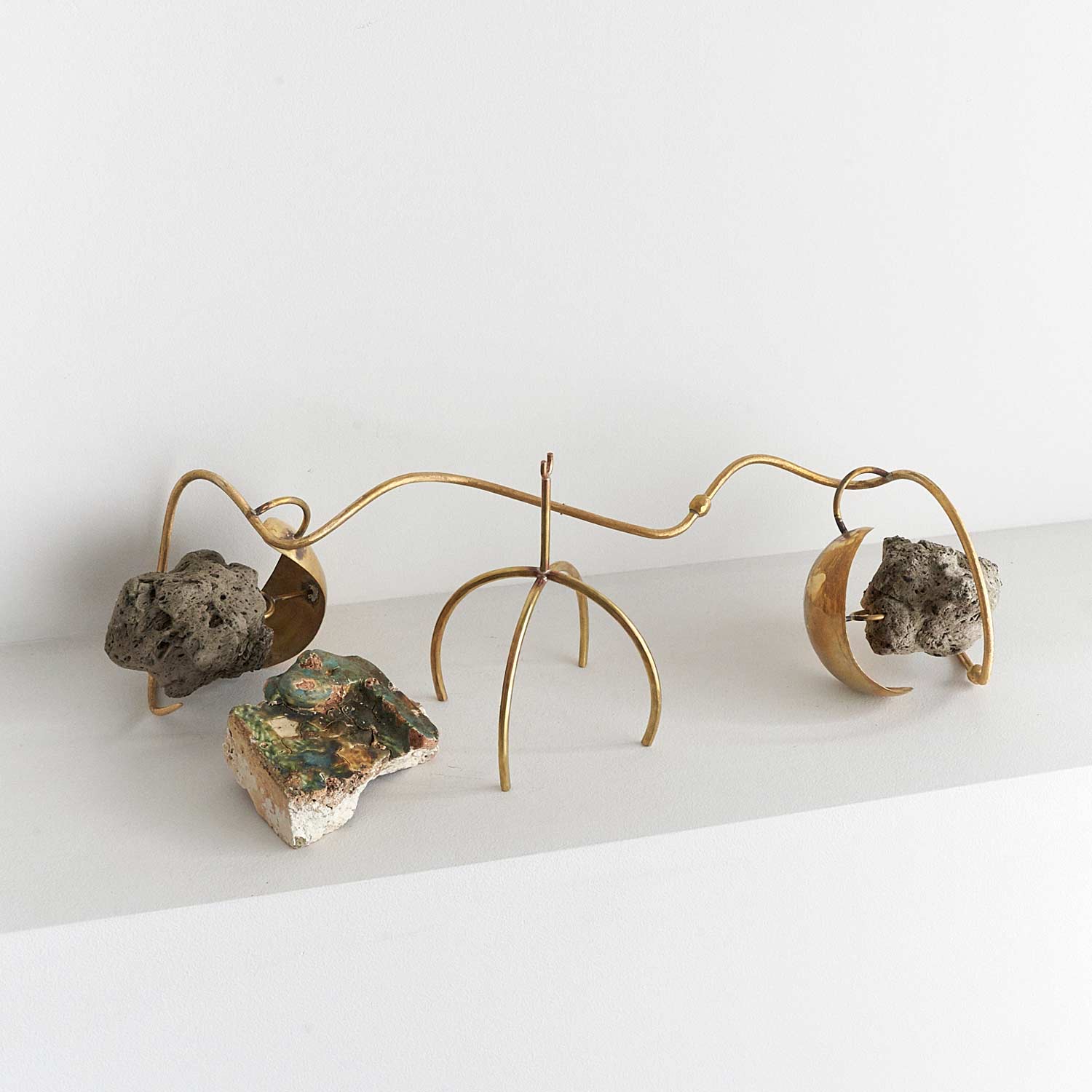 軽石2つをのせた秤のようなオブジェ作品です。均等を保つ緊張感が作品の魅力になっています。足部分には、深緑の釉薬が掛かった陶器の塊が配置されています。