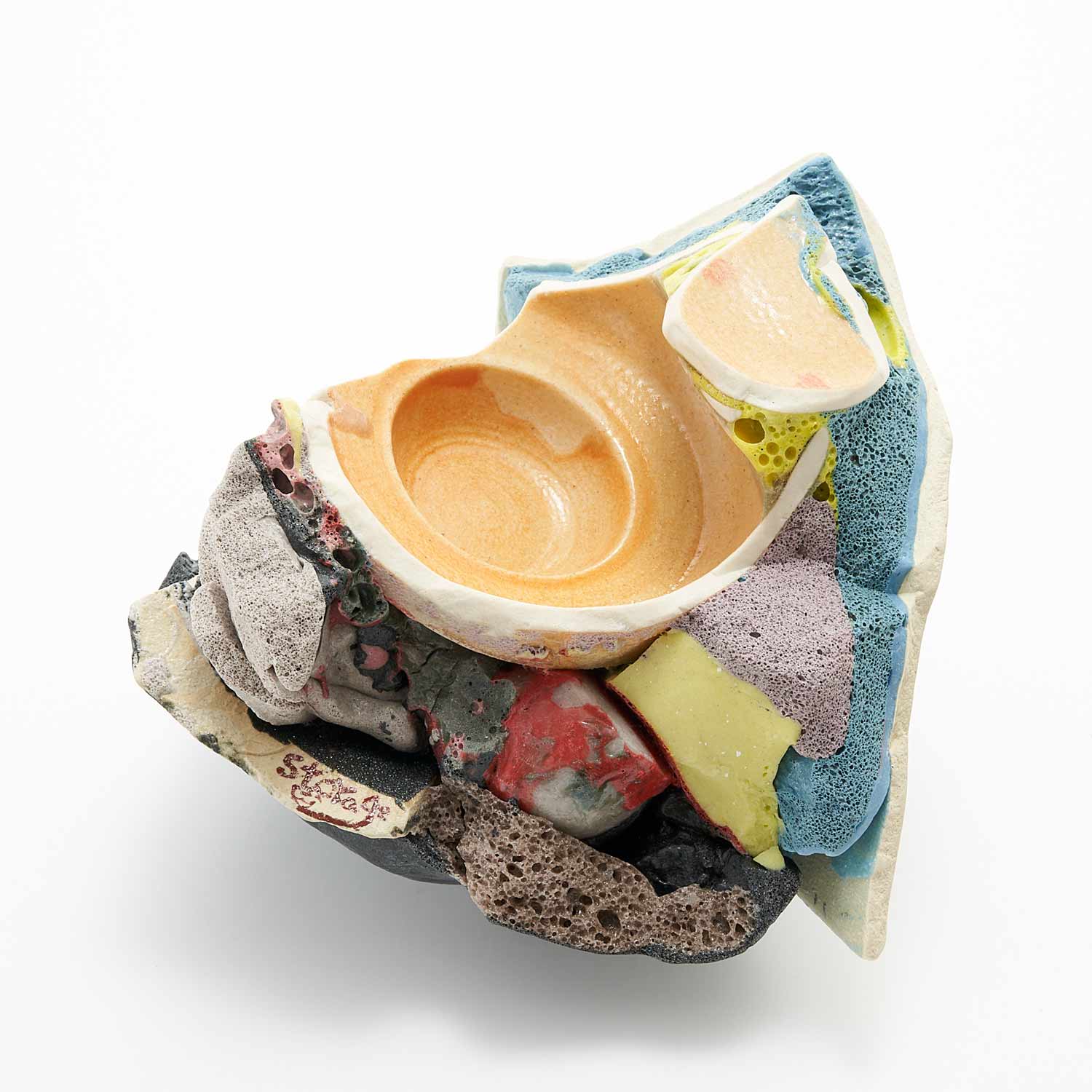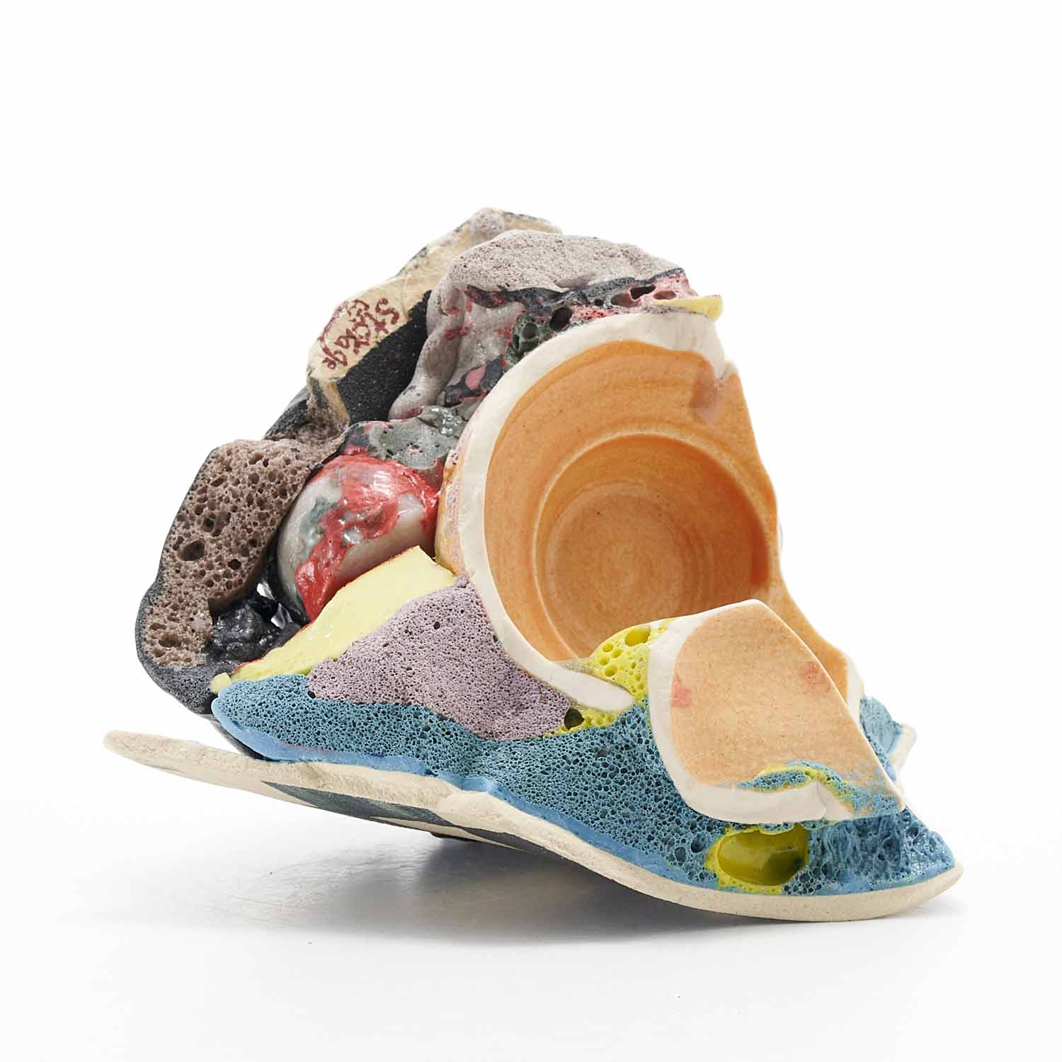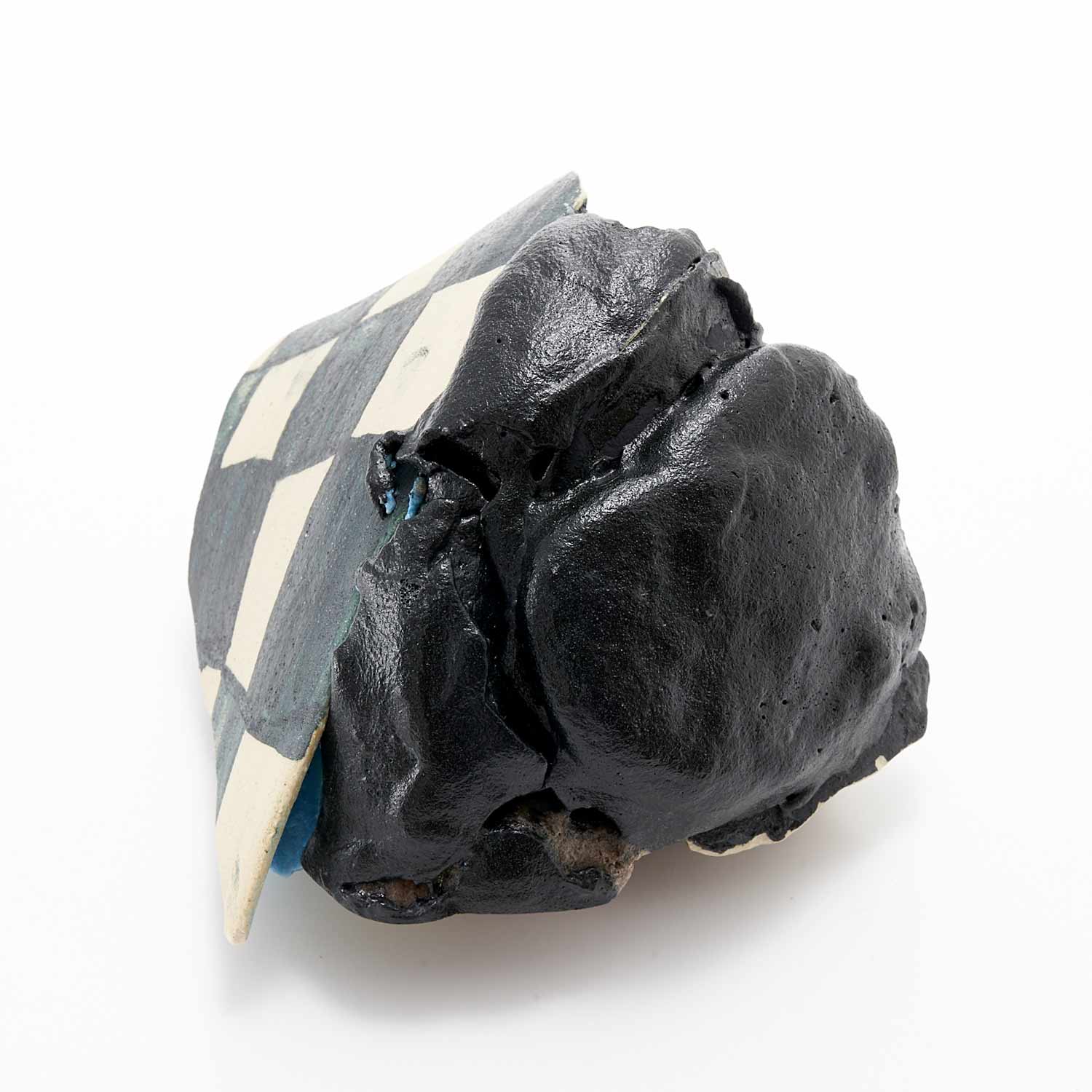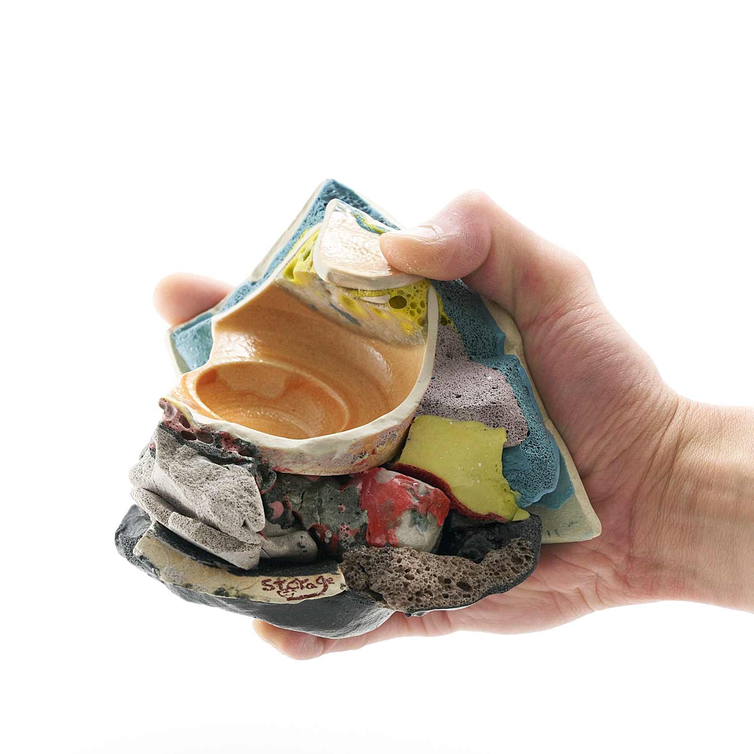 「地元のTV局、三陸ブロードネットの生放送中に壊した作品です。日常のカケラを混入させ、鉱物のような、器のような、不思議な質感の作品に仕上がりました。」釉薬や破片が複雑に重なり合った楽しい作品です。