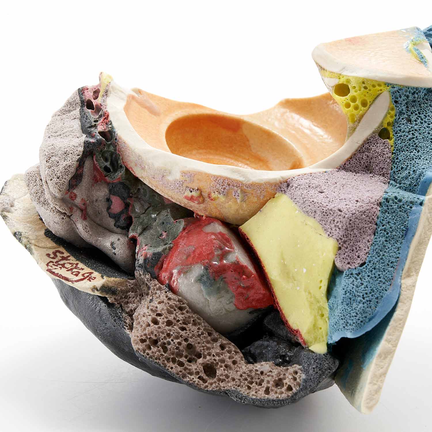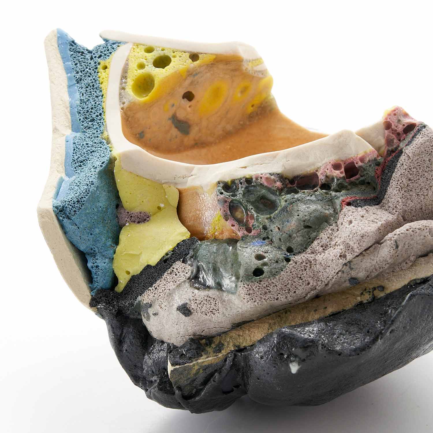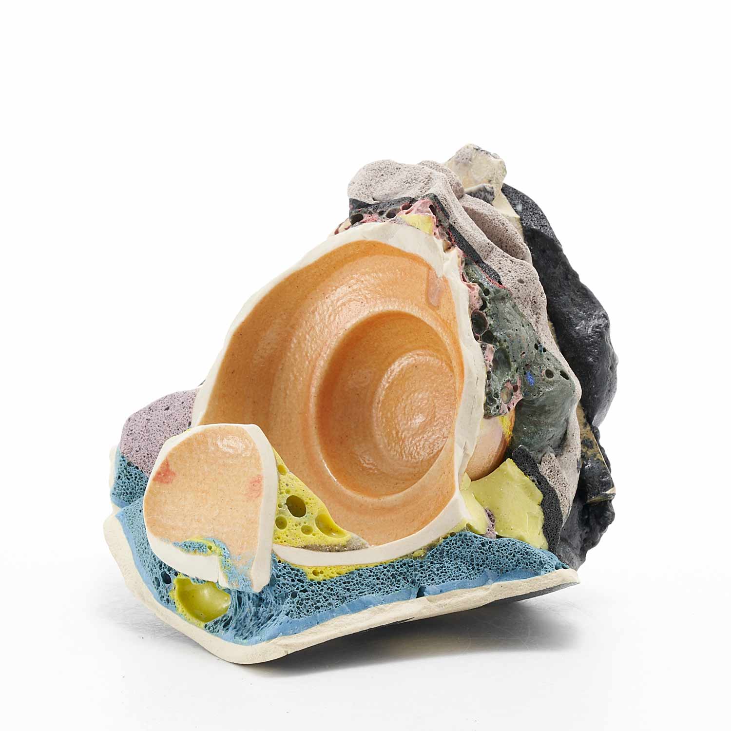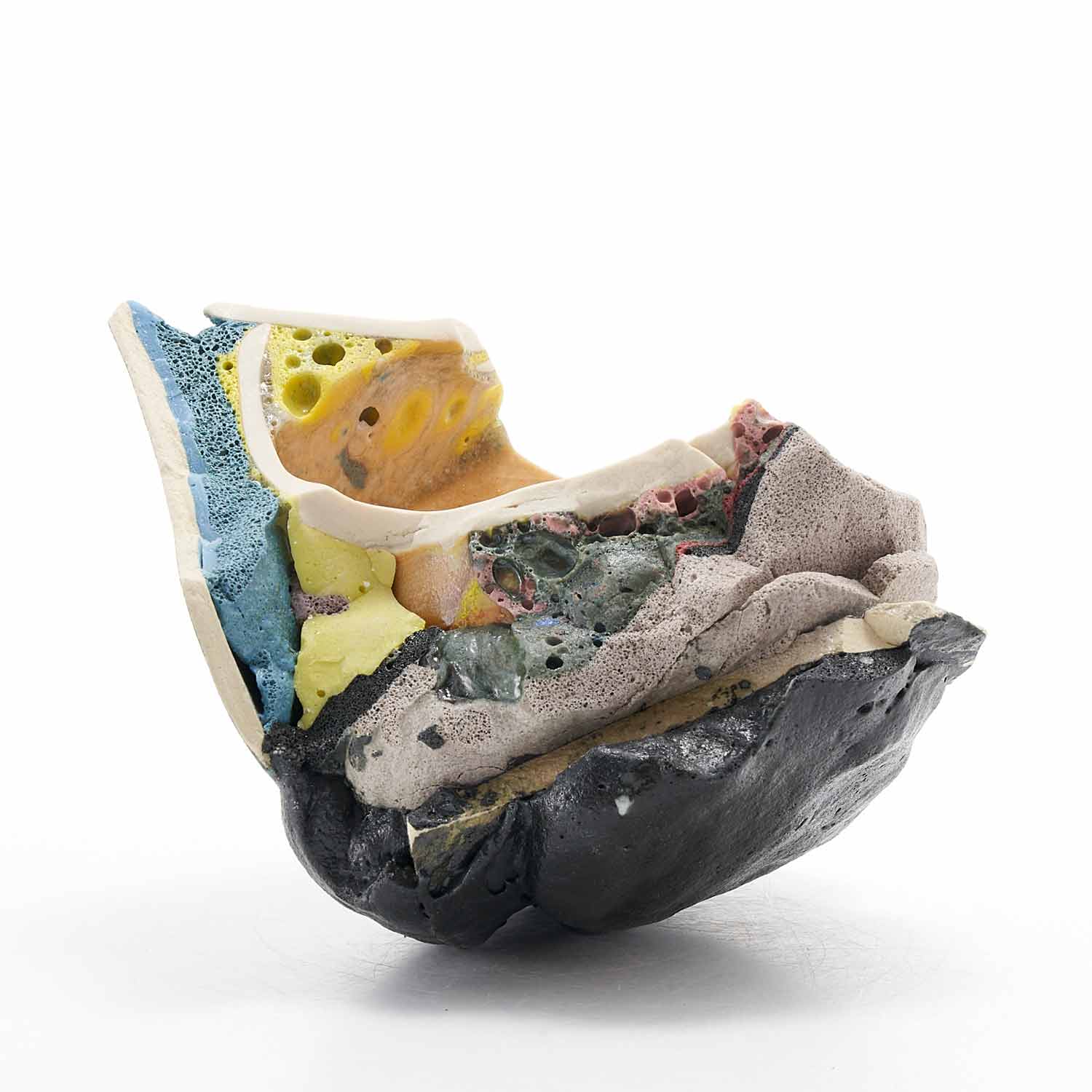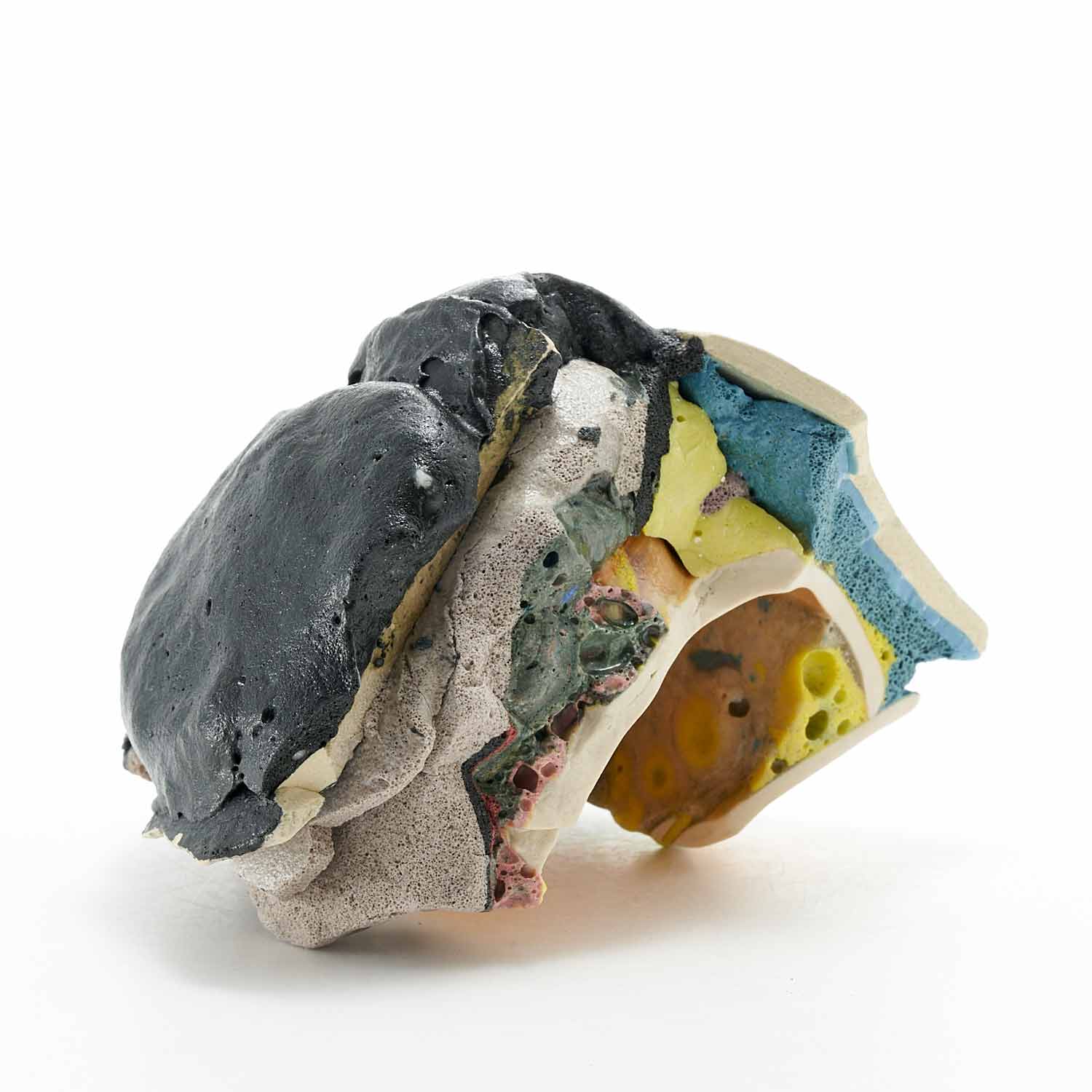 「地元のTV局、三陸ブロードネットの生放送中に壊した作品です。日常のカケラを混入させ、鉱物のような、器のような、不思議な質感の作品に仕上がりました。」釉薬や破片が複雑に重なり合った楽しい作品です。
