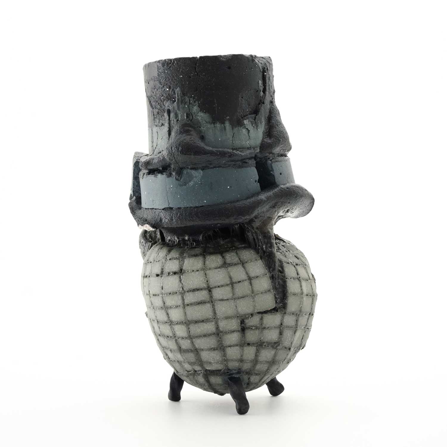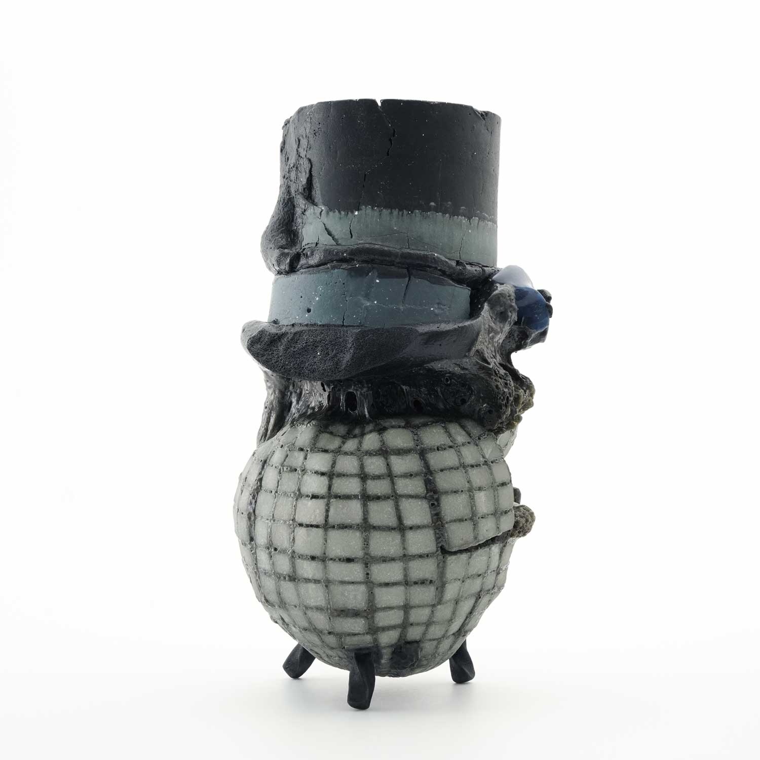 「土でできたいれものを釉薬で満たし、焼成中にいれものが内部から崩壊しその影響を上に乗る溶けない釉薬に伝わるように操作した作品です。真夜中のイメージ。」