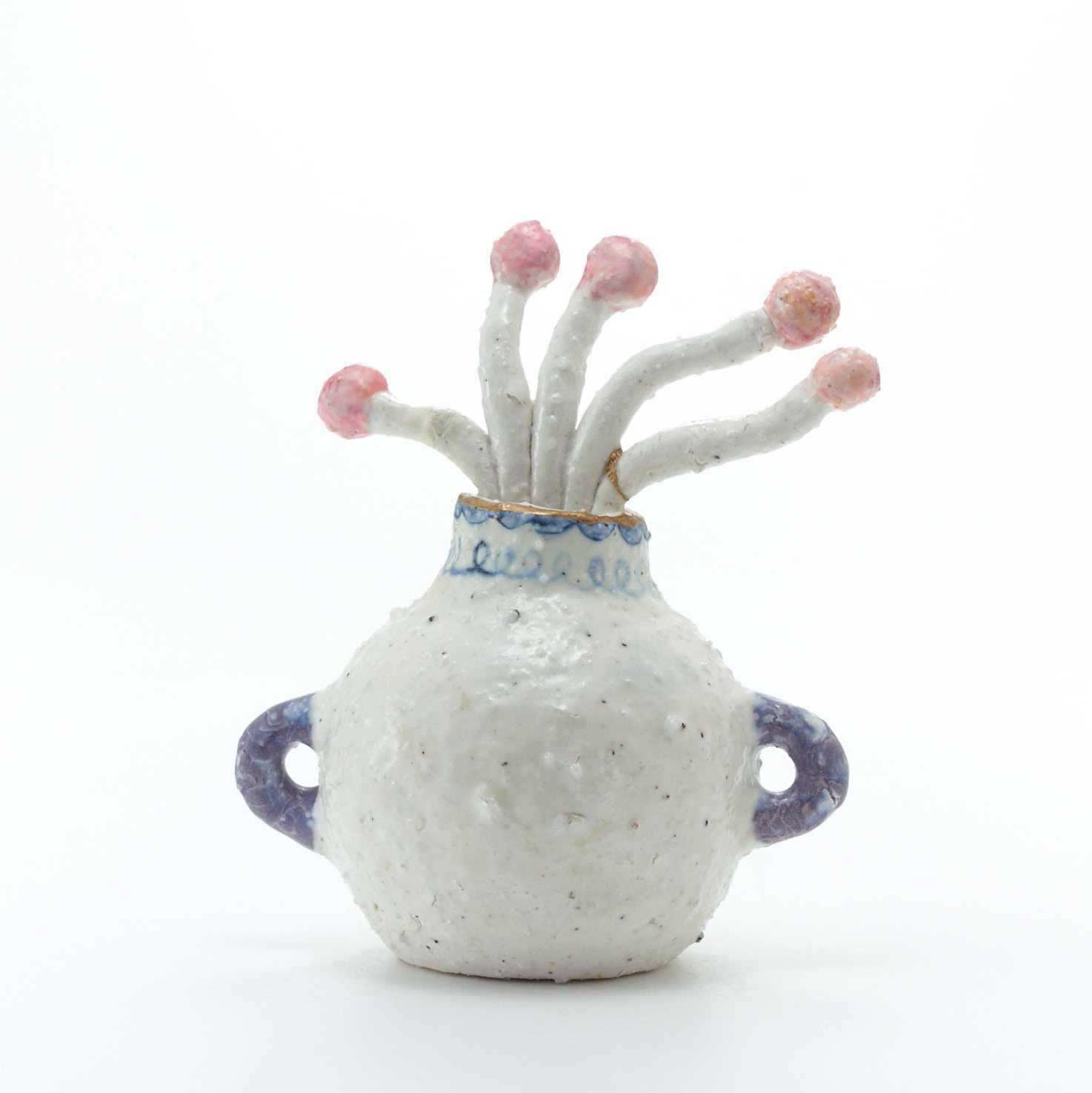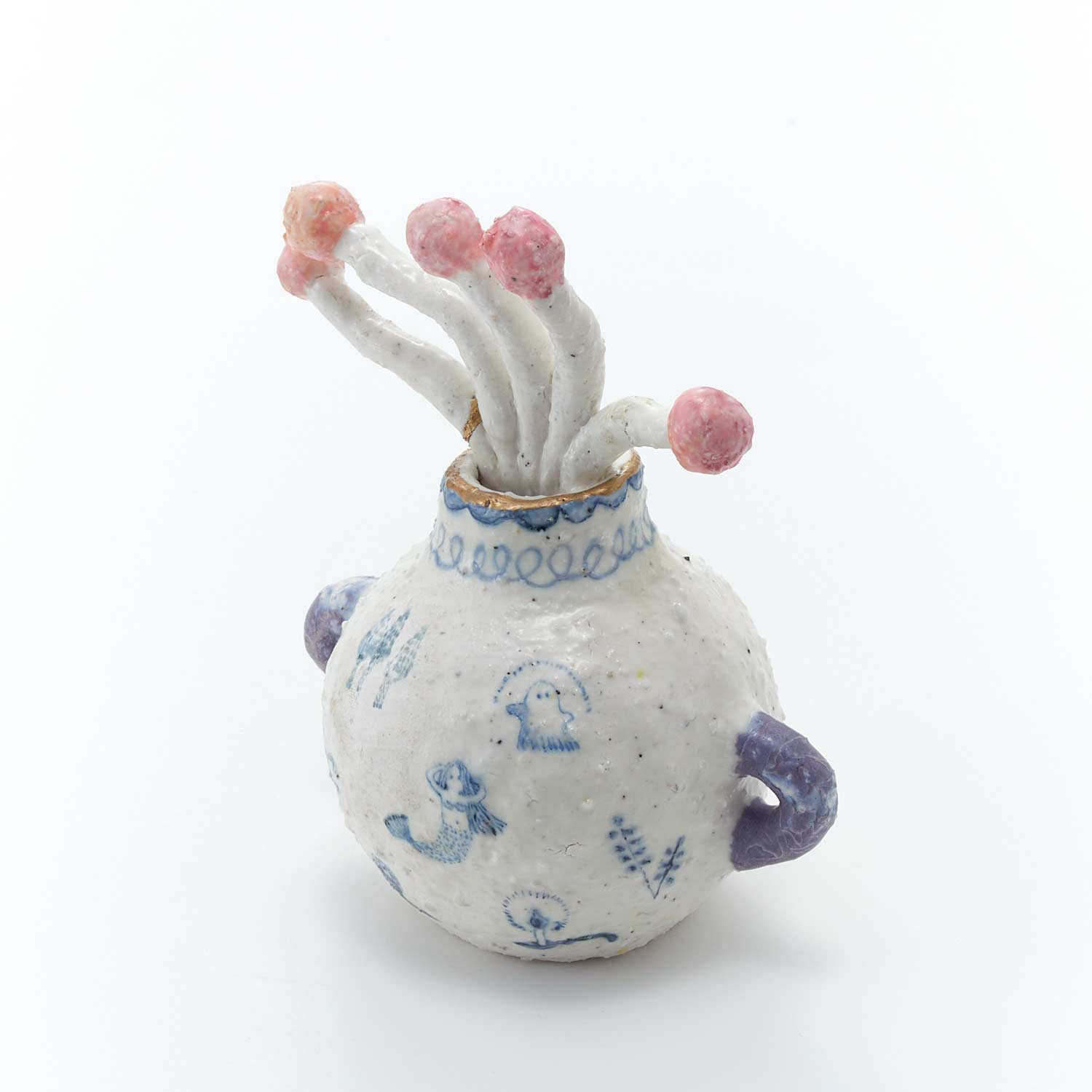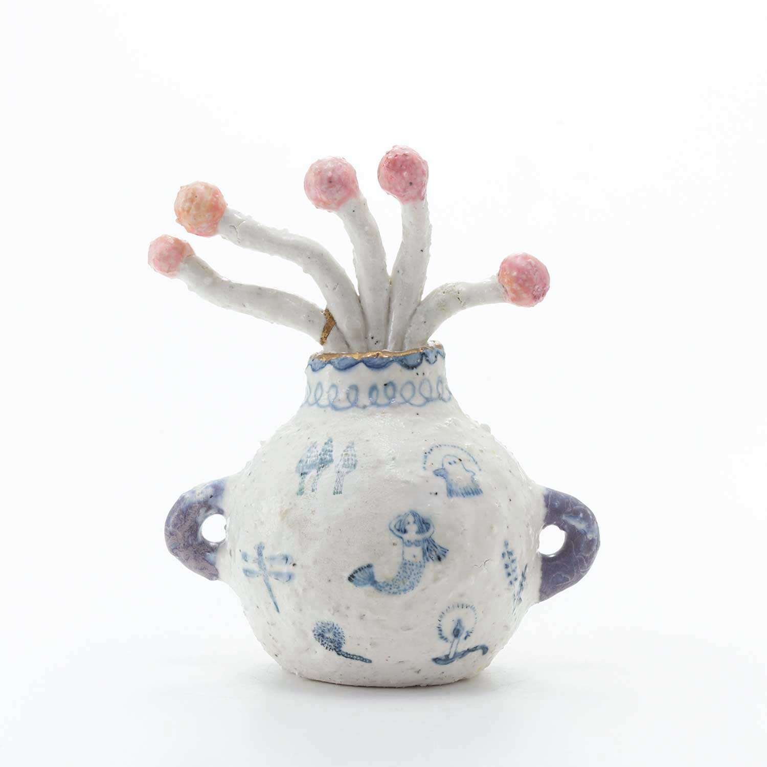 おばけや人魚、動物や植物が絵付けされた壺に赤い実の植物がニョロニョロと生けられています。壺の口には金彩が施されています。ややドライな質感と淡い色味が魅力。柔らかな空気感が漂います。
