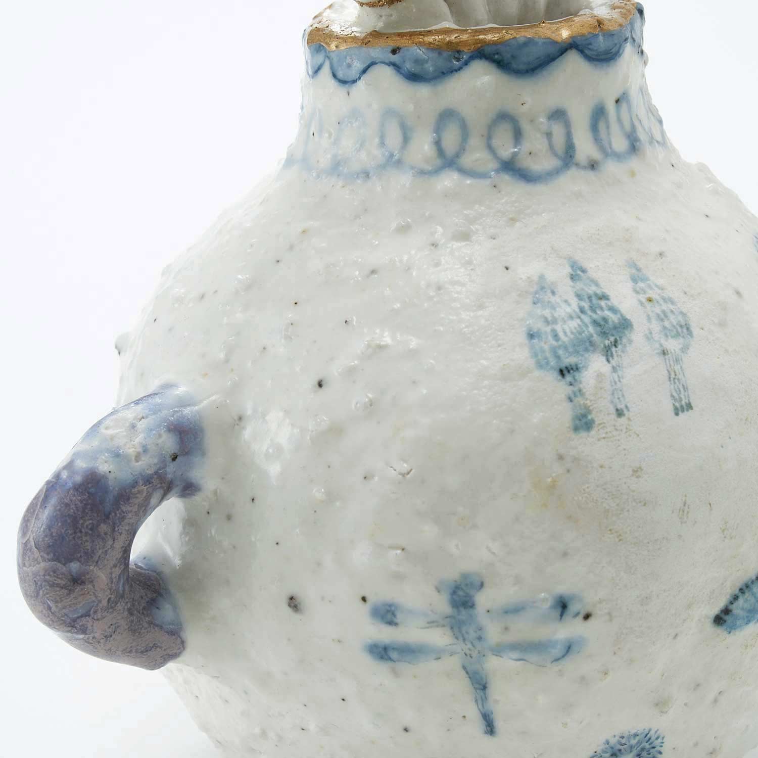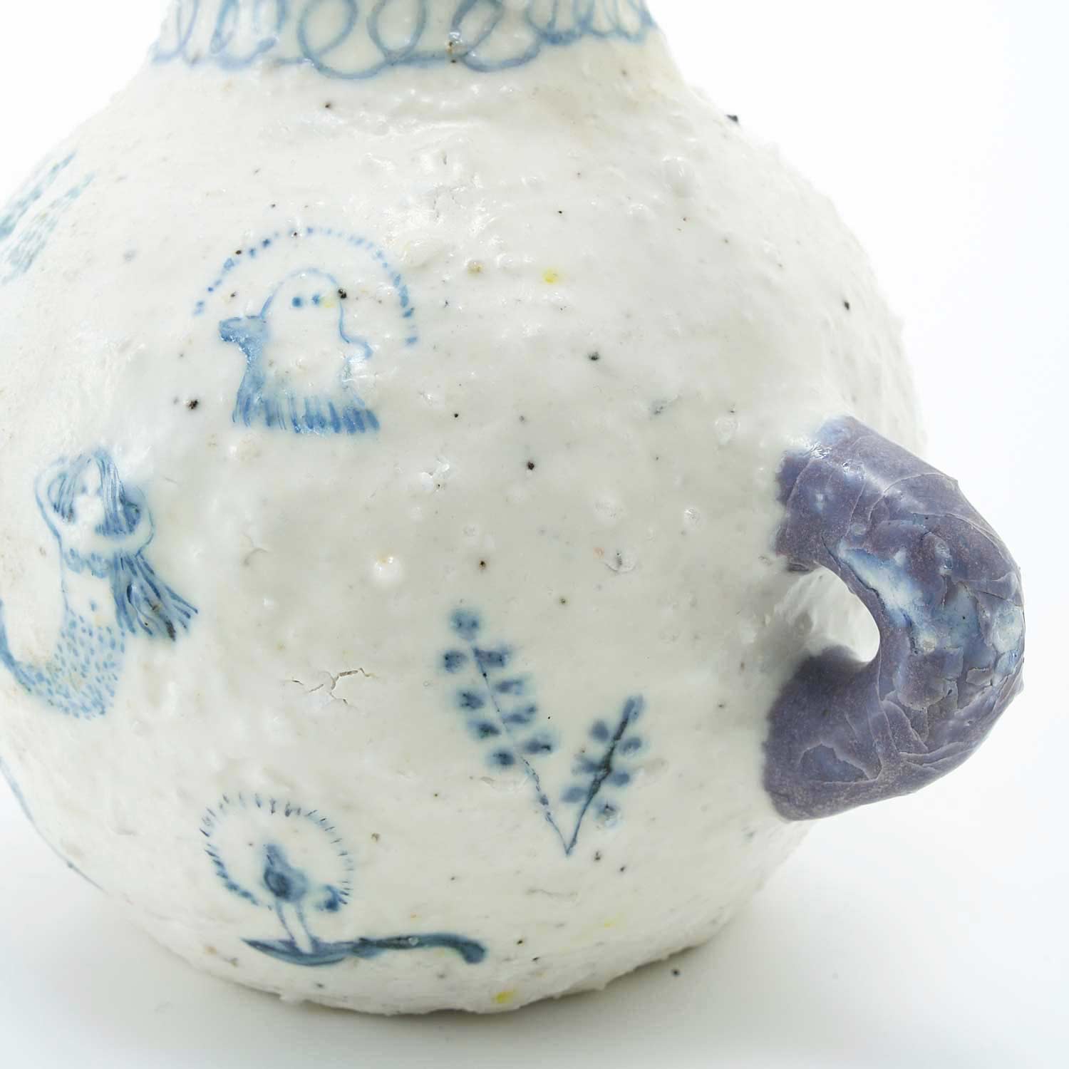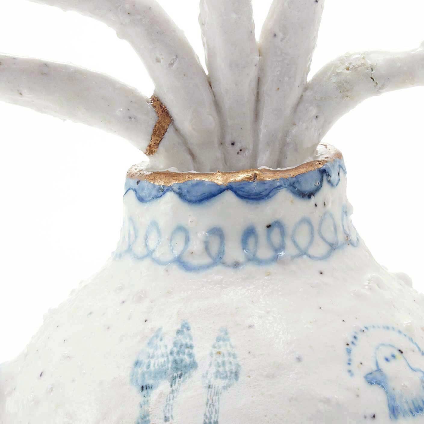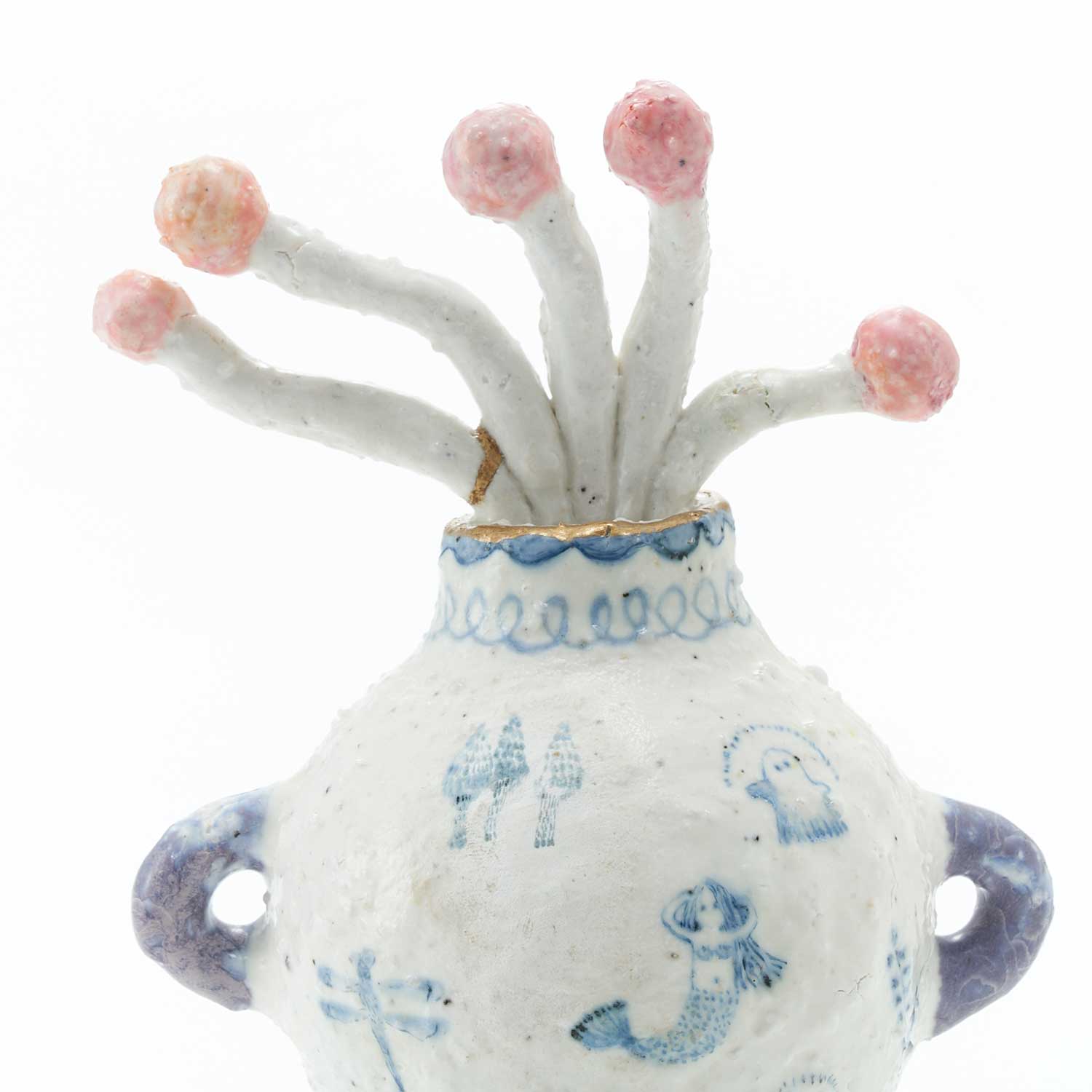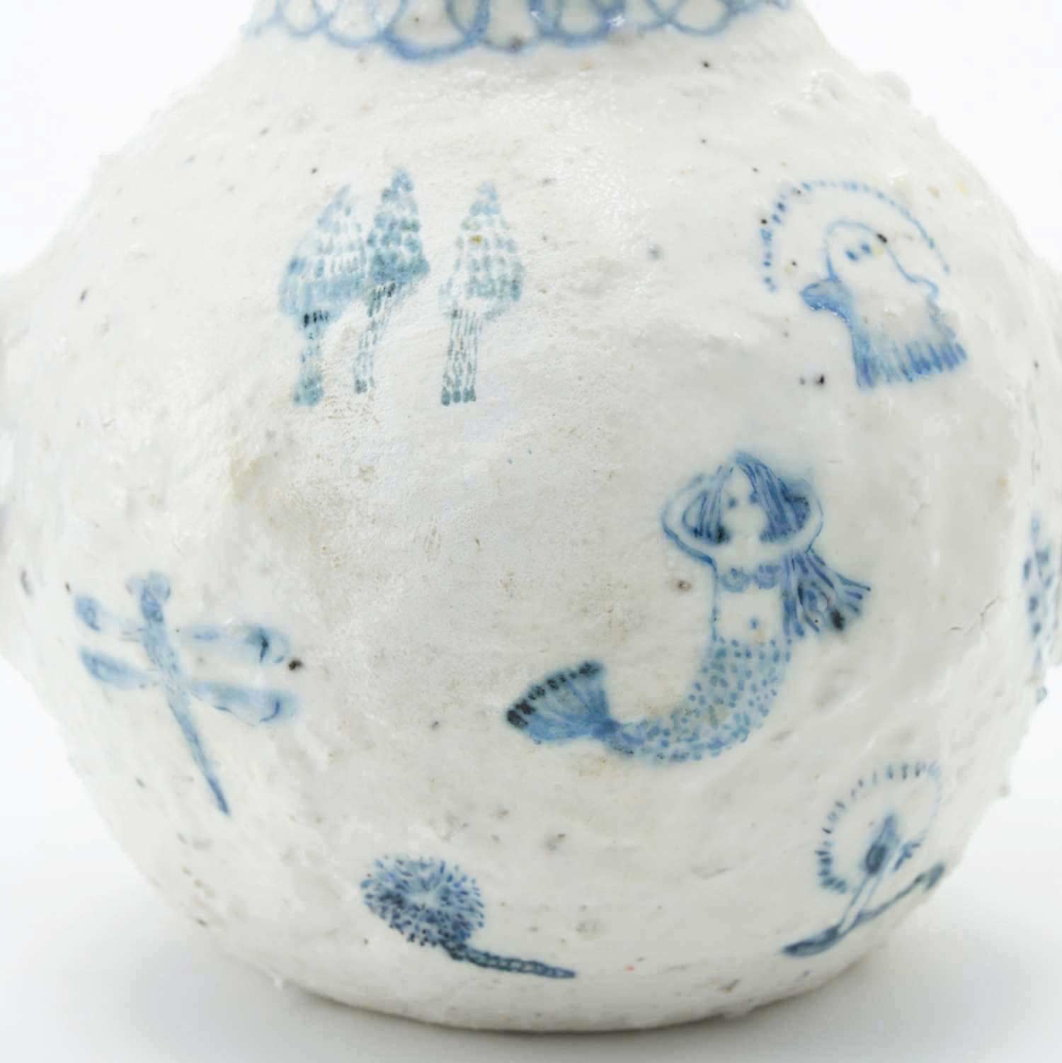 The vase is painted with ghosts, mermaids, animals, and plants, and is decorated with gnarled red berries. The mouth of the jar is gilded. The slightly dry texture and light colors are attractive. It has a soft, airy feel to it.