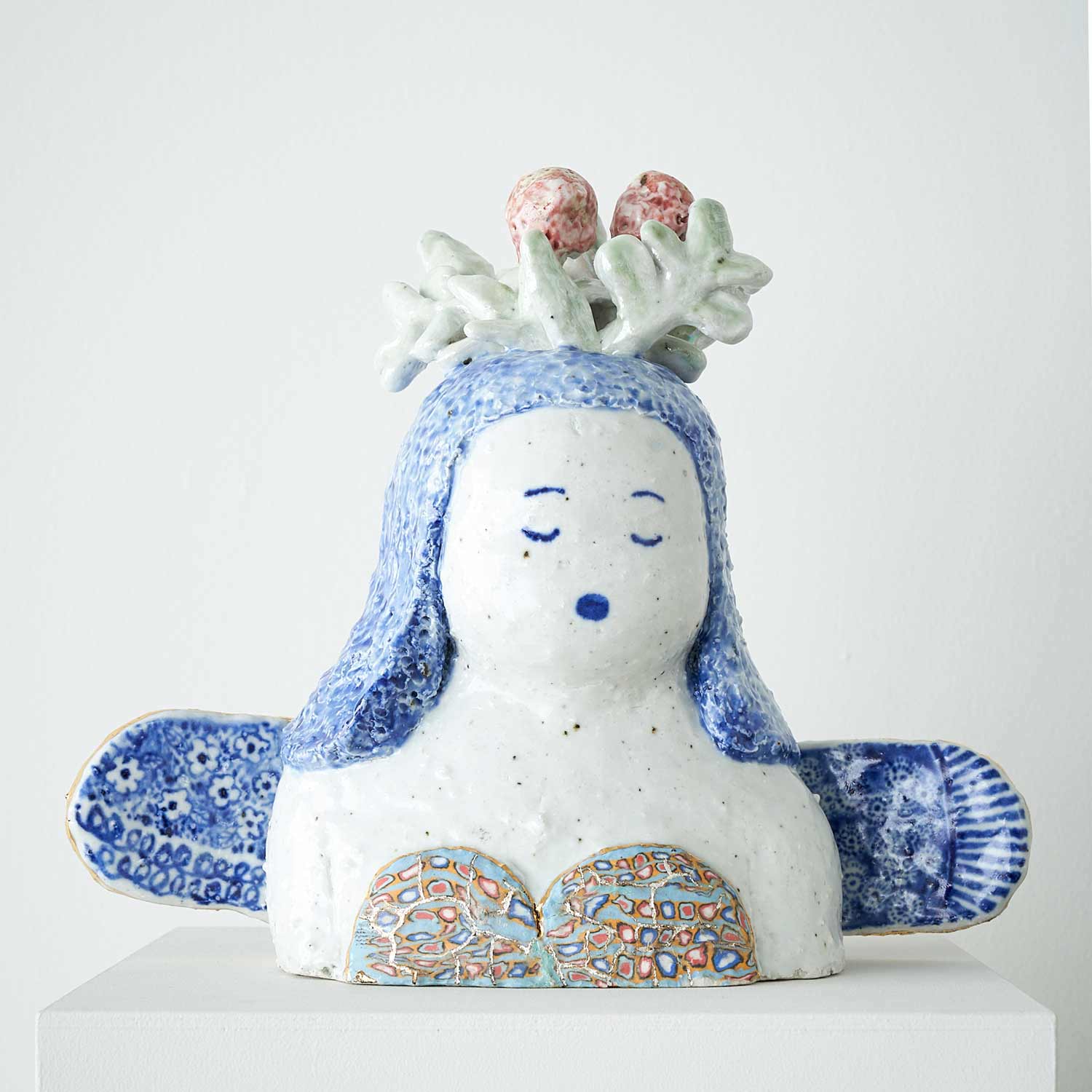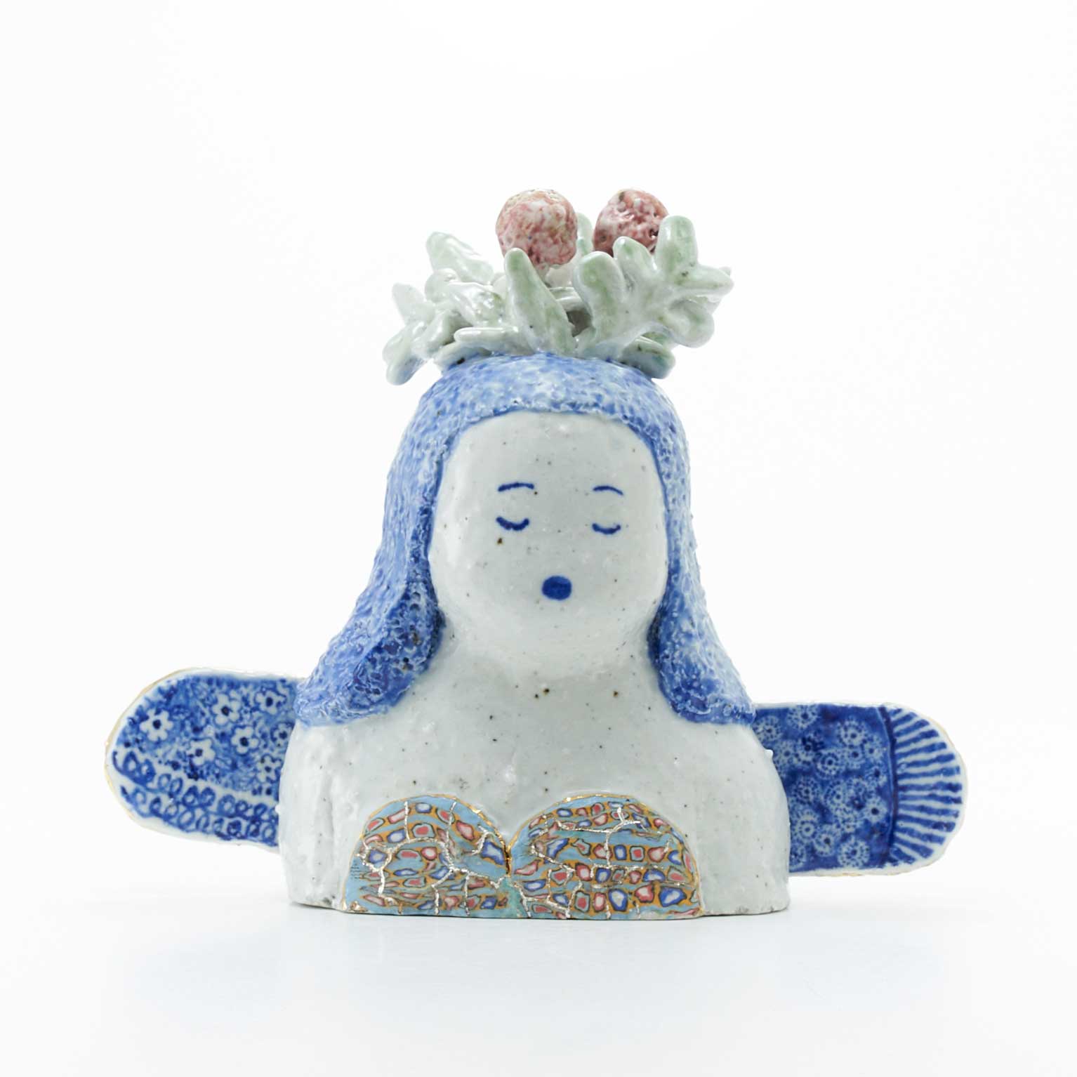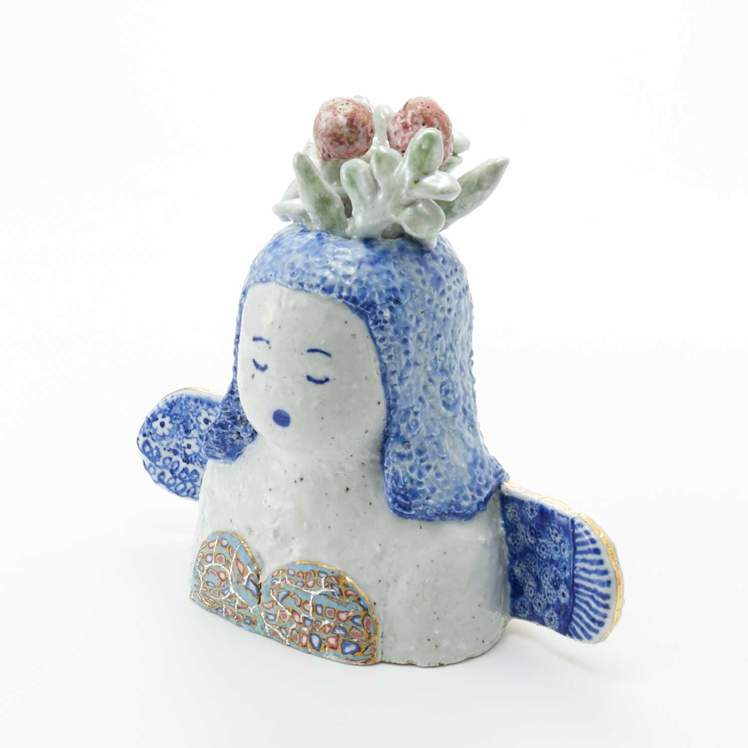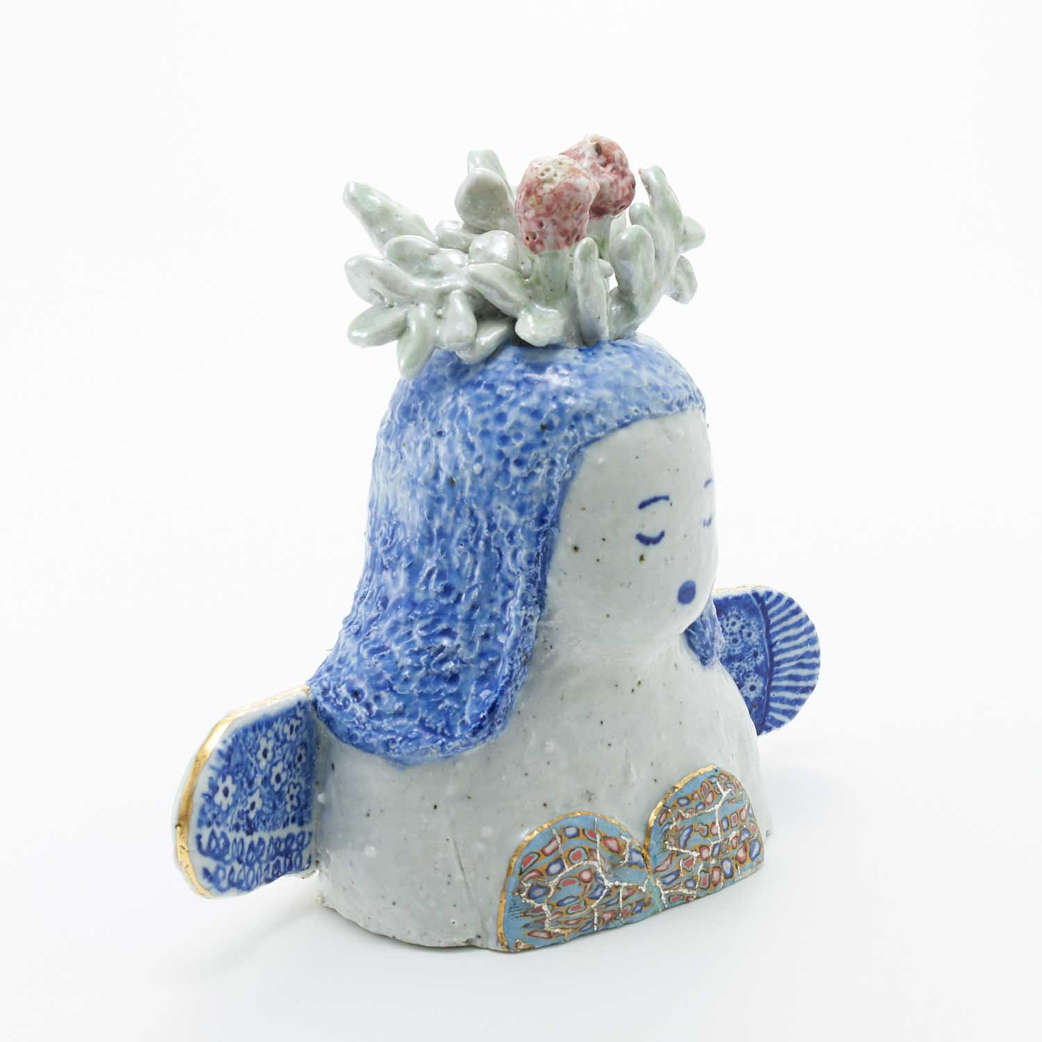 頭に花が生けられたお嬢さんです。羽部分には細かな紋様が呉須で描かれています。くつろいだ表情とカラフルな練り込みの上に金・銀彩が施された水着がかわいい作品です。