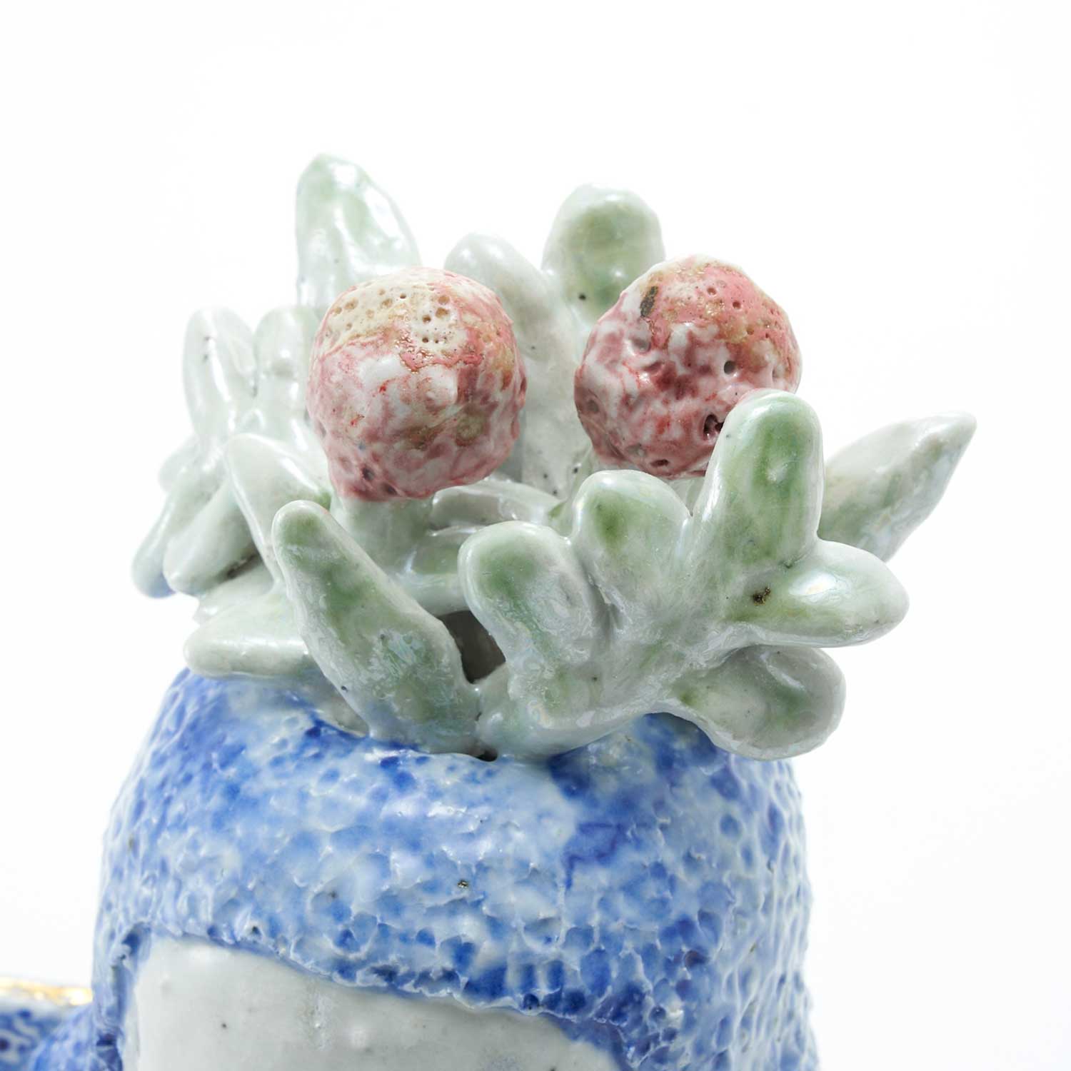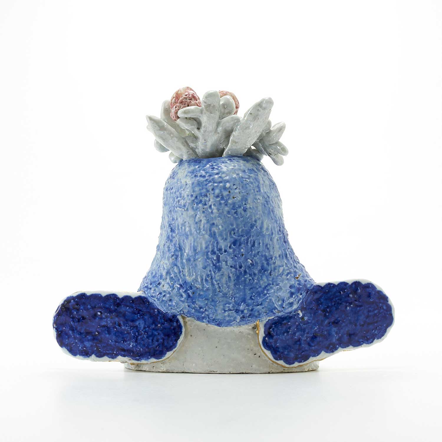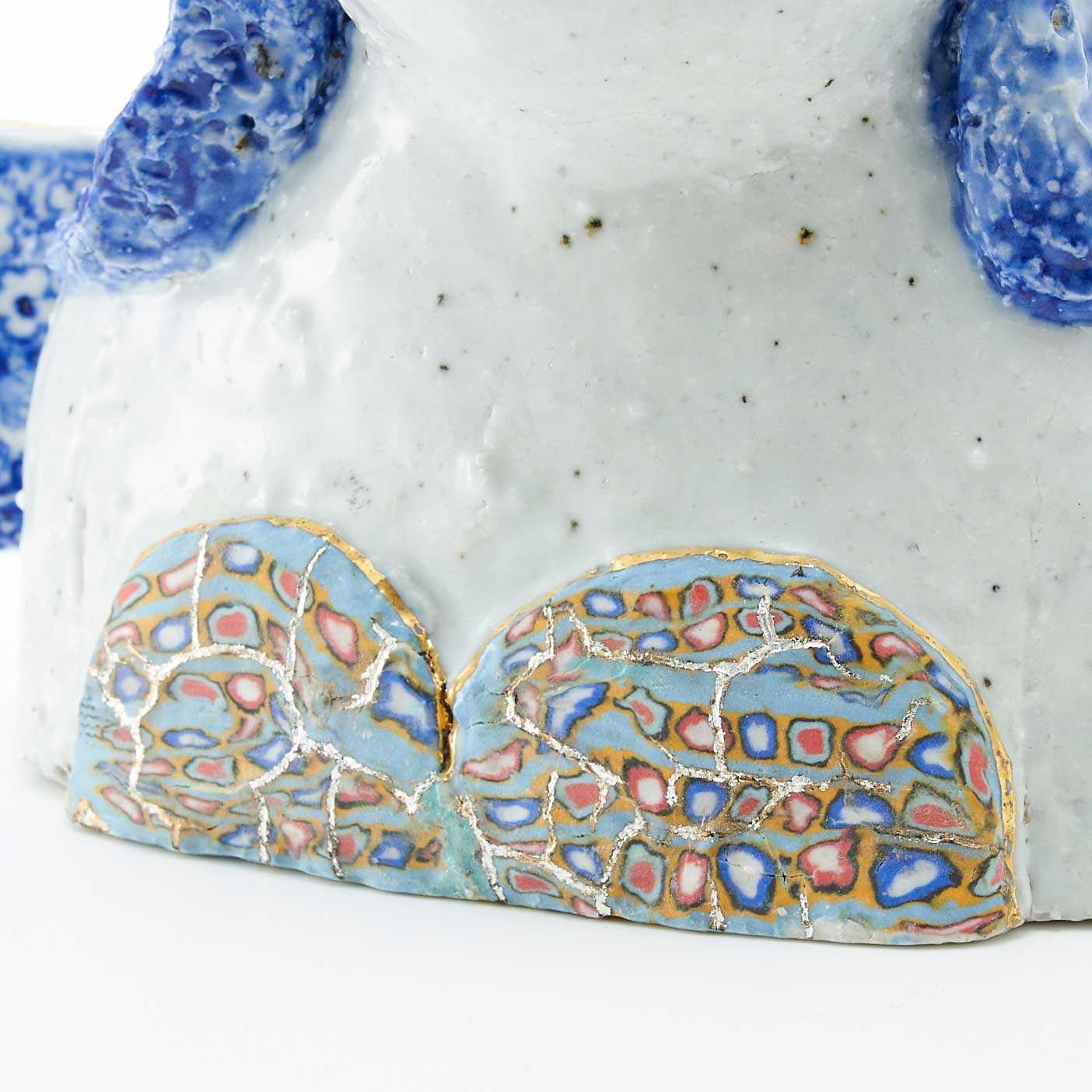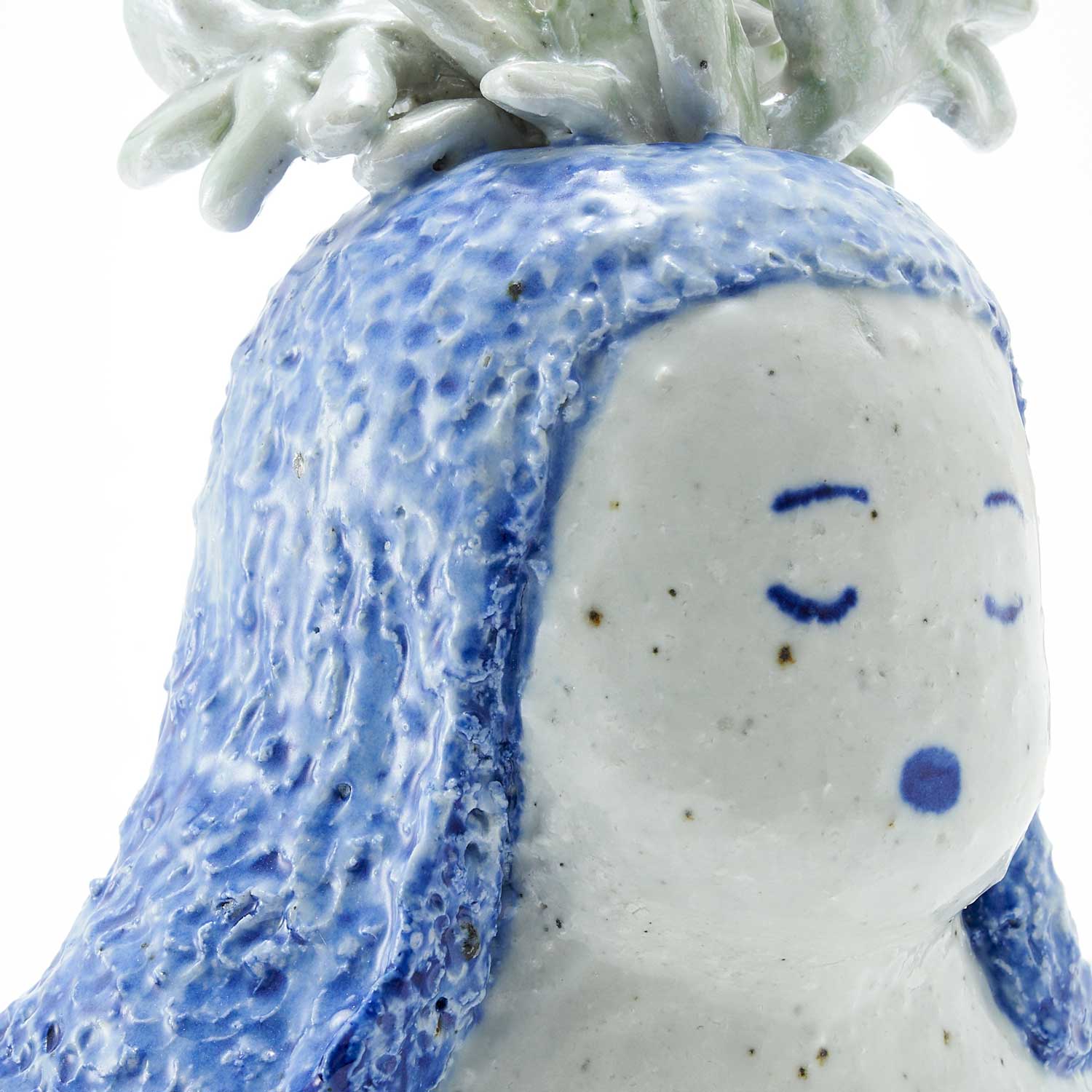 頭に花が生けられたお嬢さんです。羽部分には細かな紋様が呉須で描かれています。くつろいだ表情とカラフルな練り込みの上に金・銀彩が施された水着がかわいい作品です。