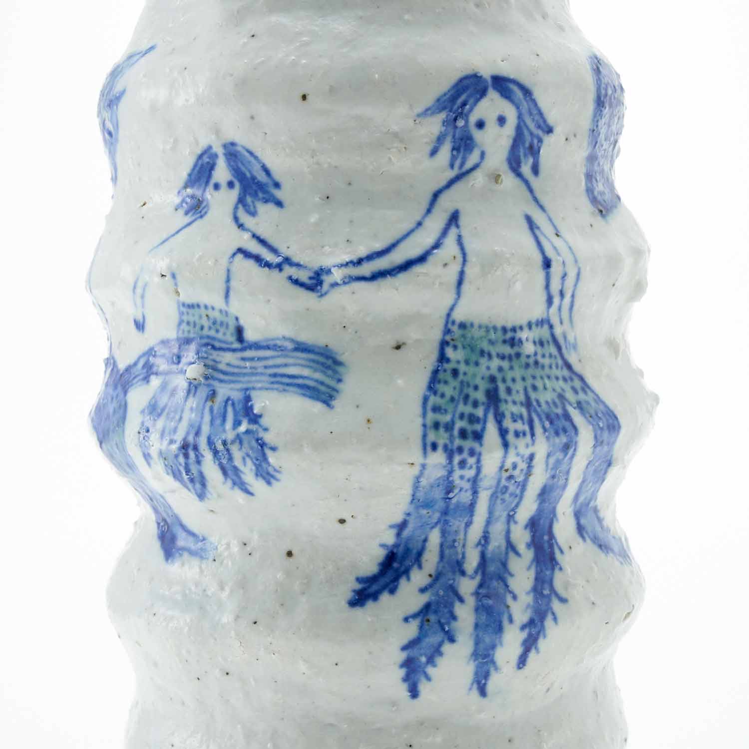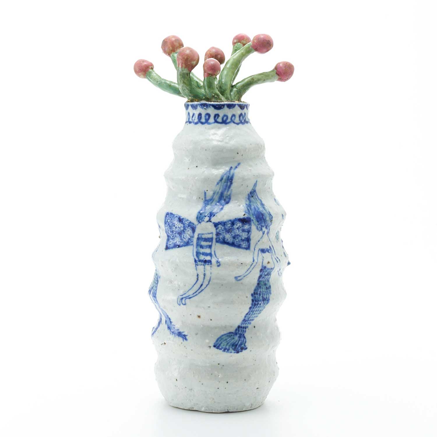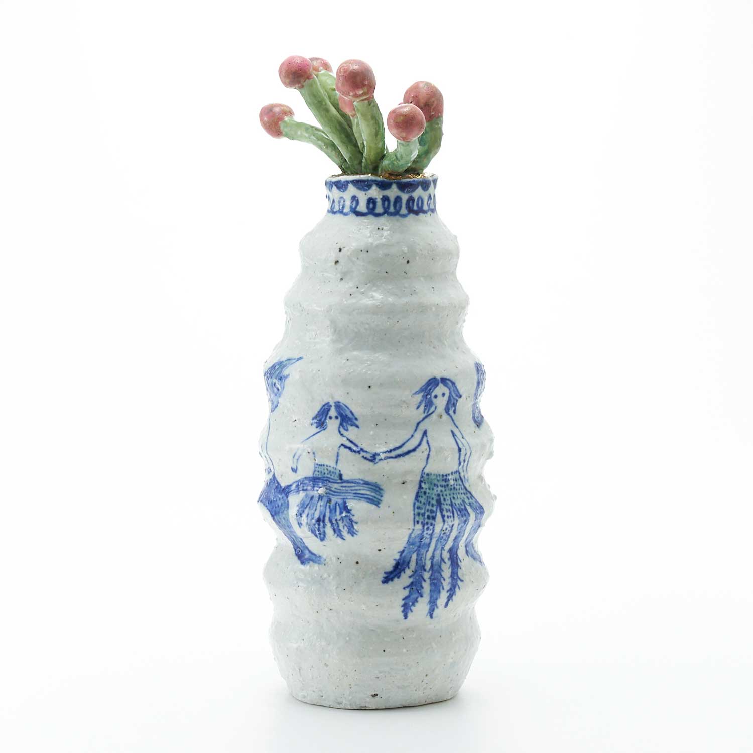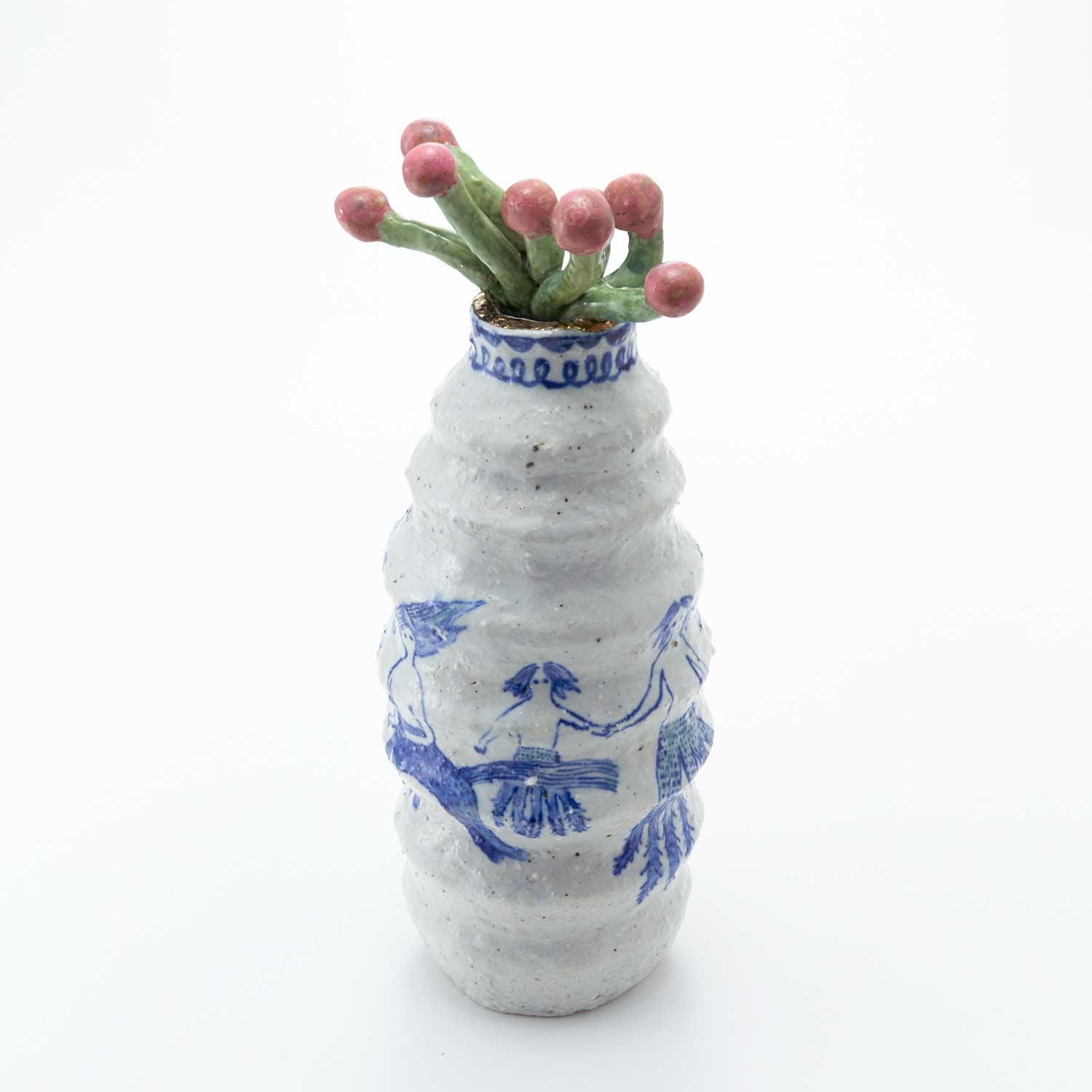 ピンクの実をつけた植物を生けた花瓶です。花瓶部分はゴスで、羽が生えたり、下半身が動物になっていたり、根っこになっていたりしている人たちが描かれています。不思議で愛らしい作品です。