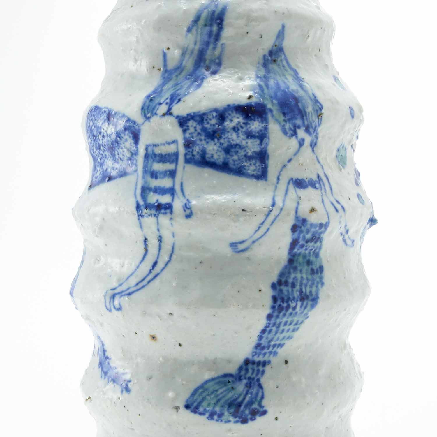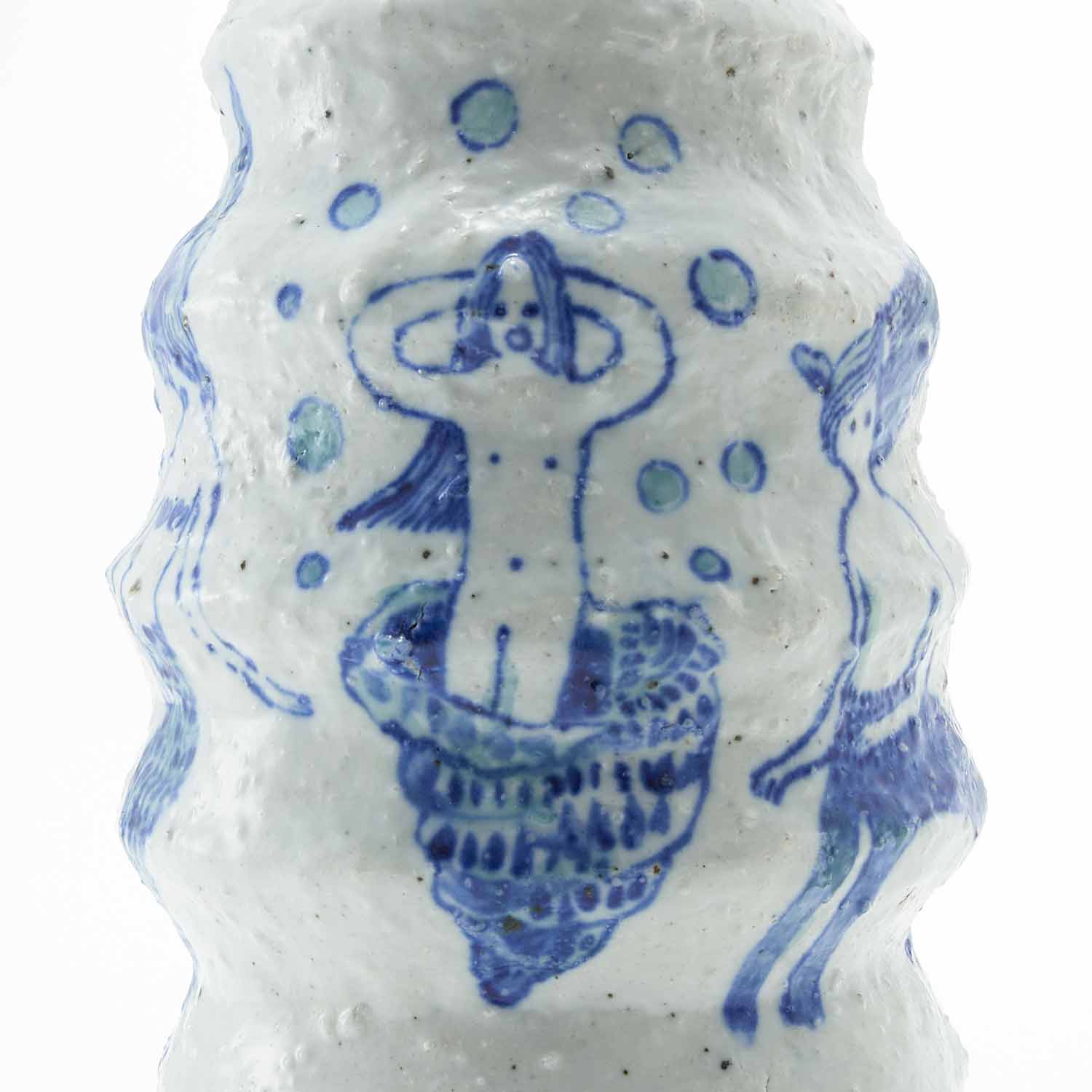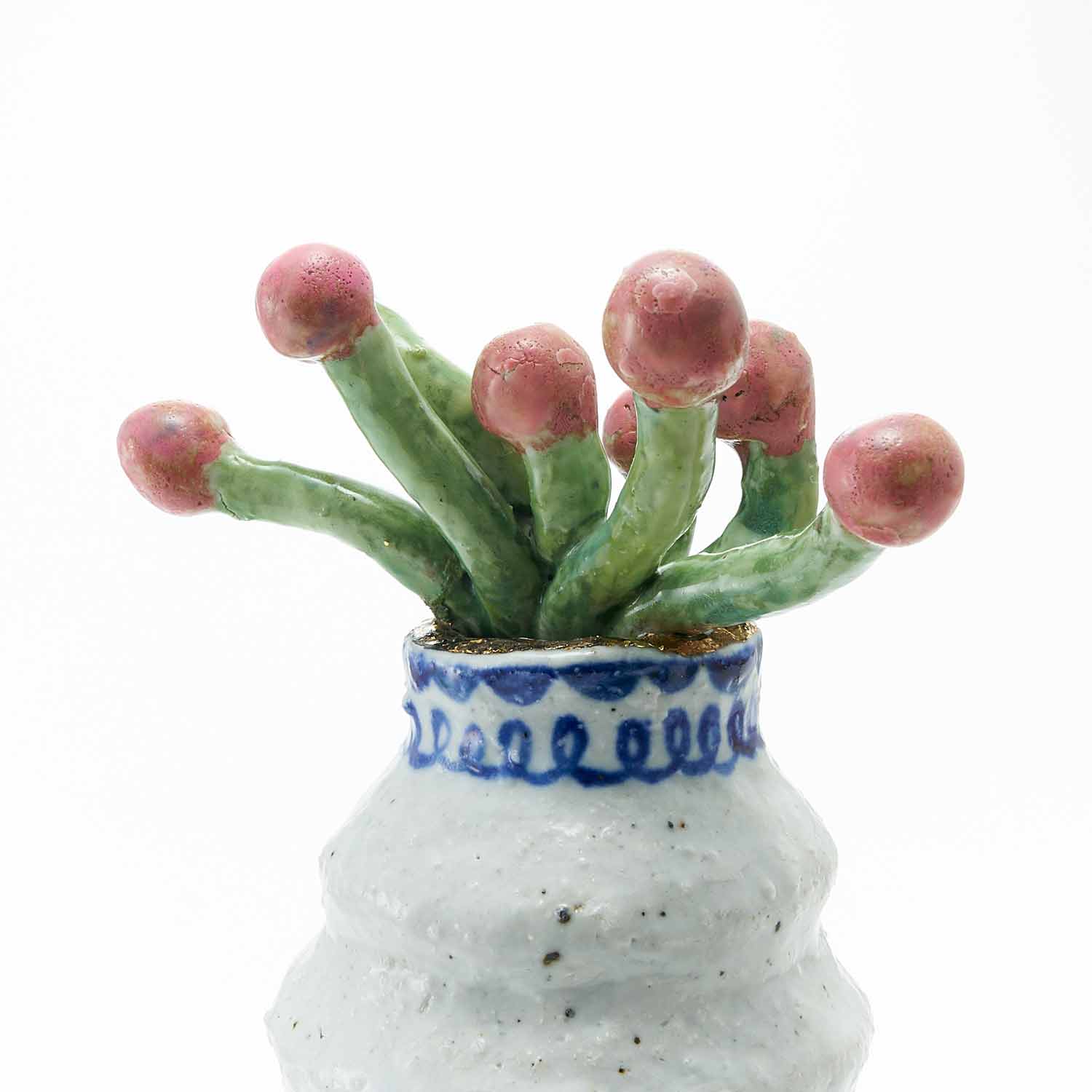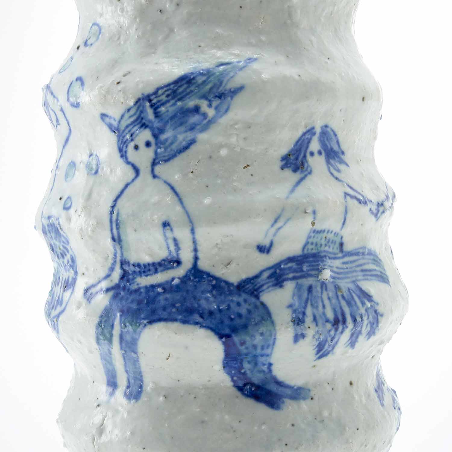 ピンクの実をつけた植物を生けた花瓶です。花瓶部分はゴスで、羽が生えたり、下半身が動物になっていたり、根っこになっていたりしている人たちが描かれています。不思議で愛らしい作品です。