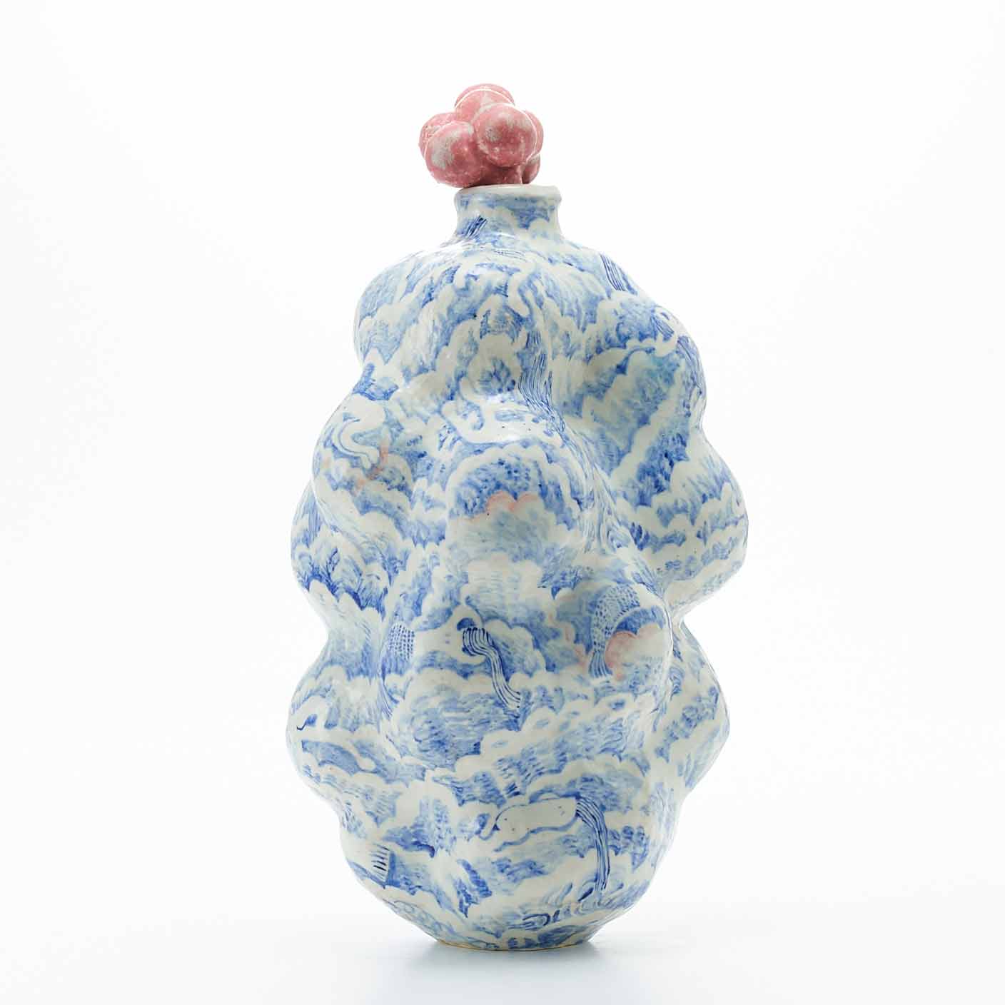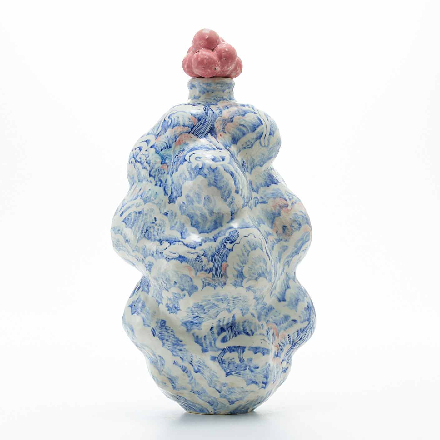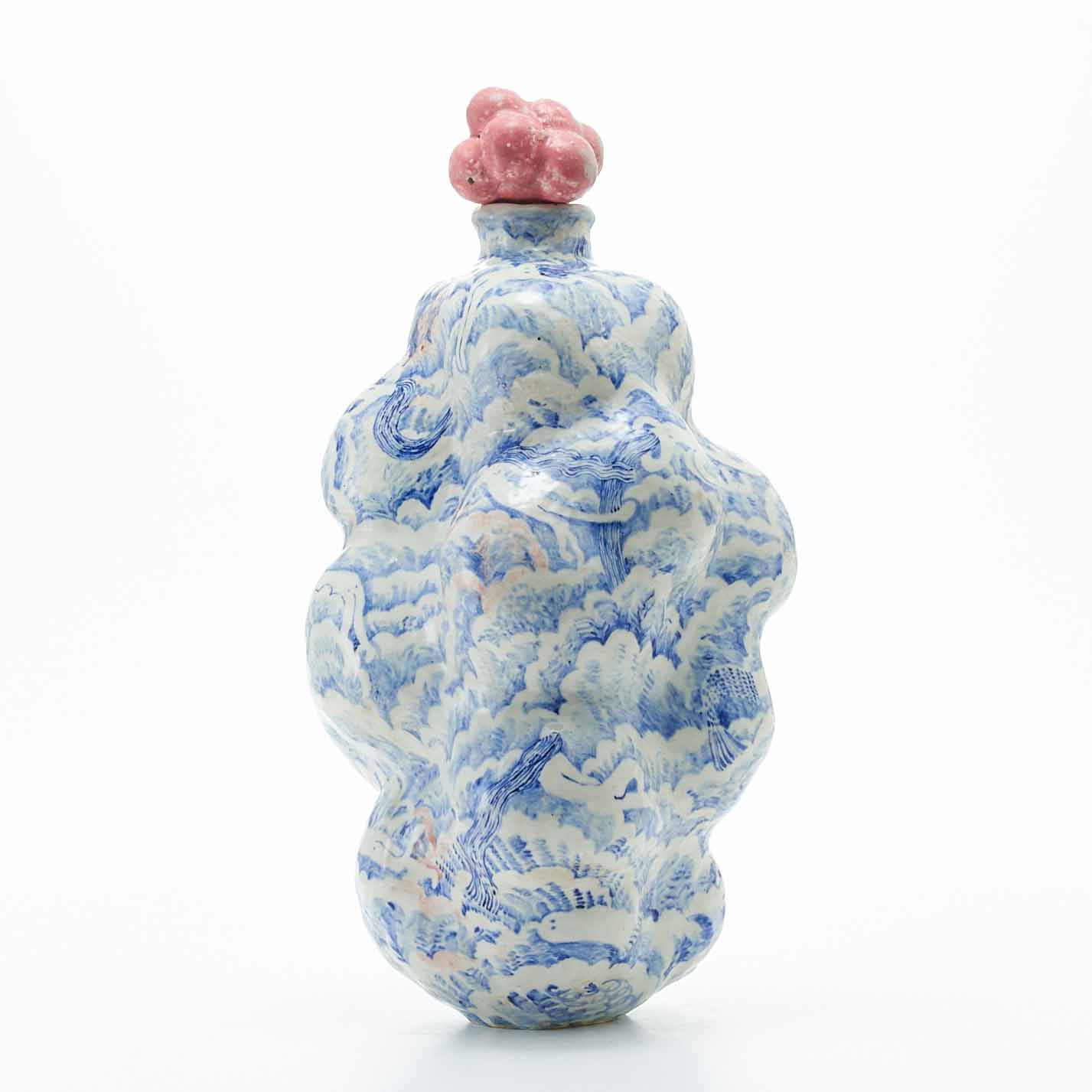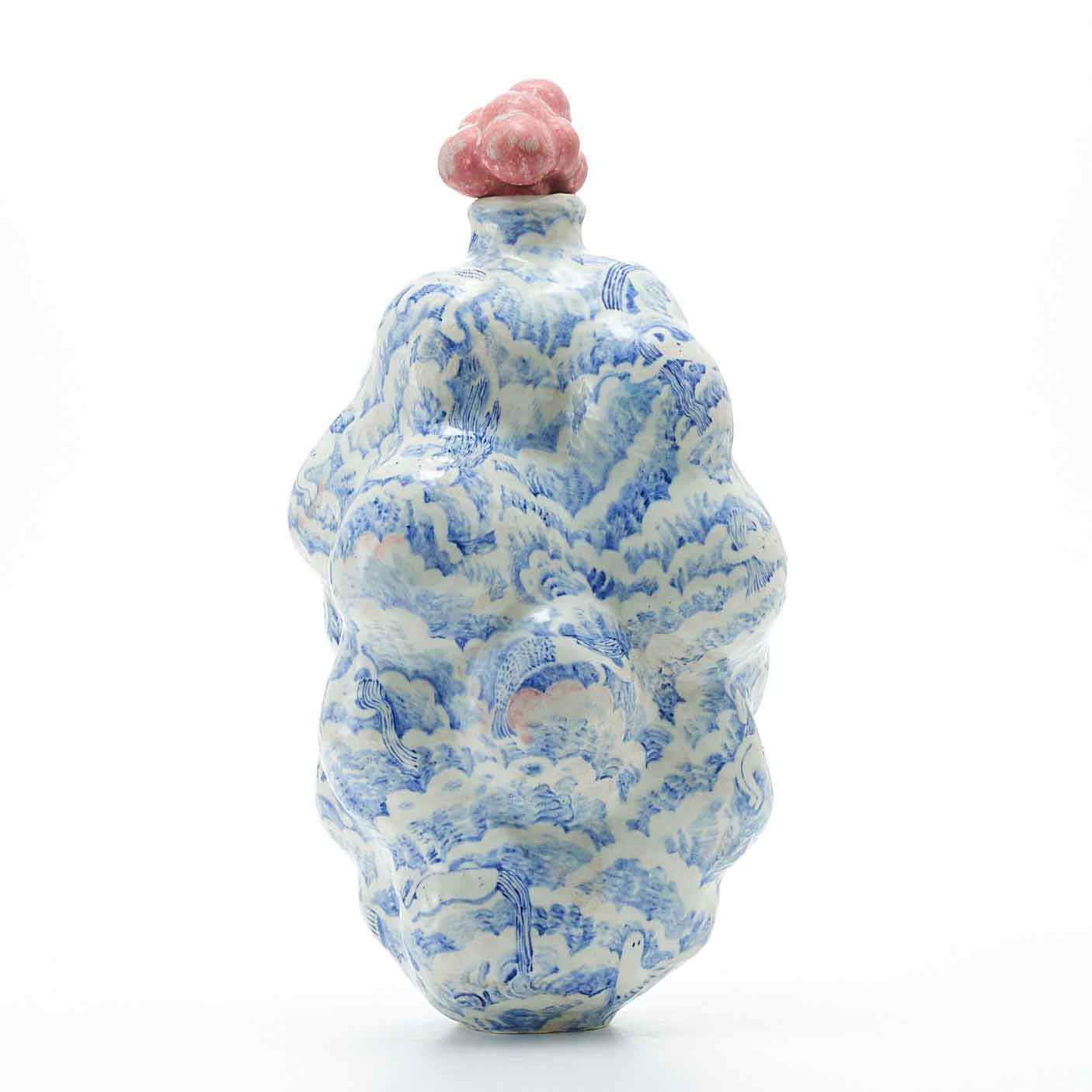 もくもくとした雲のようなところに、昼寝をしている人々が漂っている景色を染め付けで描いています。絵付けはユーモア溢れていますが、作品全体からは気品溢れ出しています。蓋の赤い実もアクセントして効いています。
