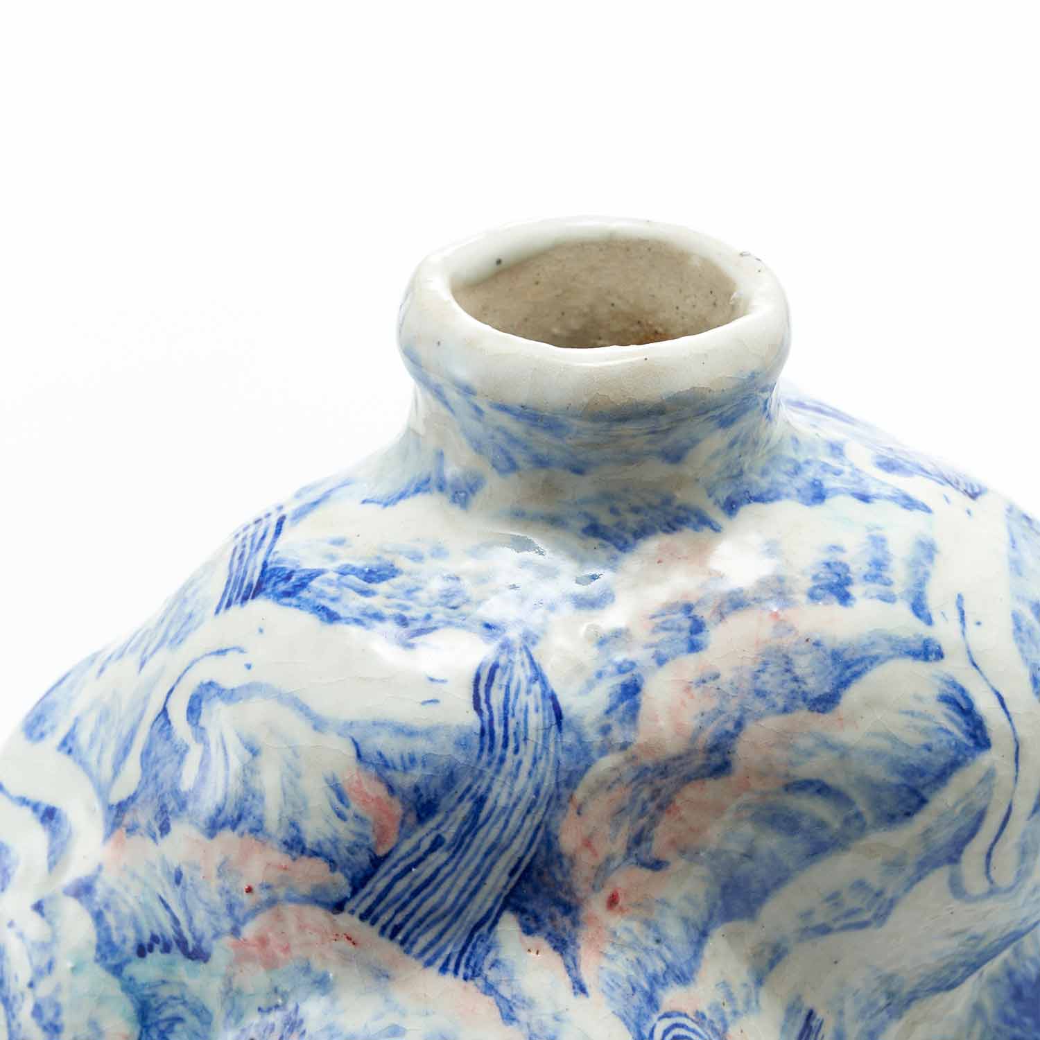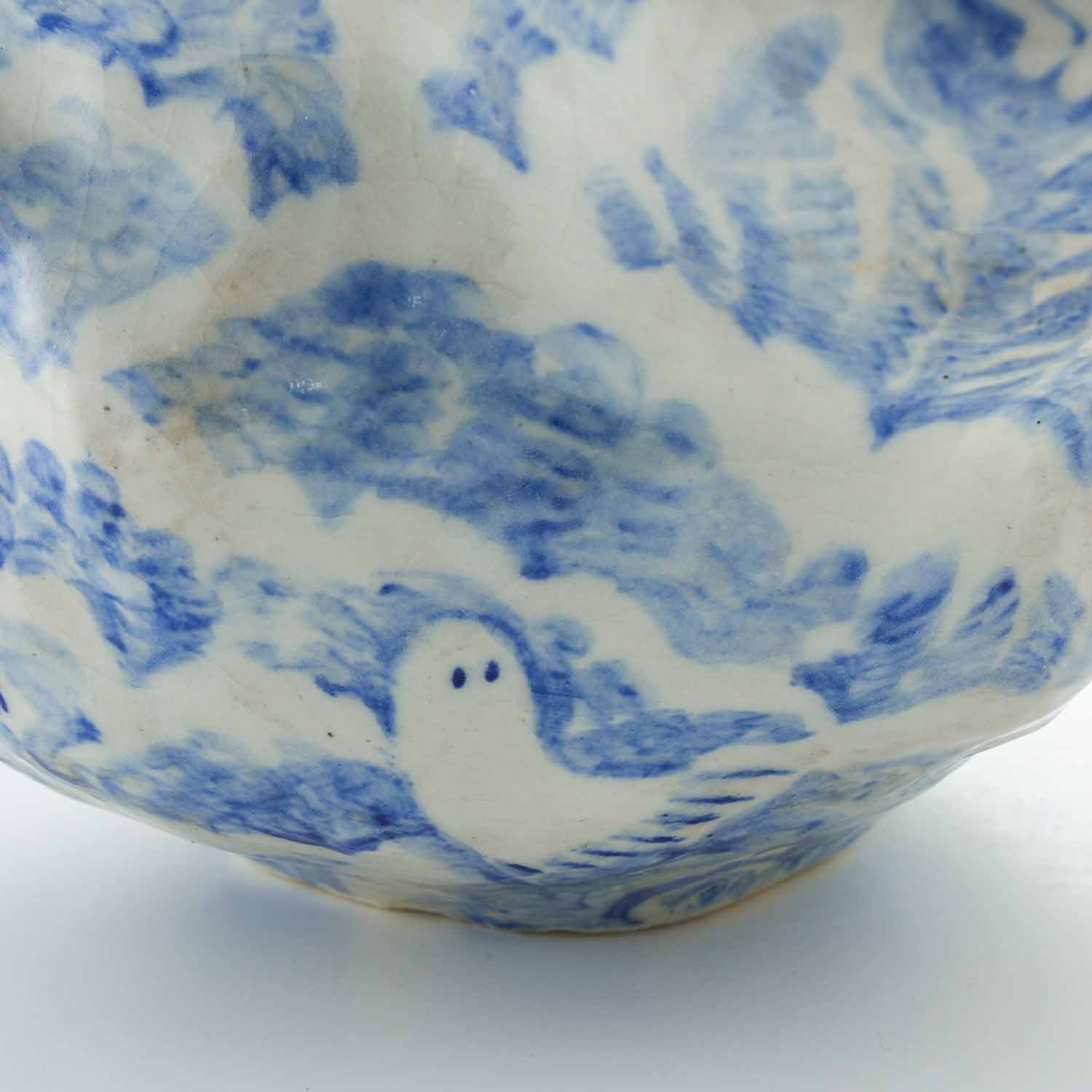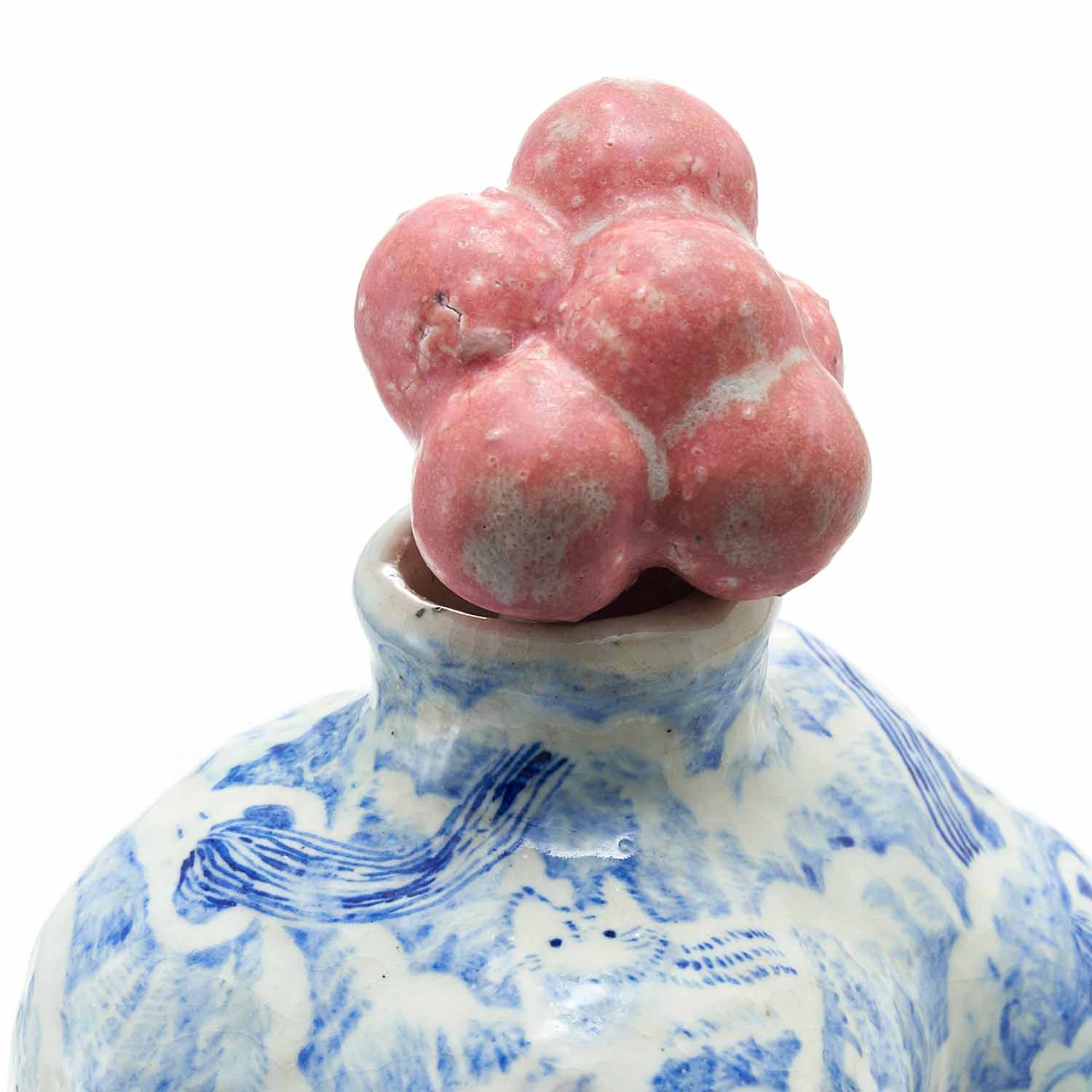 もくもくとした雲のようなところに、昼寝をしている人々が漂っている景色を染め付けで描いています。絵付けはユーモア溢れていますが、作品全体からは気品溢れ出しています。蓋の赤い実もアクセントして効いています。