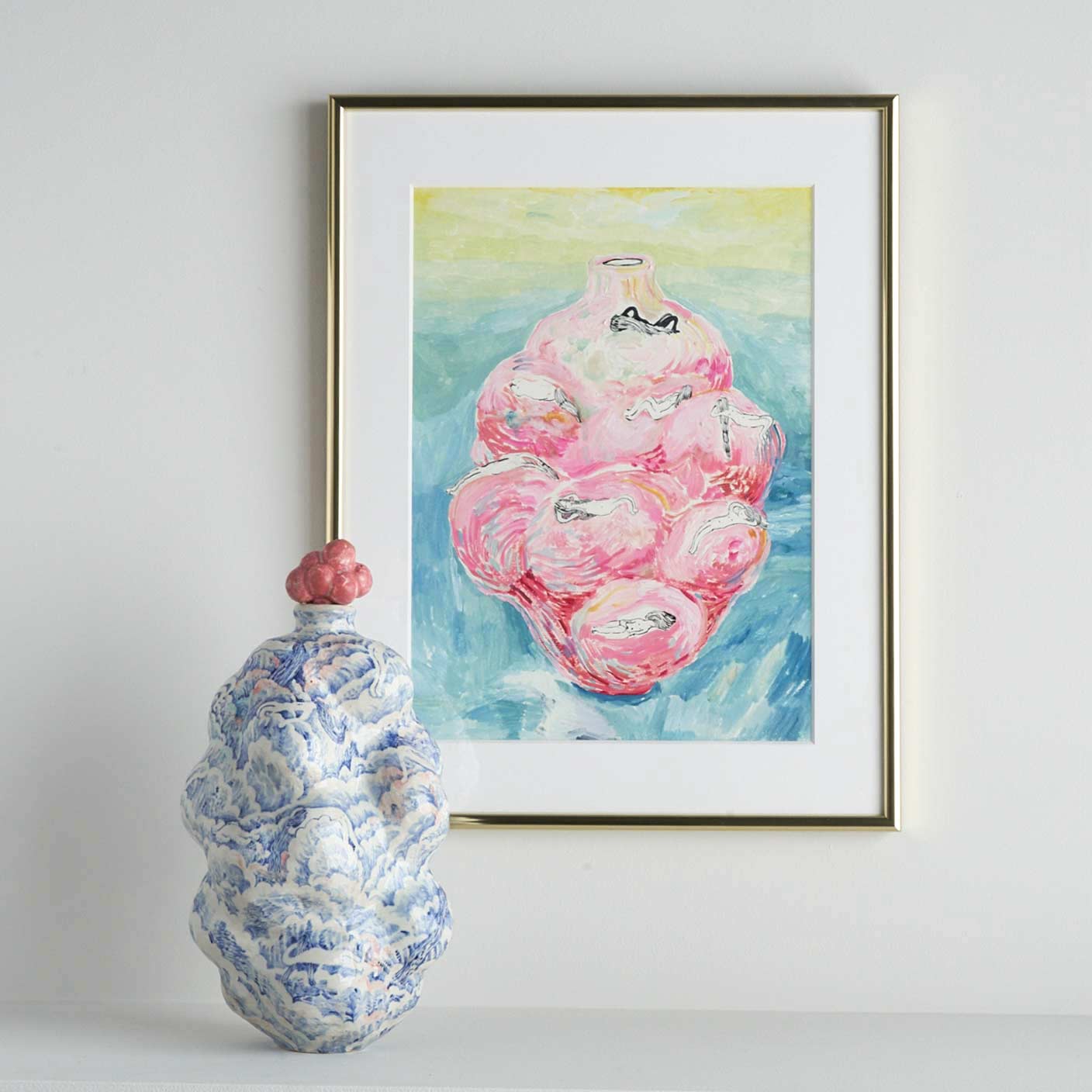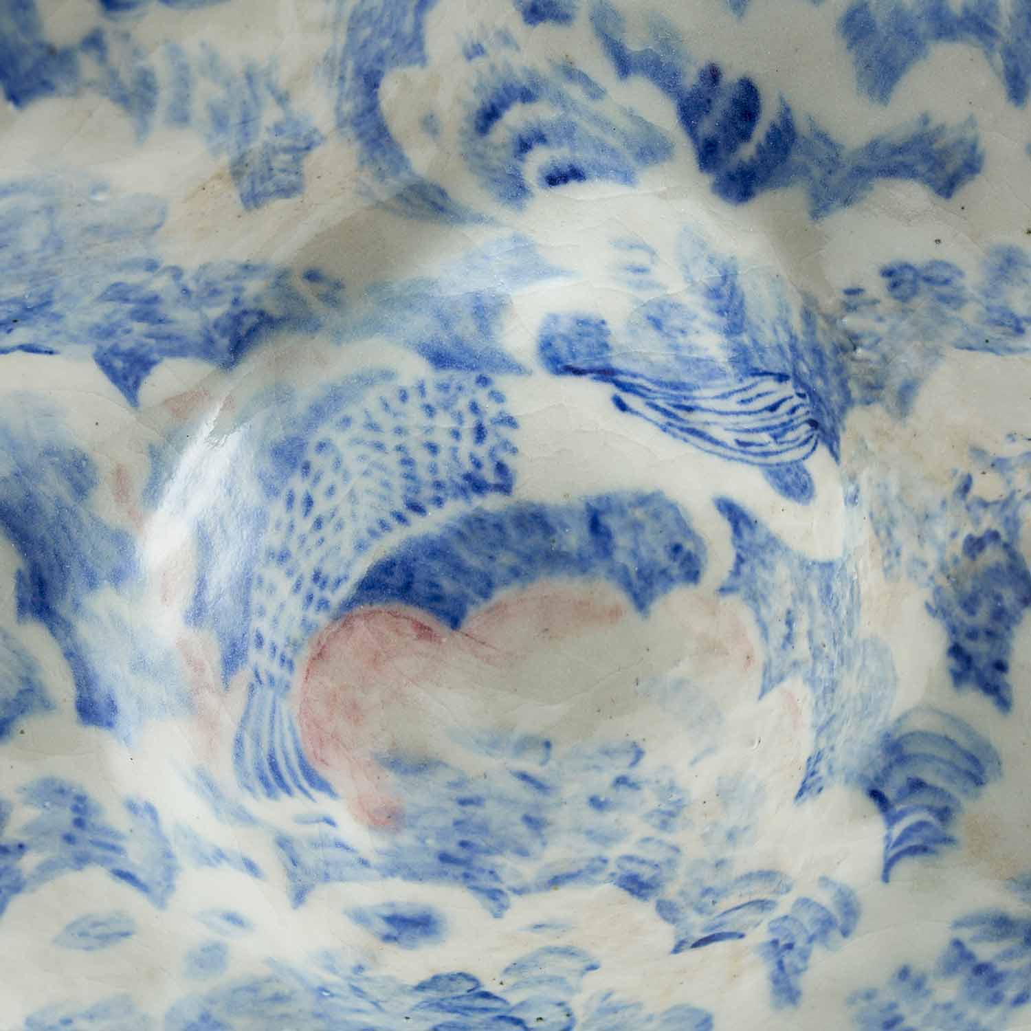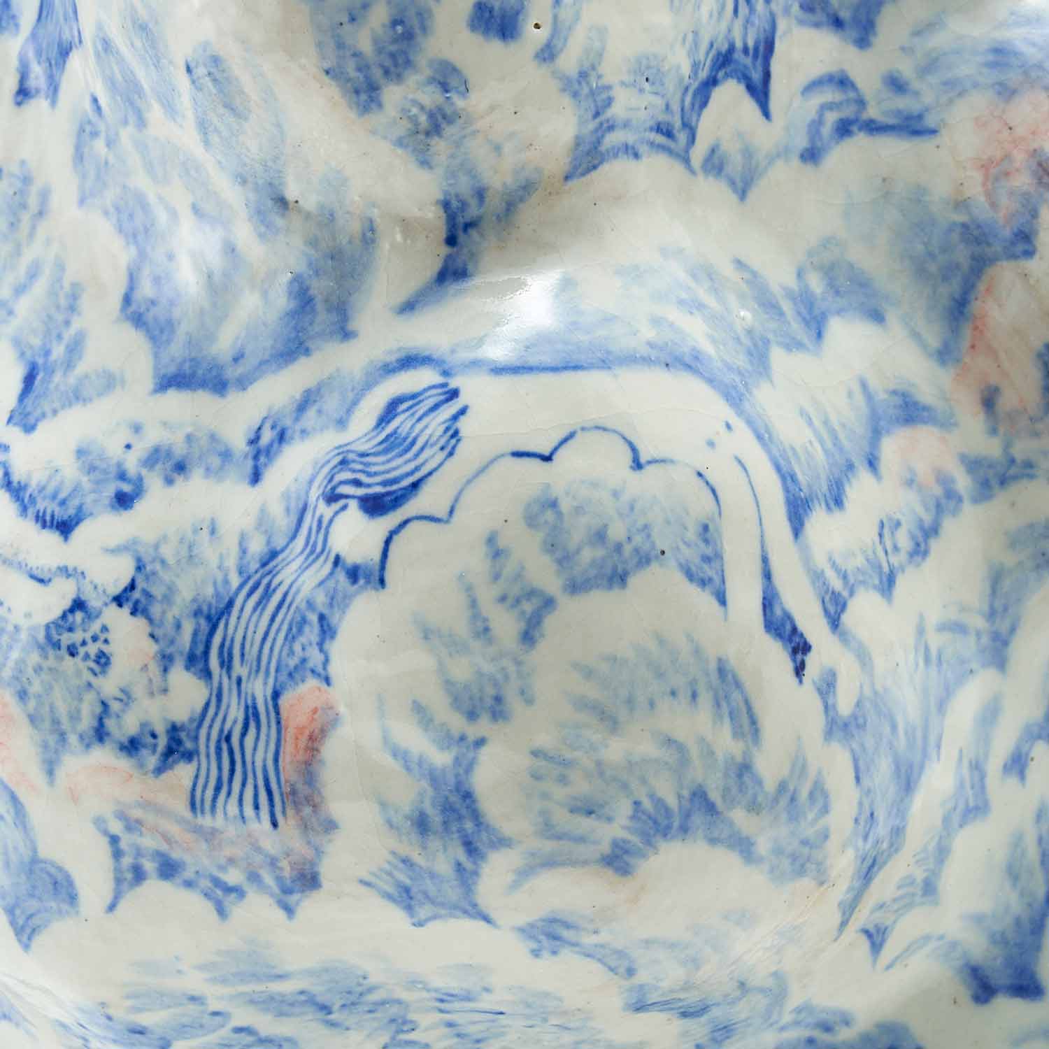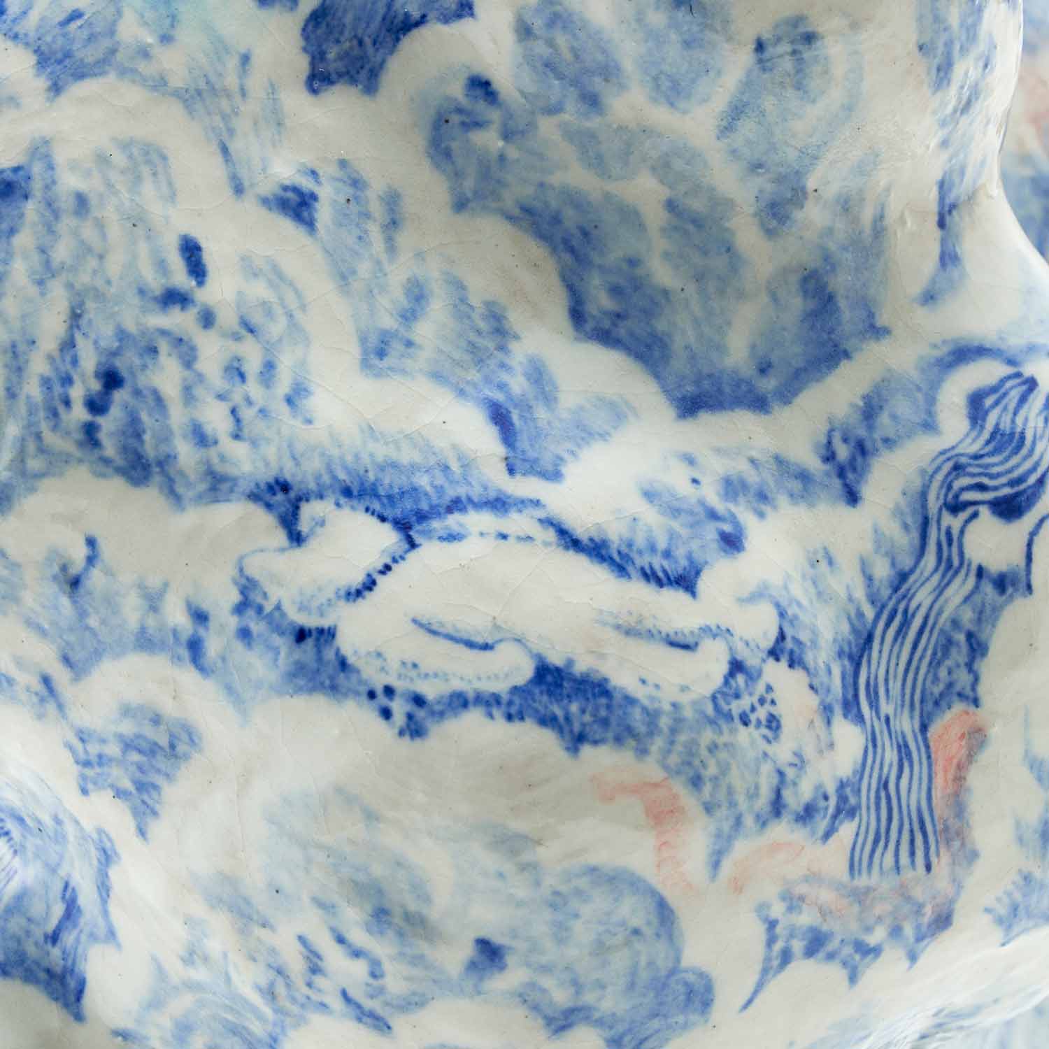 もくもくとした雲のようなところに、昼寝をしている人々が漂っている景色を染め付けで描いています。絵付けはユーモア溢れていますが、作品全体からは気品溢れ出しています。蓋の赤い実もアクセントして効いています。