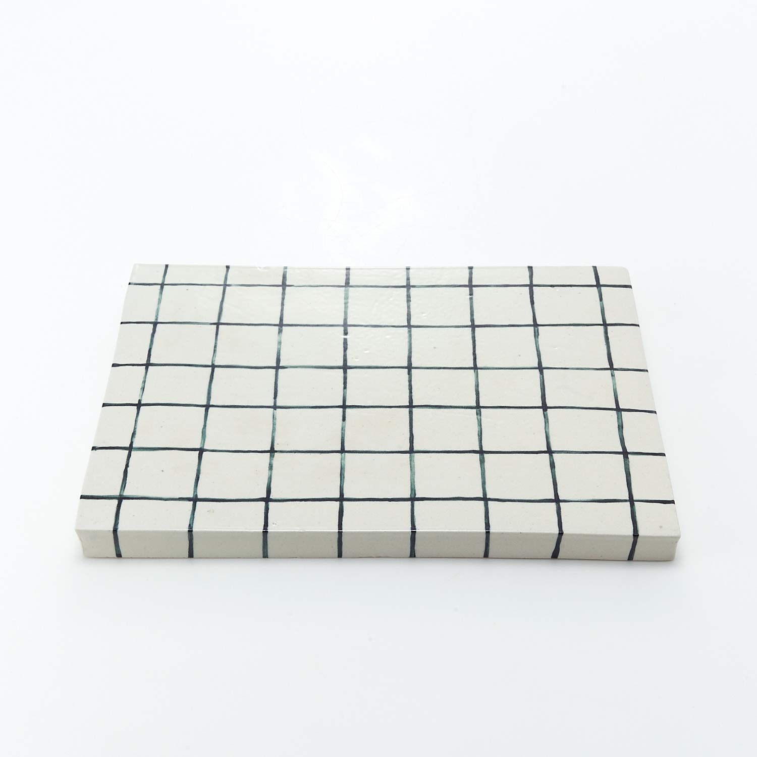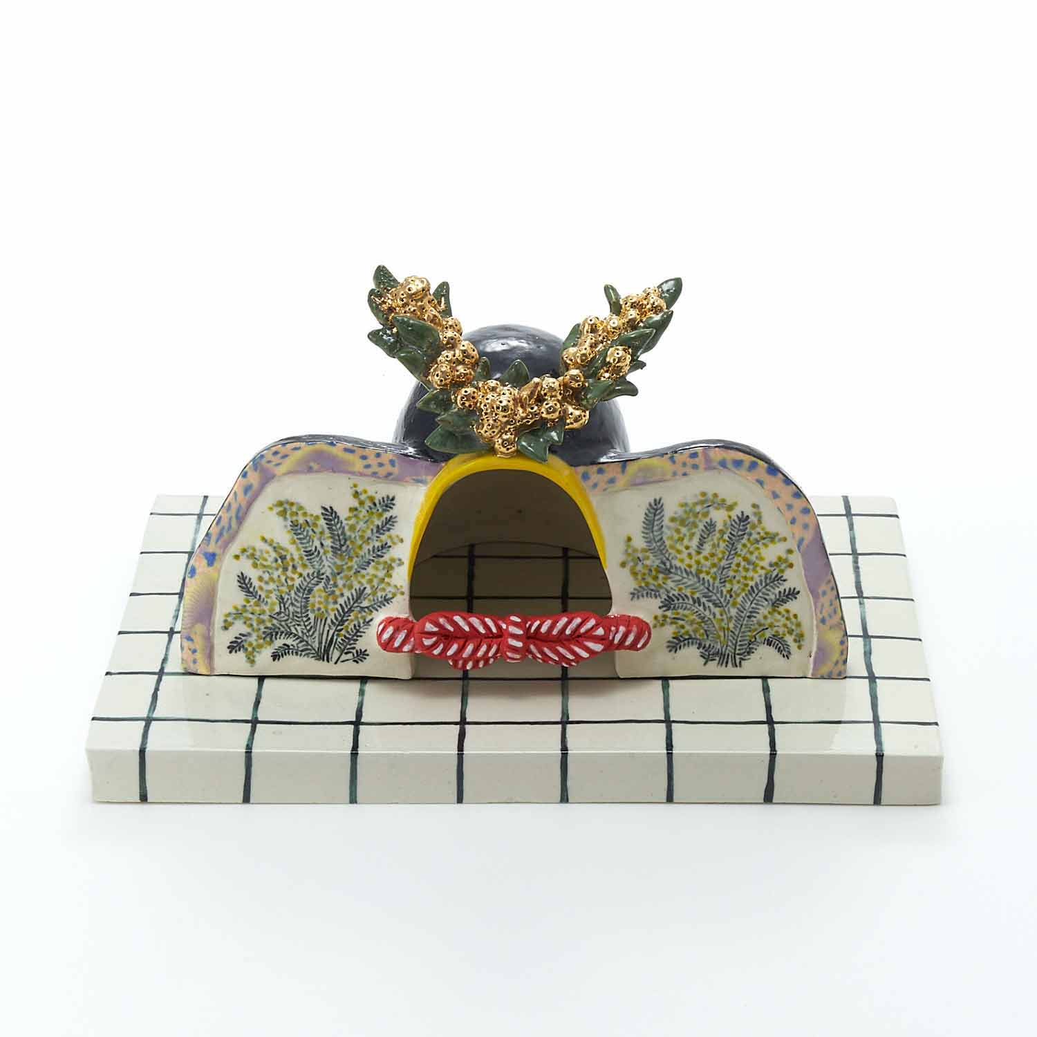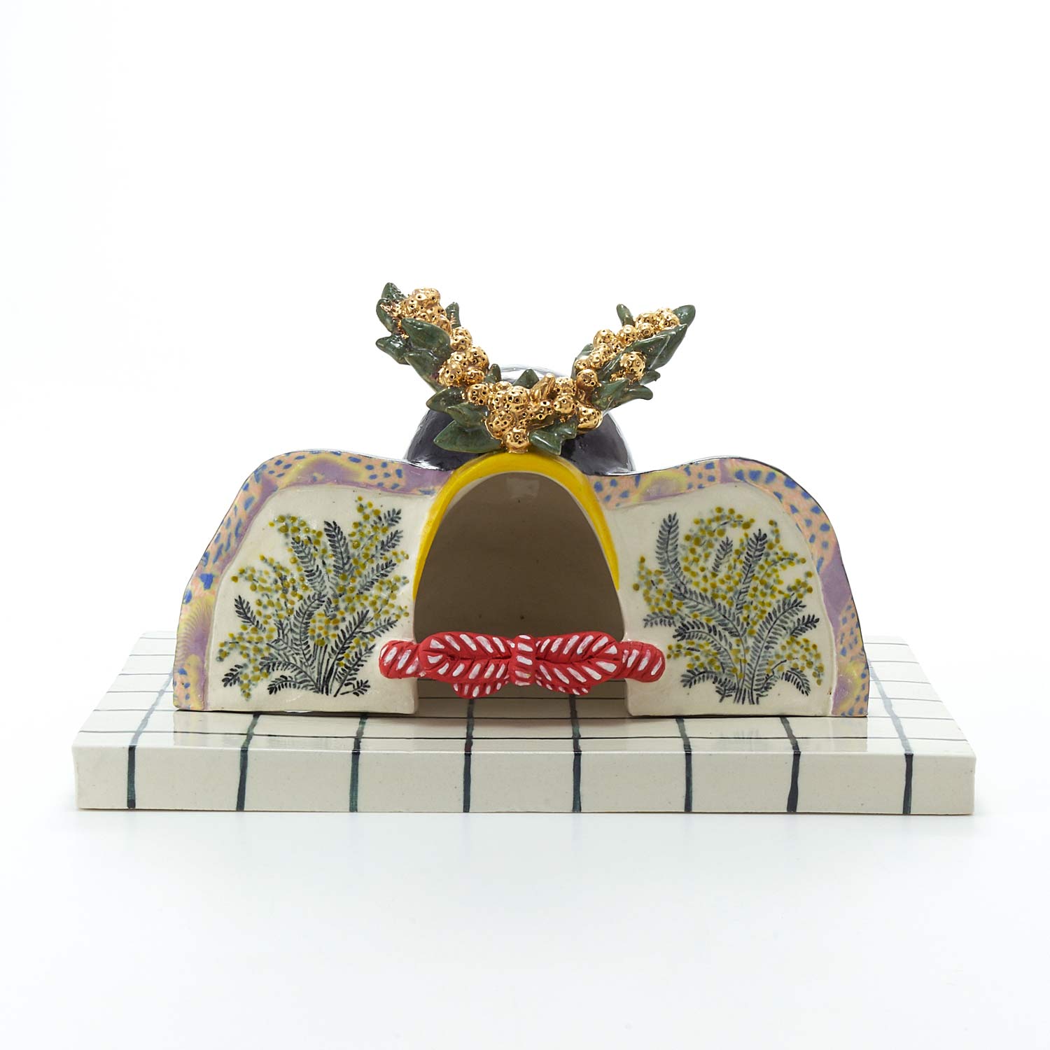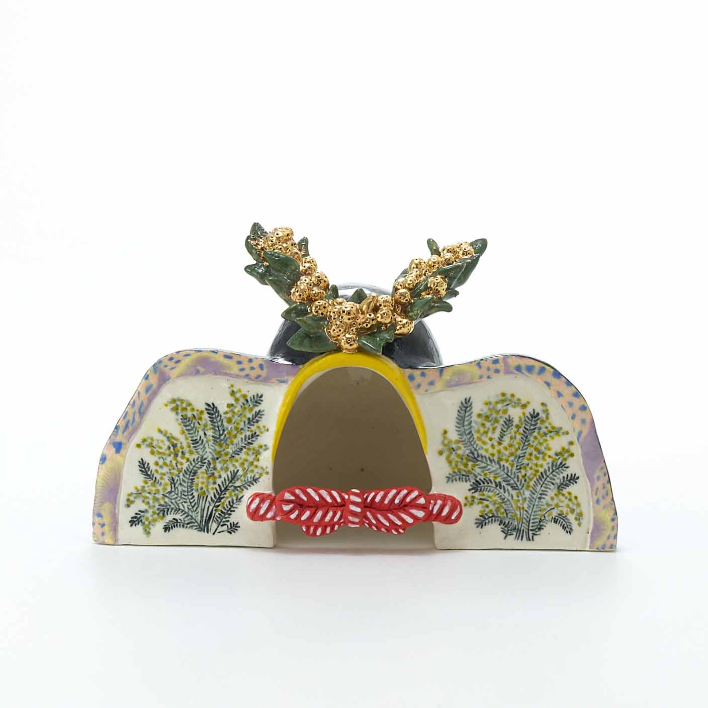 兜のお飾りです。子どもの健やかな成長を願い作りました。吹返部分と鍬形部分にはミモザの花があしらわれています。台は呉須で格子柄に絵付けされています。