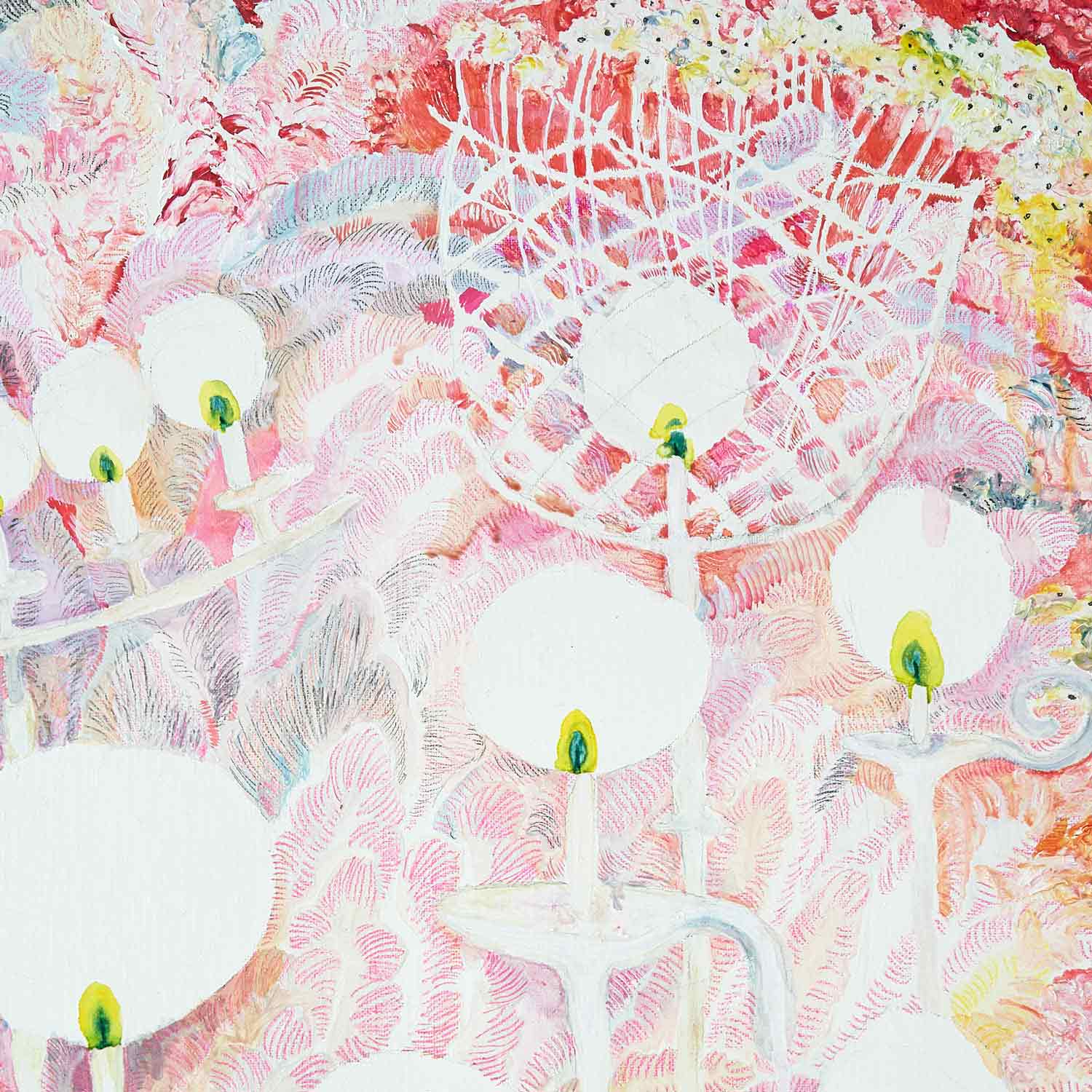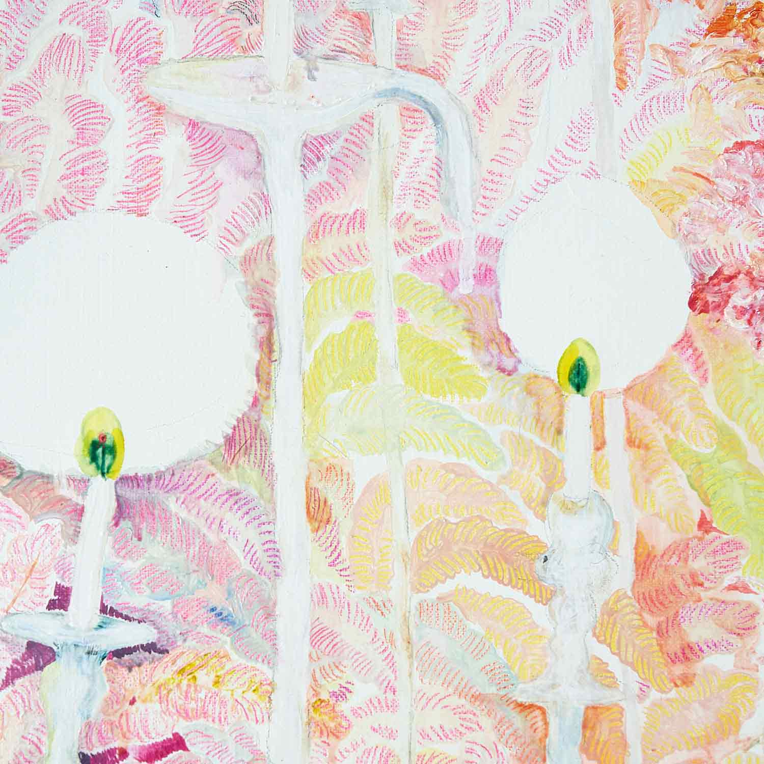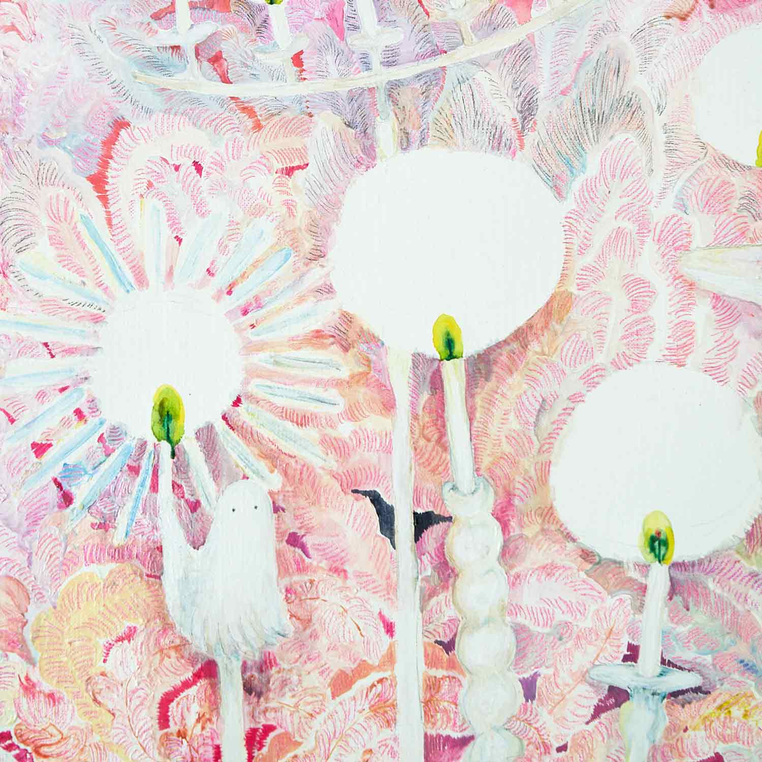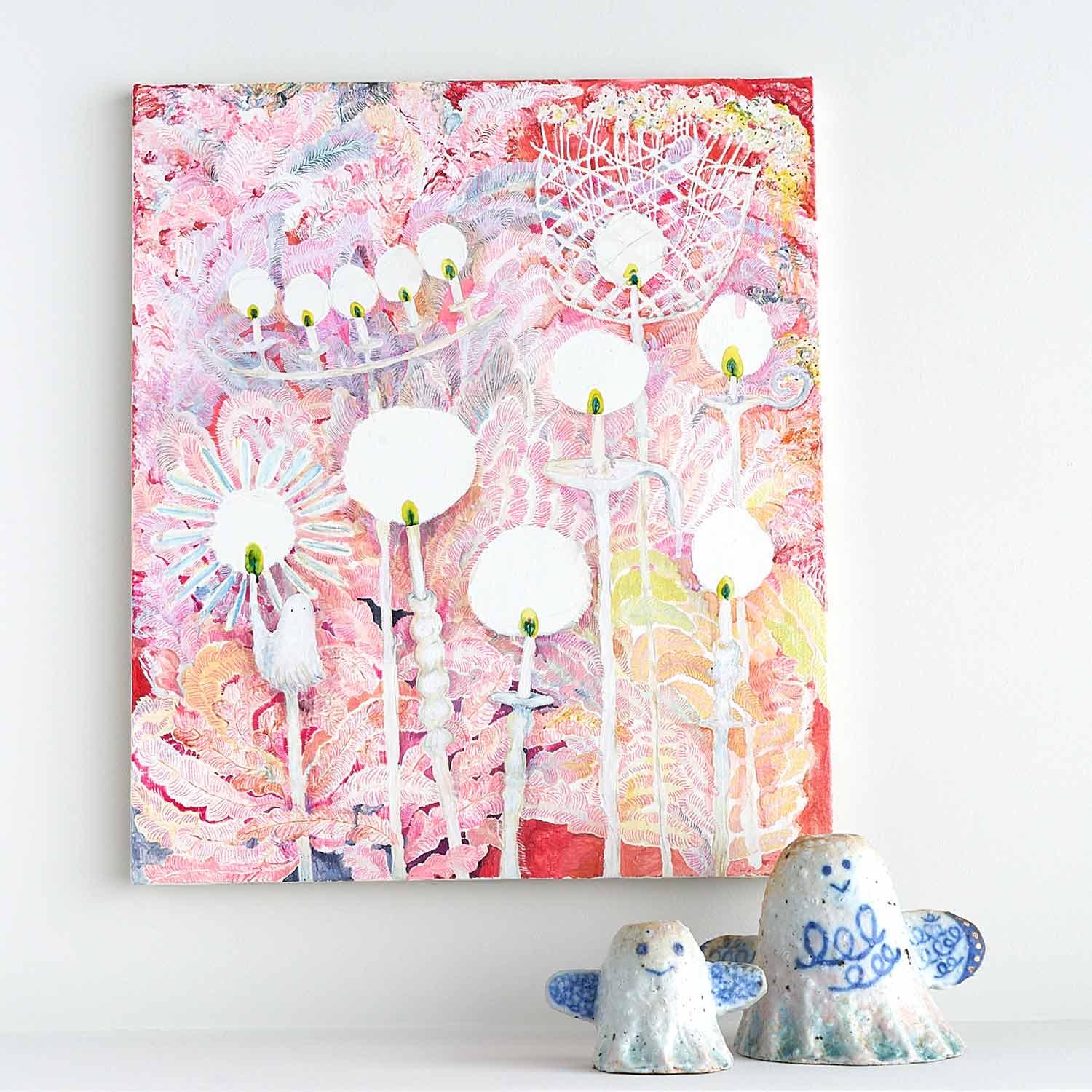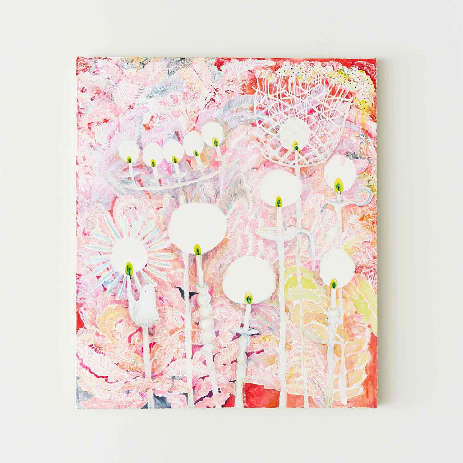 キャンドルたちが羽のような植物にに同化し一緒に揺らいでいるような油絵作品です。オレンジ、ピンク、赤が美しいです。