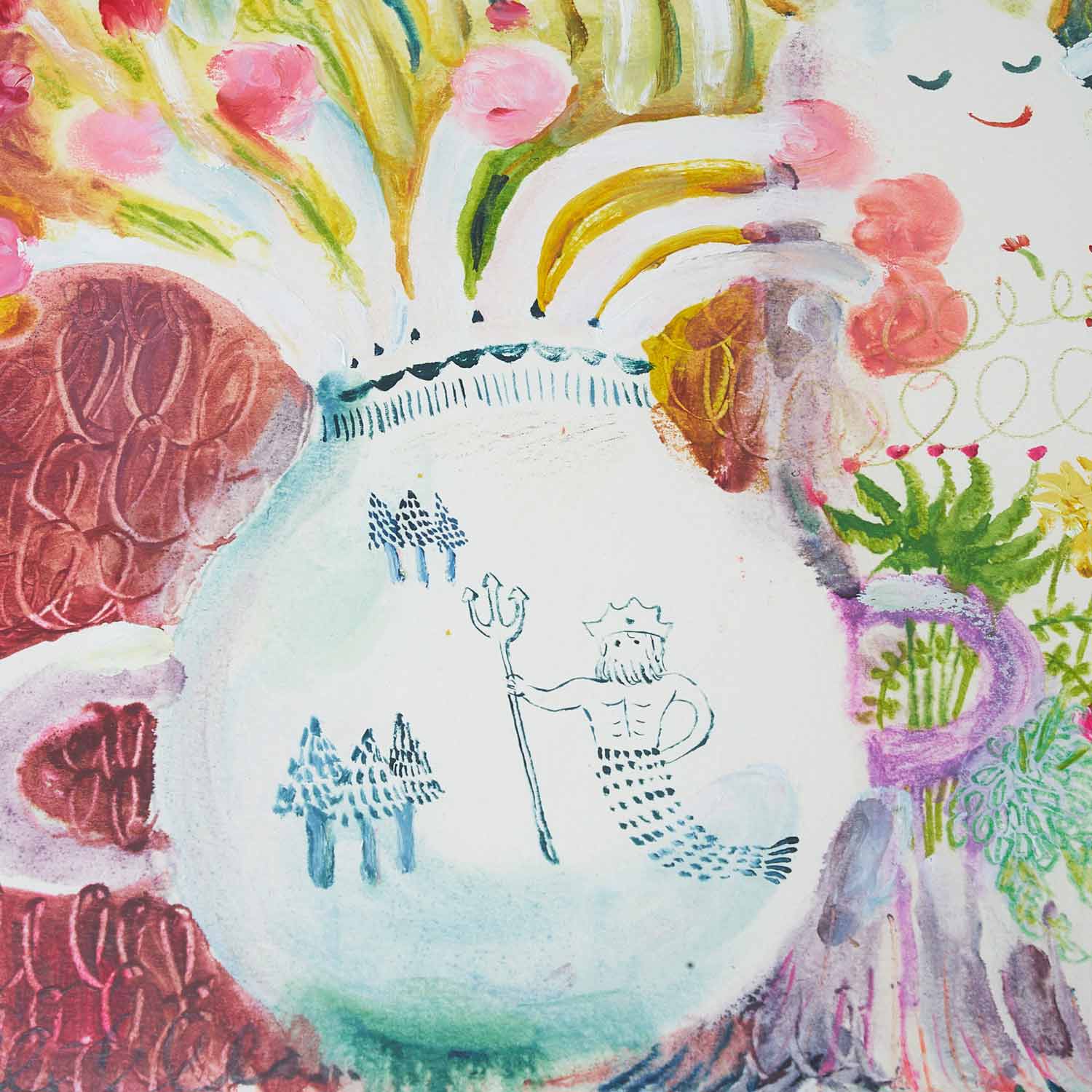 愛らしい2匹のおばけと花が生けられた花瓶の組み合わせ。まわりにはたんぽぽなどの植物が描かれています。