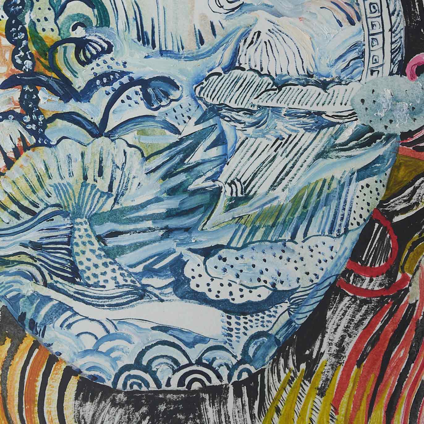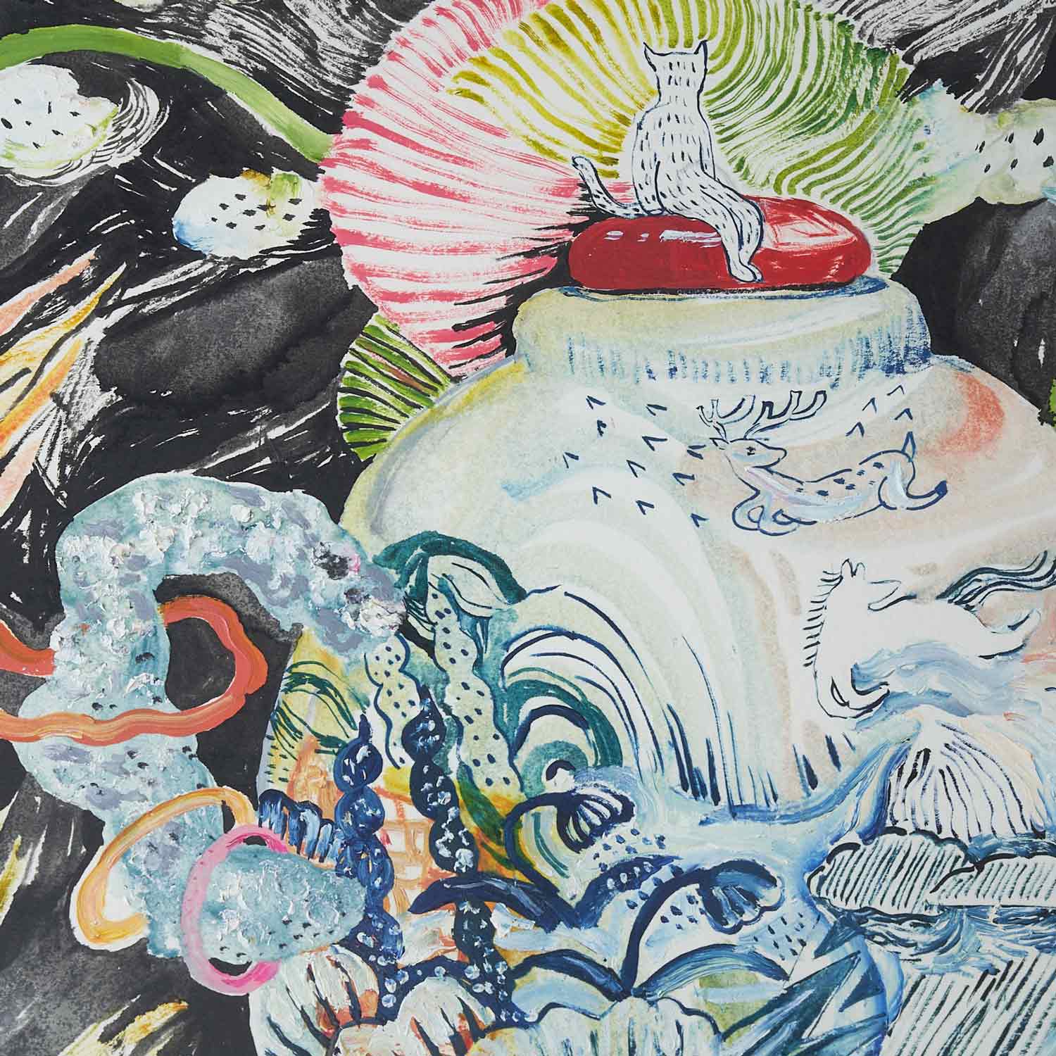 This is a powerful piece with a pattern popping out of the jar. A cat-like animal is sitting on top of the jar. The use of colors is beautiful.
