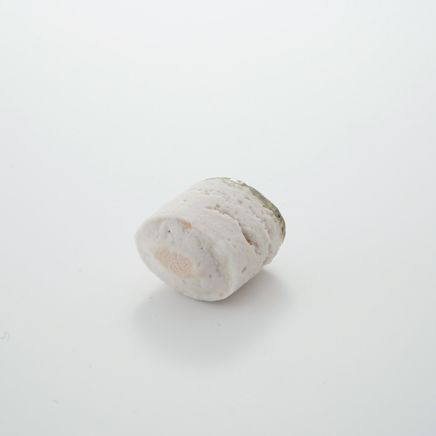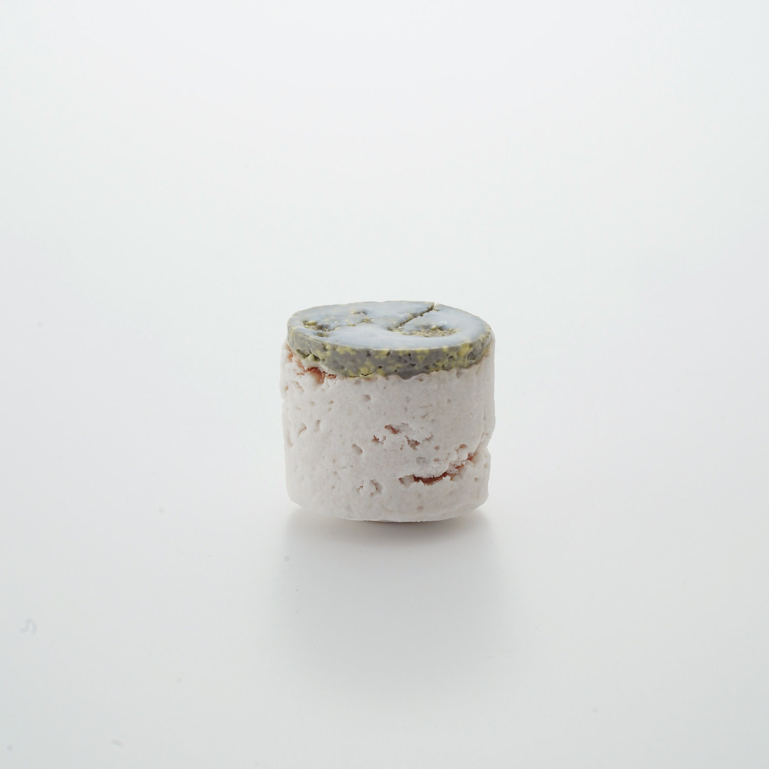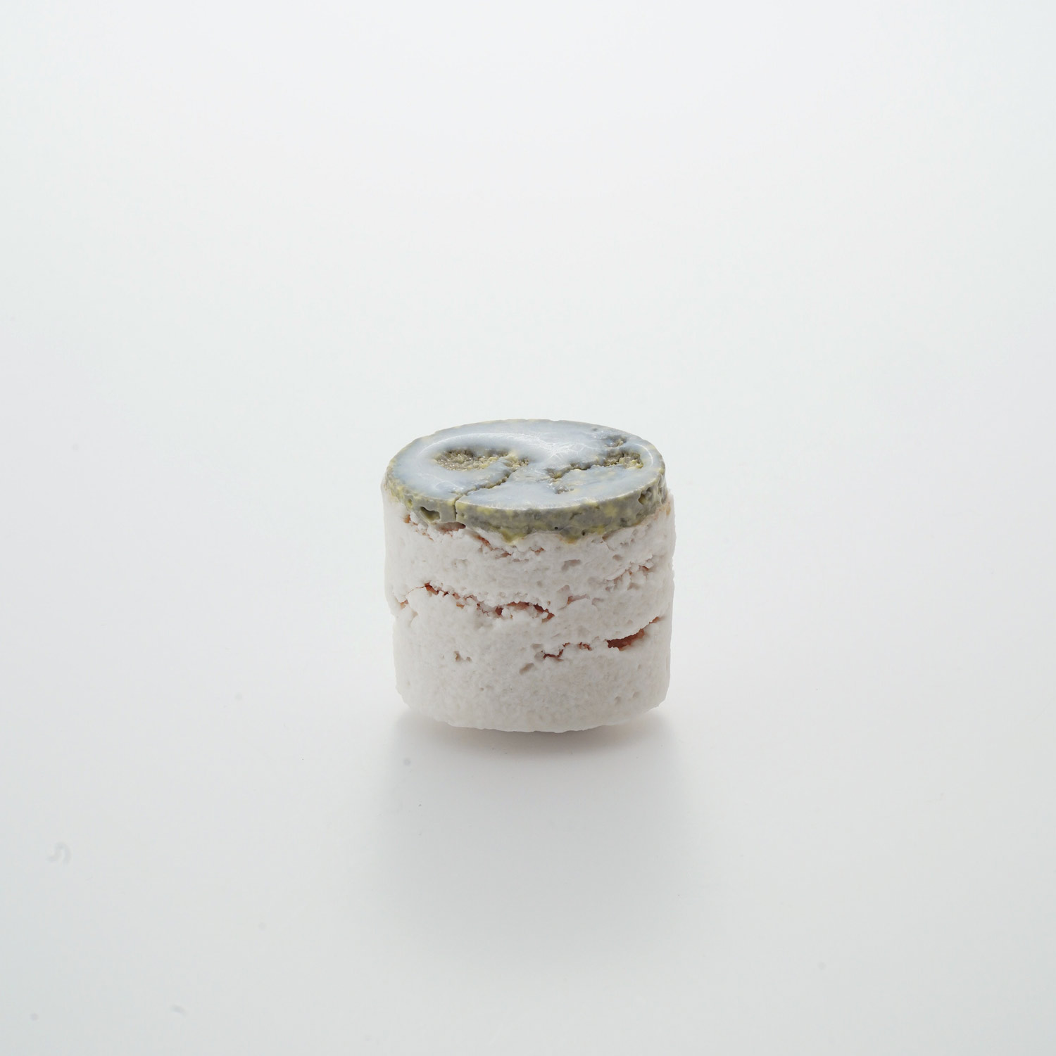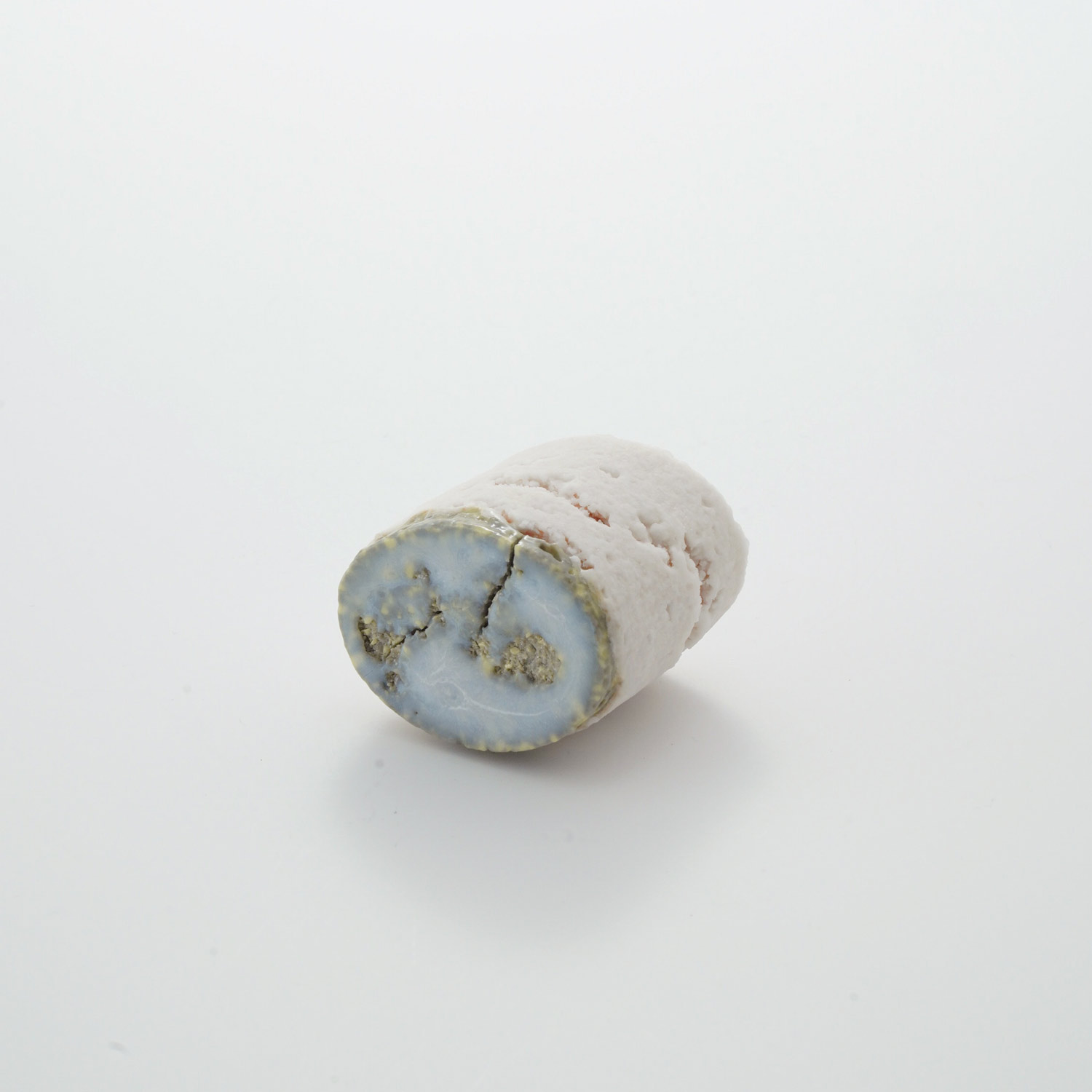 The firing process melts the glass components mixed with clay and changes the shape of the piece. This is a small work that captures the process of shape change. I was inspired by the layers of the earth.