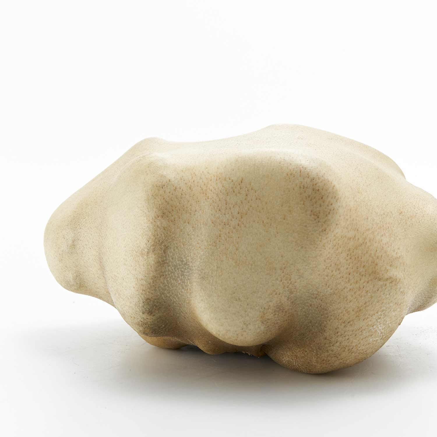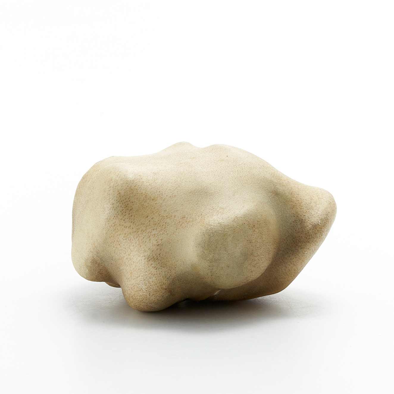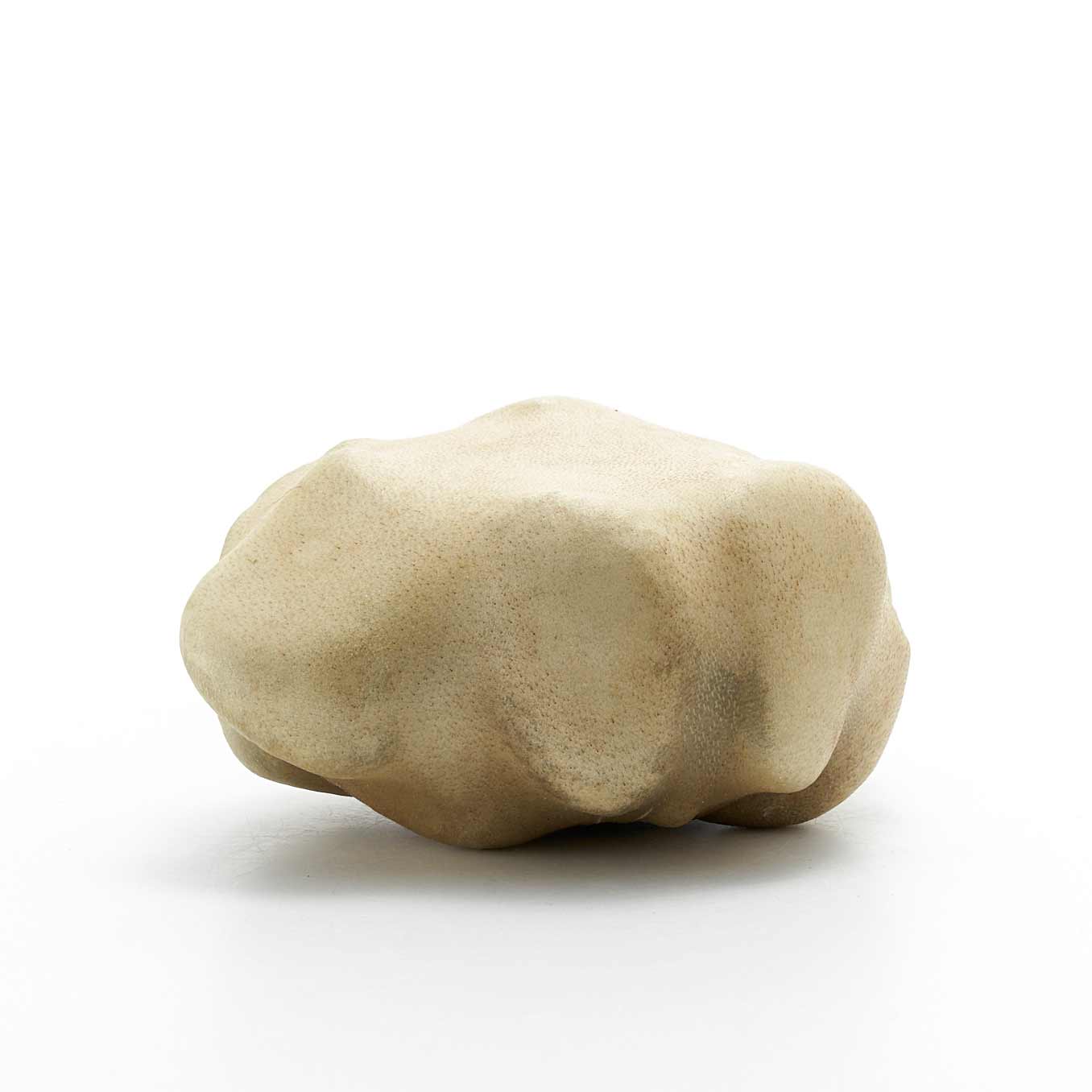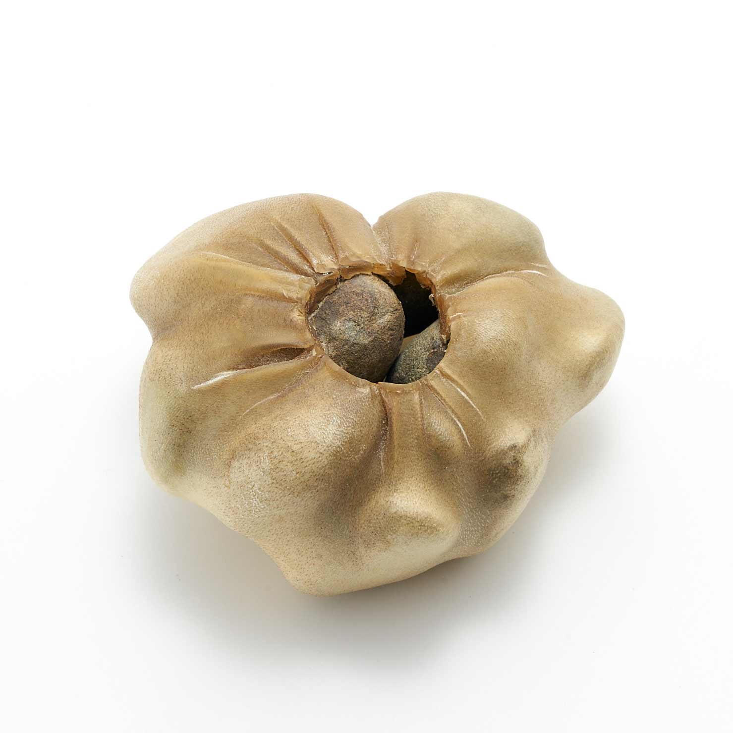 アトリエのある和知の森の石を鹿の皮でぎゅっと包んだ作品です。丸い小石を包んだ手のひらサイズの愛らしい形です。一見、皮とは思えない質感が魅力です。