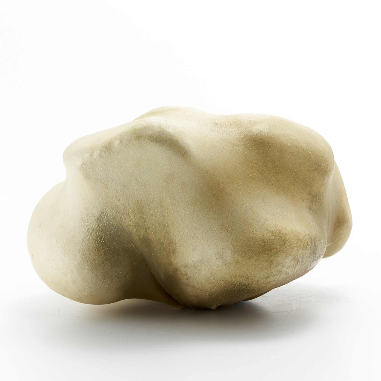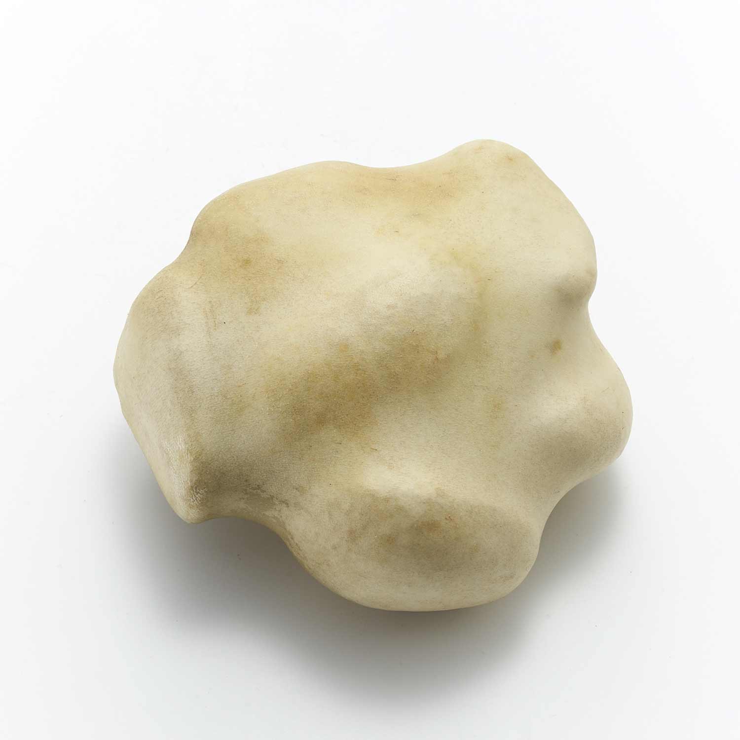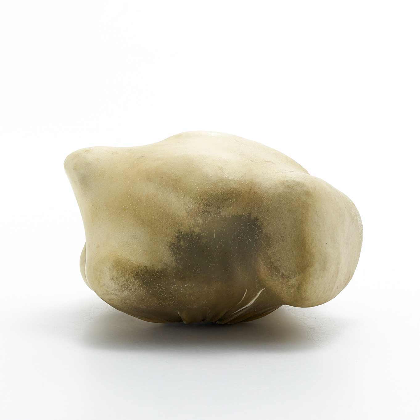 アトリエのある和知の森の石を鹿の皮でぎゅっと包んだ作品です。丸い小石を包んだ手のひらサイズの愛らしい形です。一見、皮とは思えない質感が魅力です。