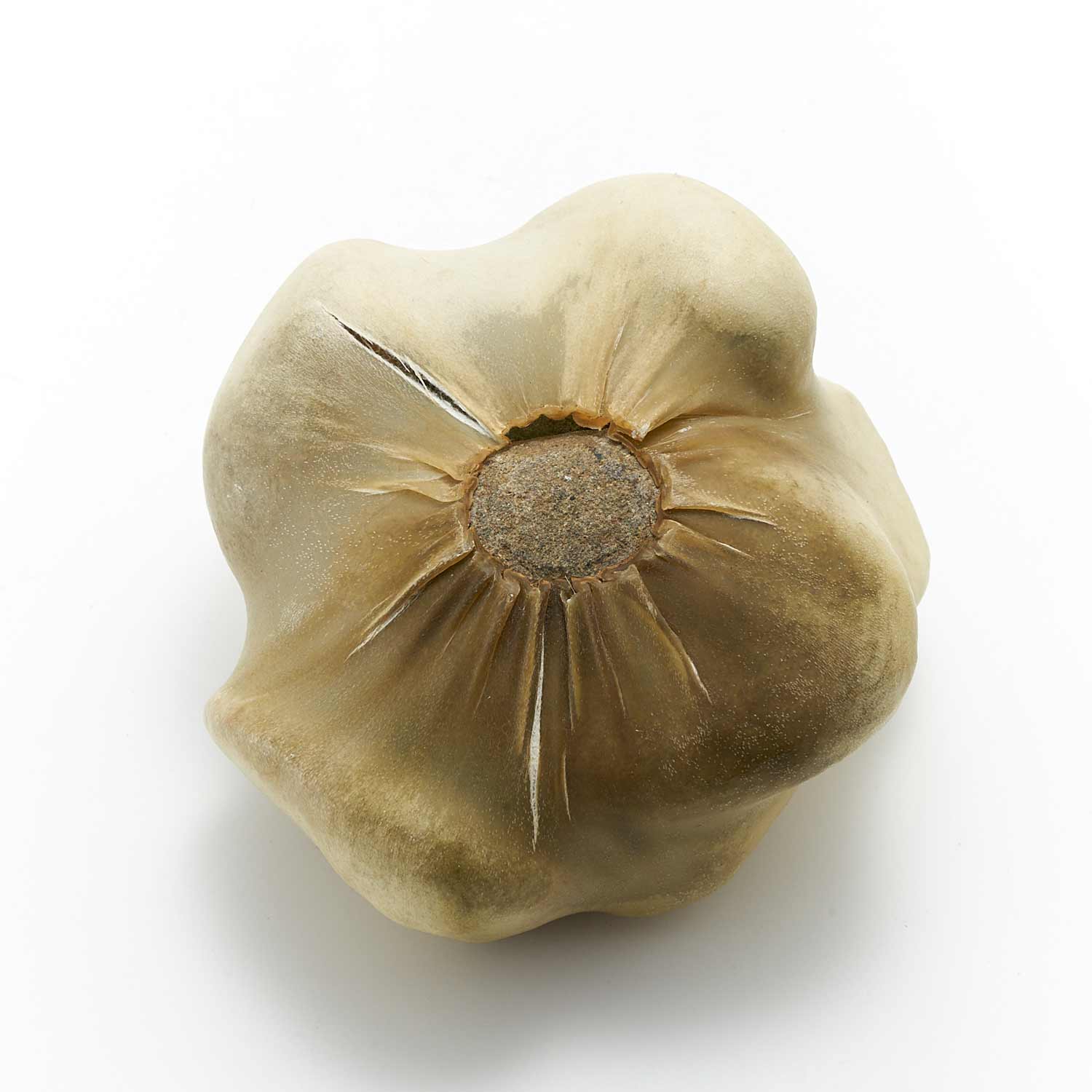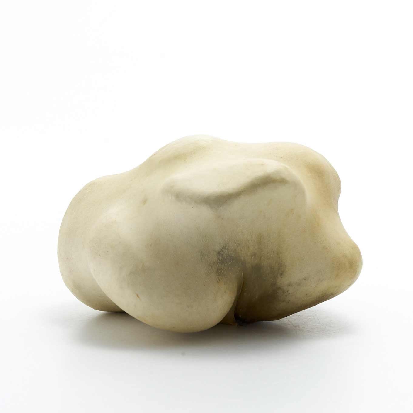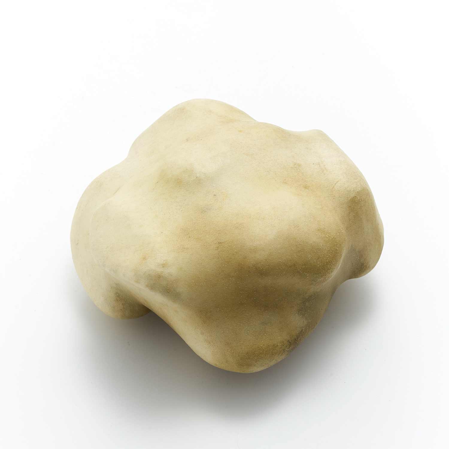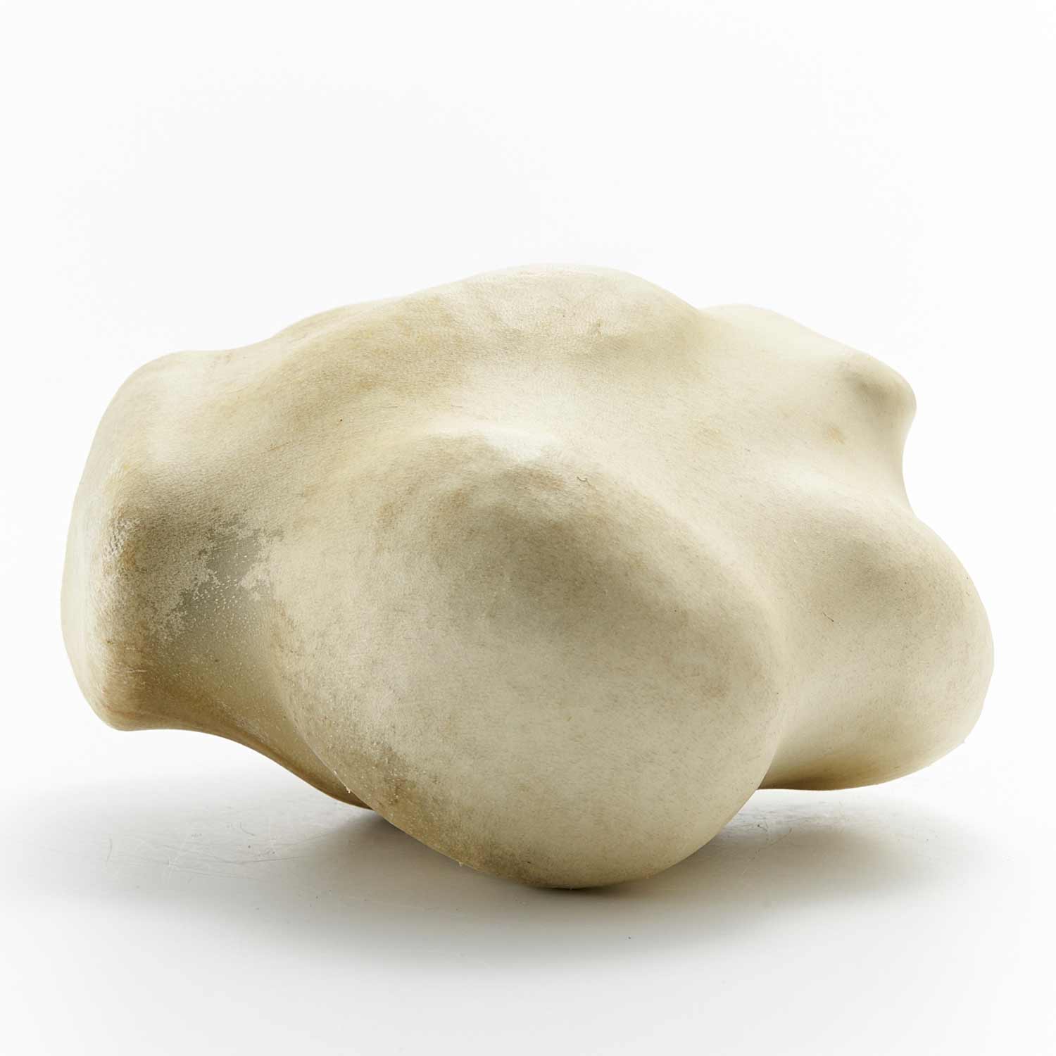 アトリエのある和知の森の石を鹿の皮でぎゅっと包んだ作品です。丸い小石を包んだ手のひらサイズの愛らしい形です。一見、皮とは思えない質感が魅力です。
