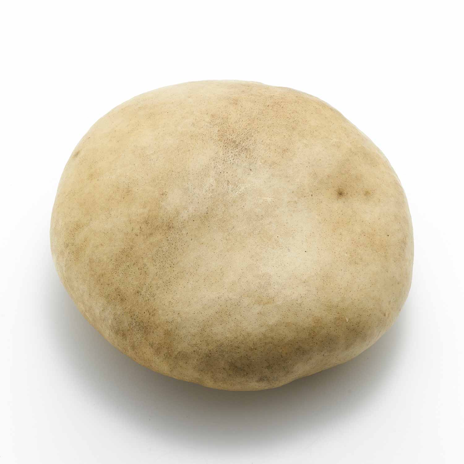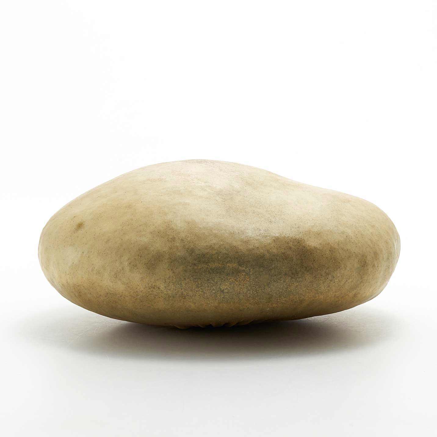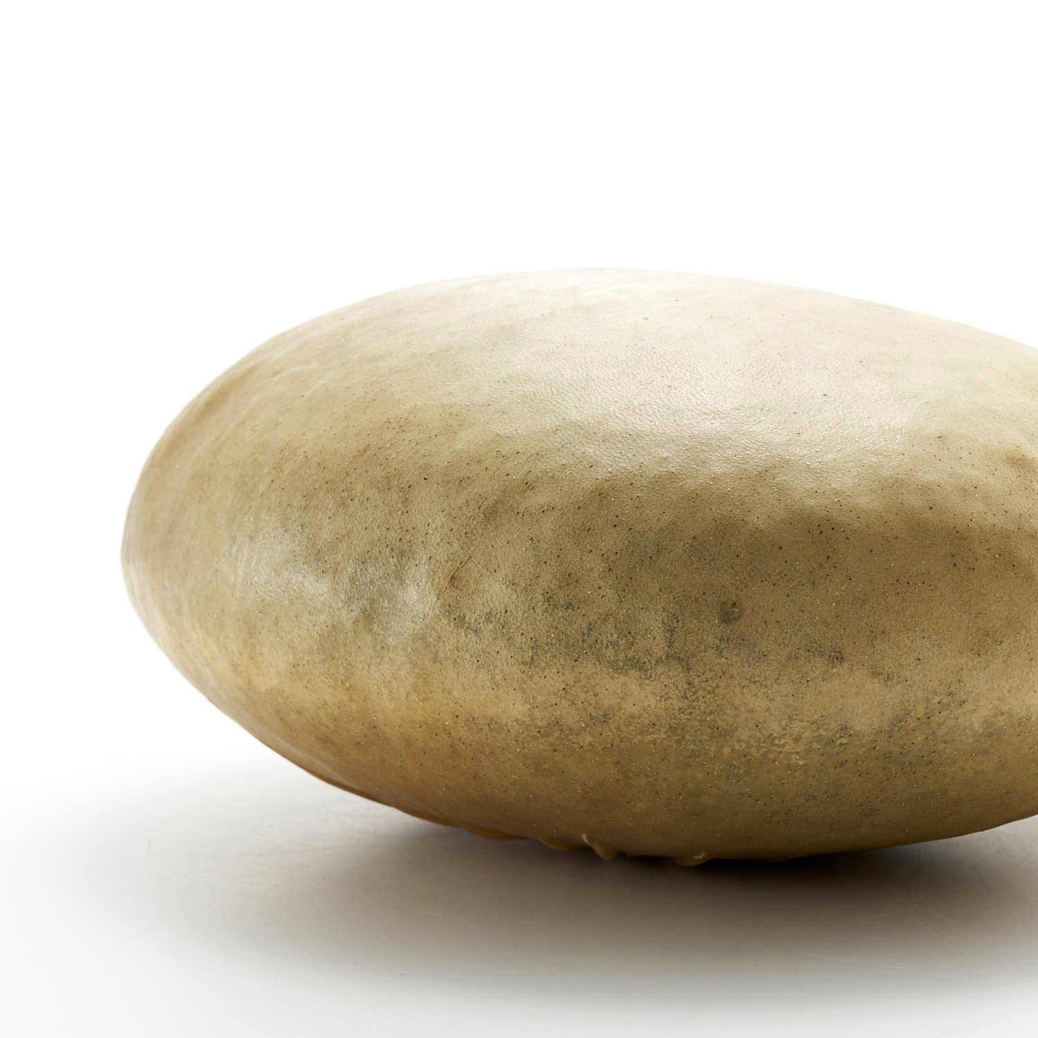 アトリエのある和知の森の石を鹿の皮でぎゅっと包んだ作品です。こちらの作品は平たい形の大きな石を使用。張り詰めた空気感と存在感があります。一見、皮とは思えない質感が魅力です。