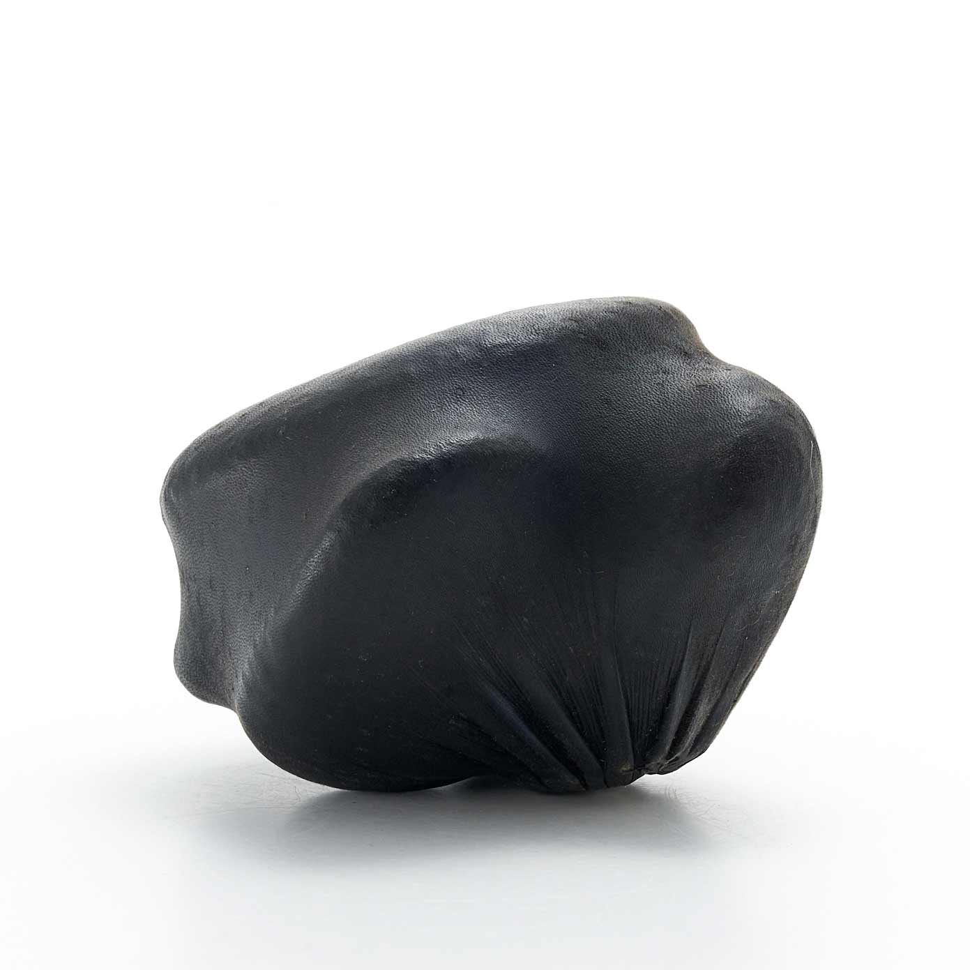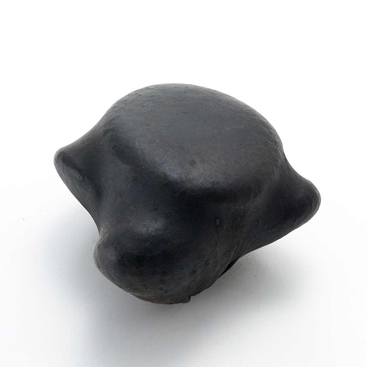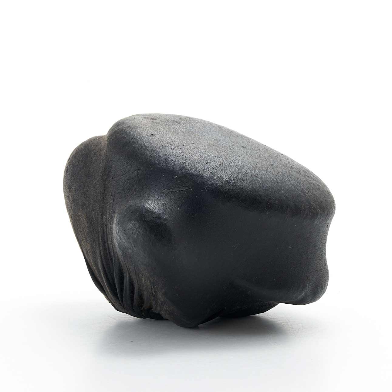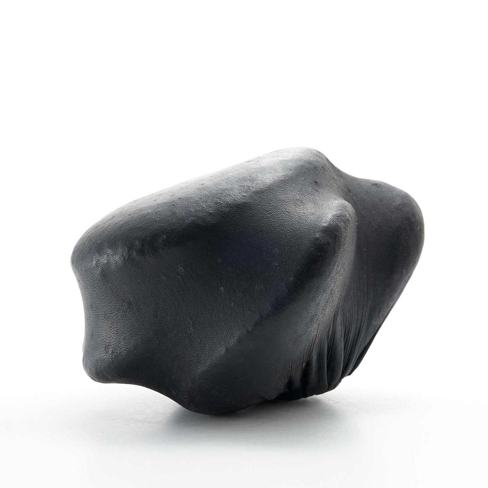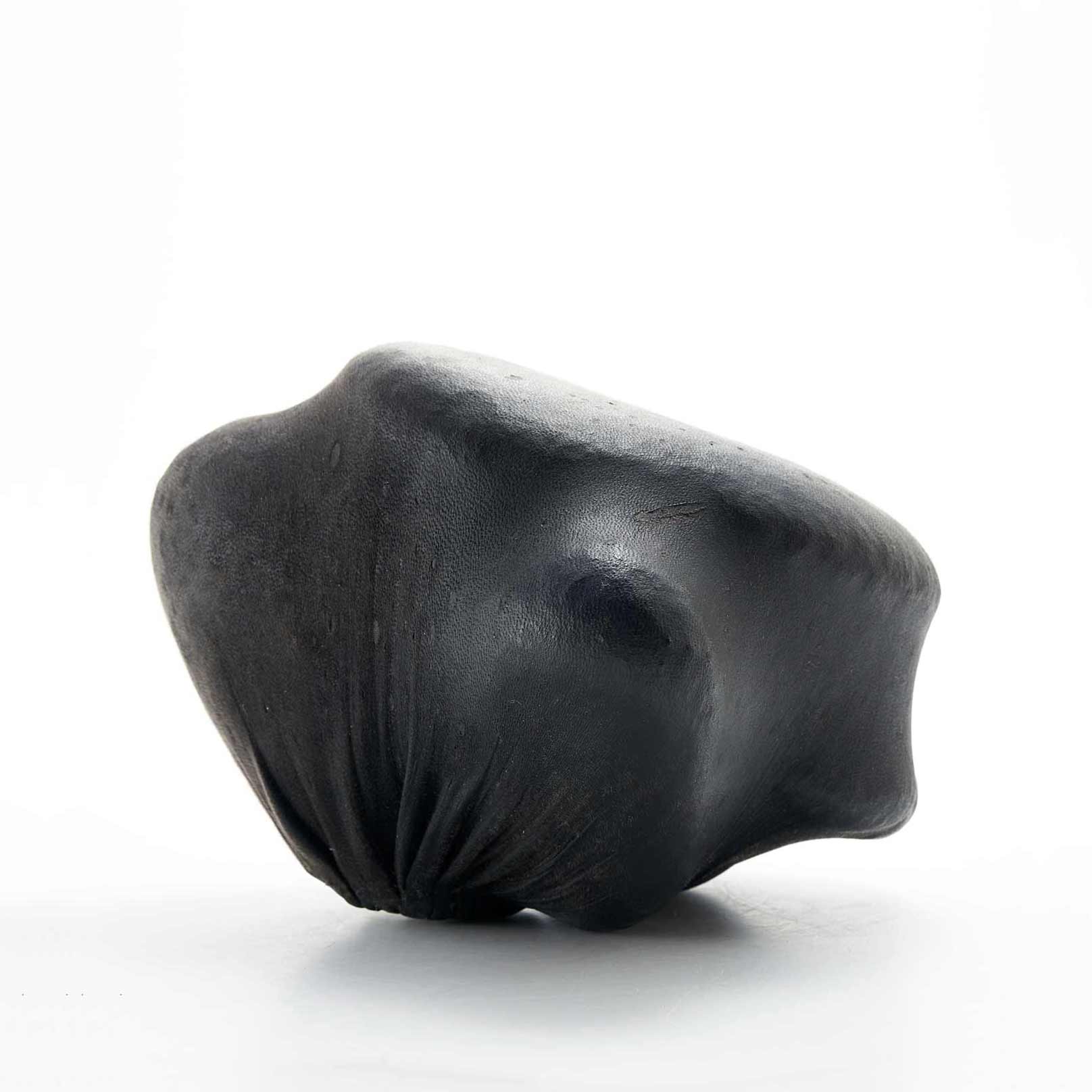 アトリエのある和知の森の石を鹿の皮でぎゅっと包んだ作品です。こちらはお茶のタンニンで黒く染めた皮を使用。平の石を天面に持ってくることで生まれた形が斬新。一見、皮とは思えない質感が魅力です。