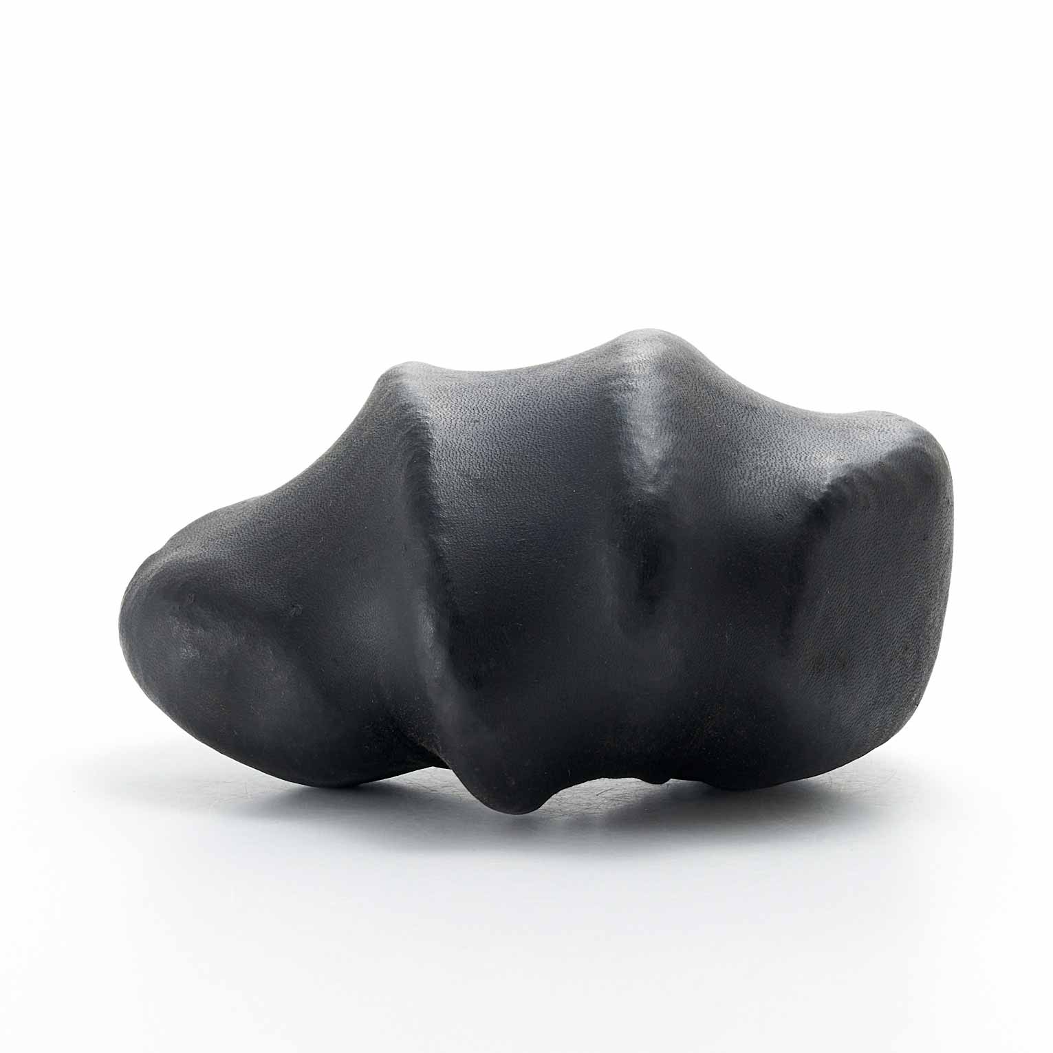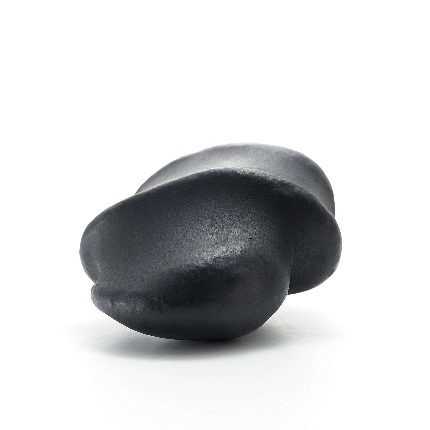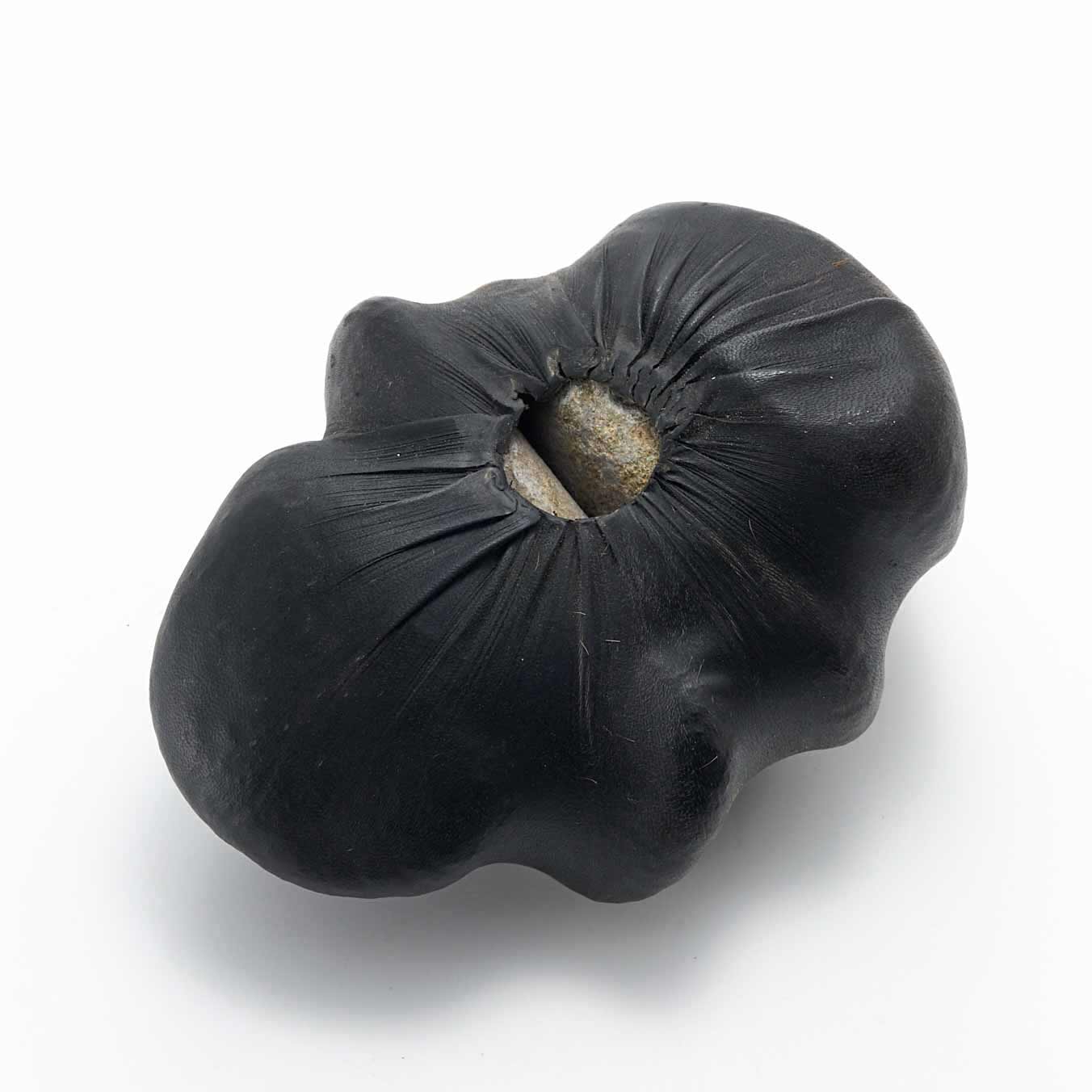 アトリエのある和知の森の石を鹿の皮でぎゅっと包んだ作品です。こちらはお茶のタンニンで黒く染めた皮を使用。平たい石を縦に重ねることにより生まれた形や隙間がかっこ良い。一見、皮とは思えない質感が魅力です。