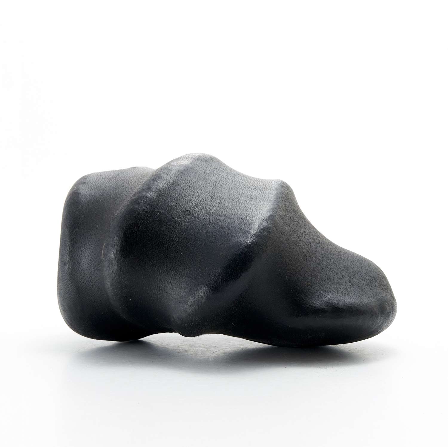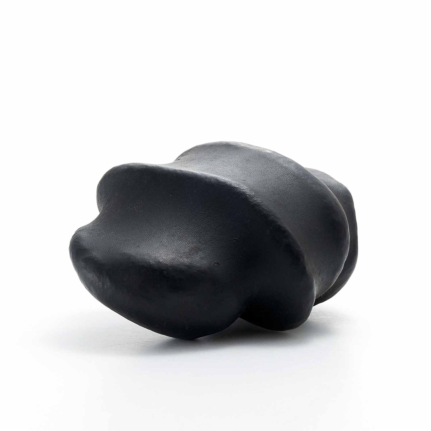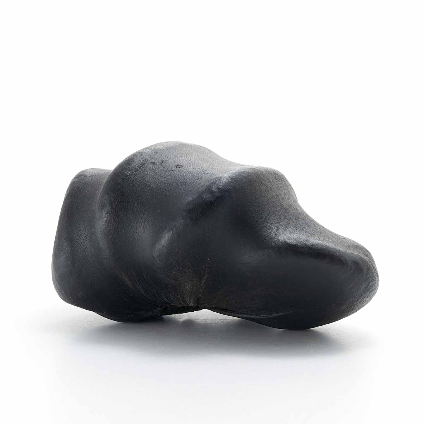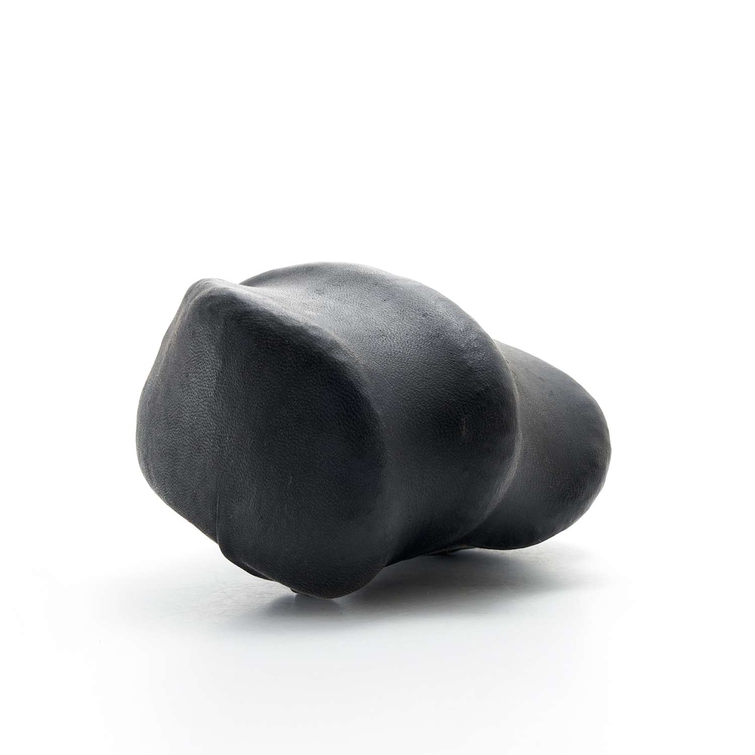 アトリエのある和知の森の石を鹿の皮でぎゅっと包んだ作品です。こちらはお茶のタンニンで黒く染めた皮を使用。平たい石を縦に重ねることにより生まれた形や隙間がかっこ良い。一見、皮とは思えない質感が魅力です。