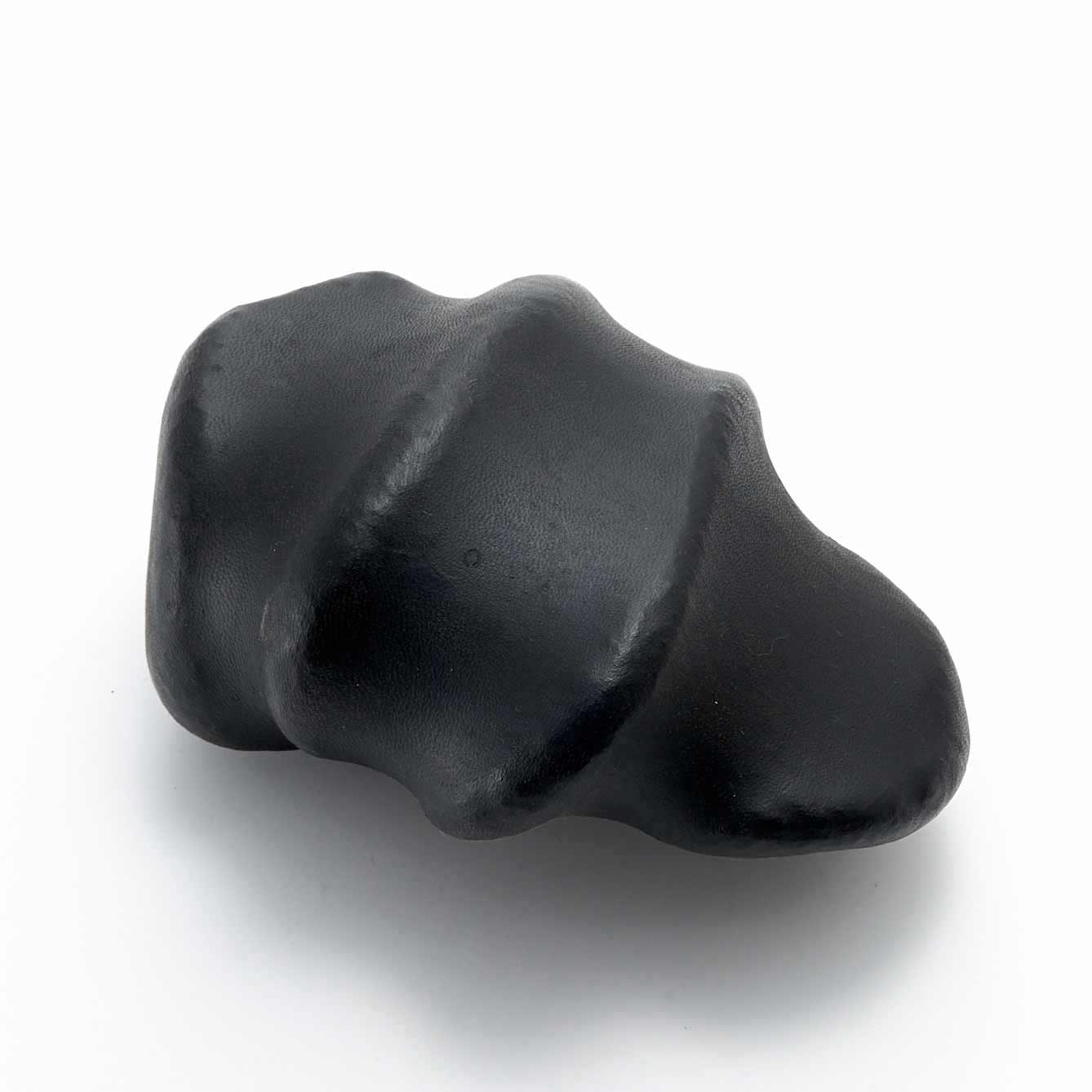 This work is made of stones from the Wachi Forest, where the atelier is located, tightly wrapped in deer skin. This one is made of skin dyed black with tea tannin. The shapes and gaps created by stacking flat stones vertically are cool.The texture of the hide, which at first glance does not seem like hide, is appealing.