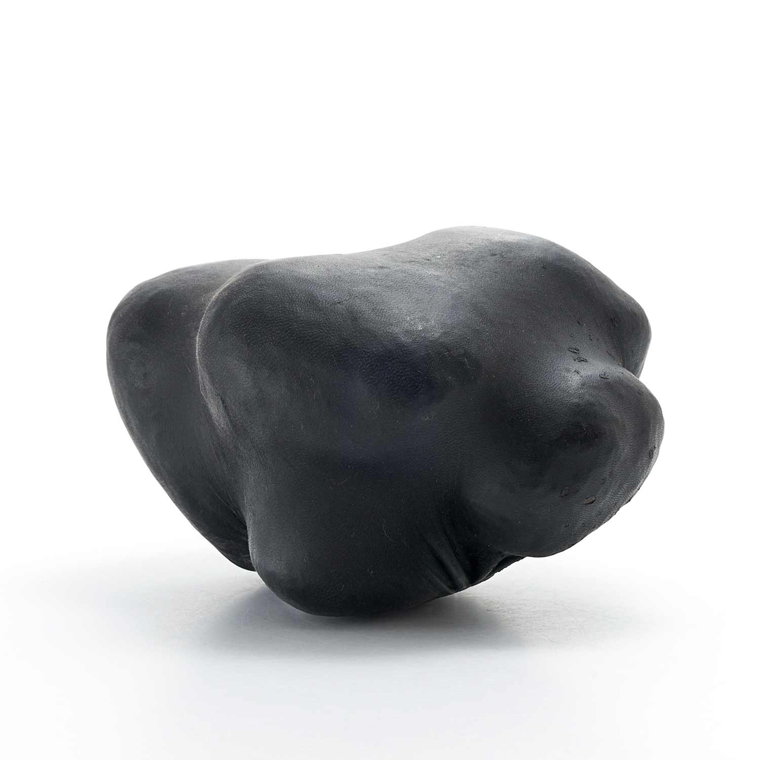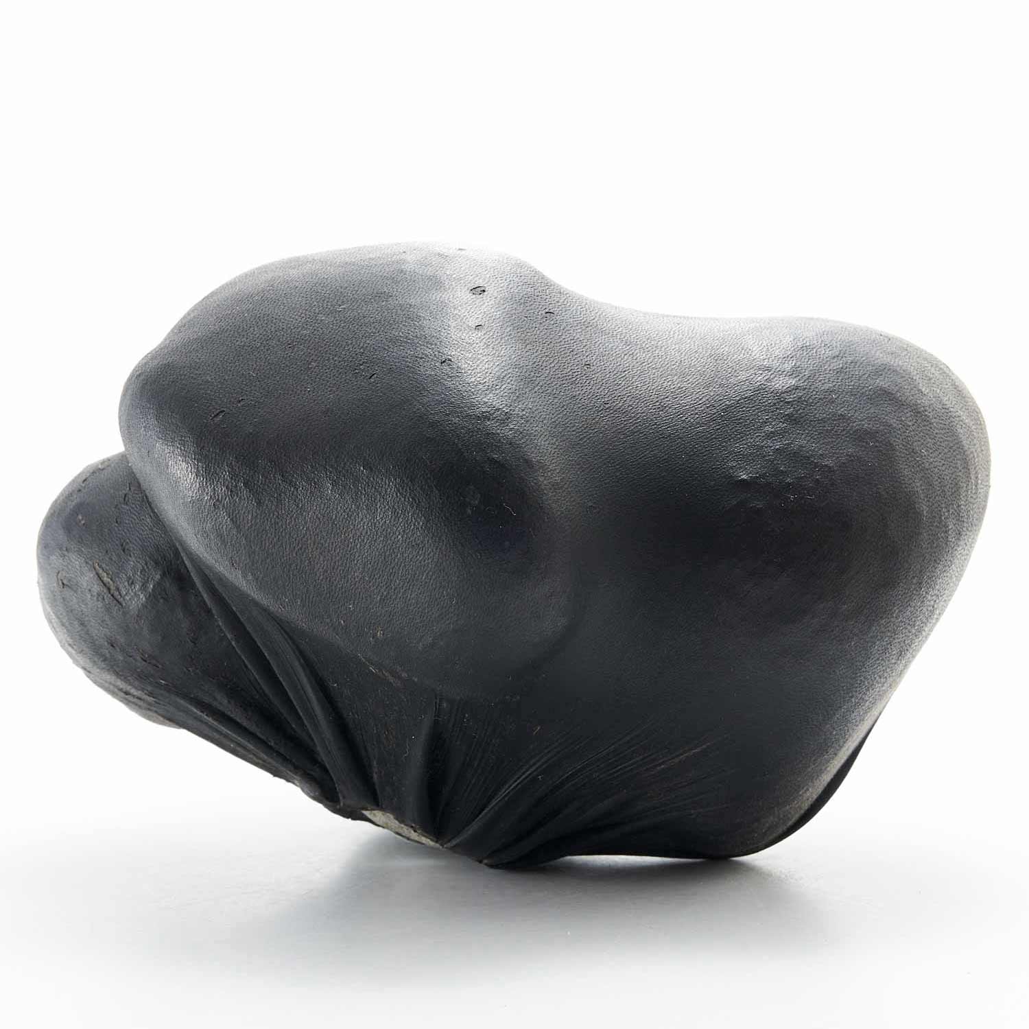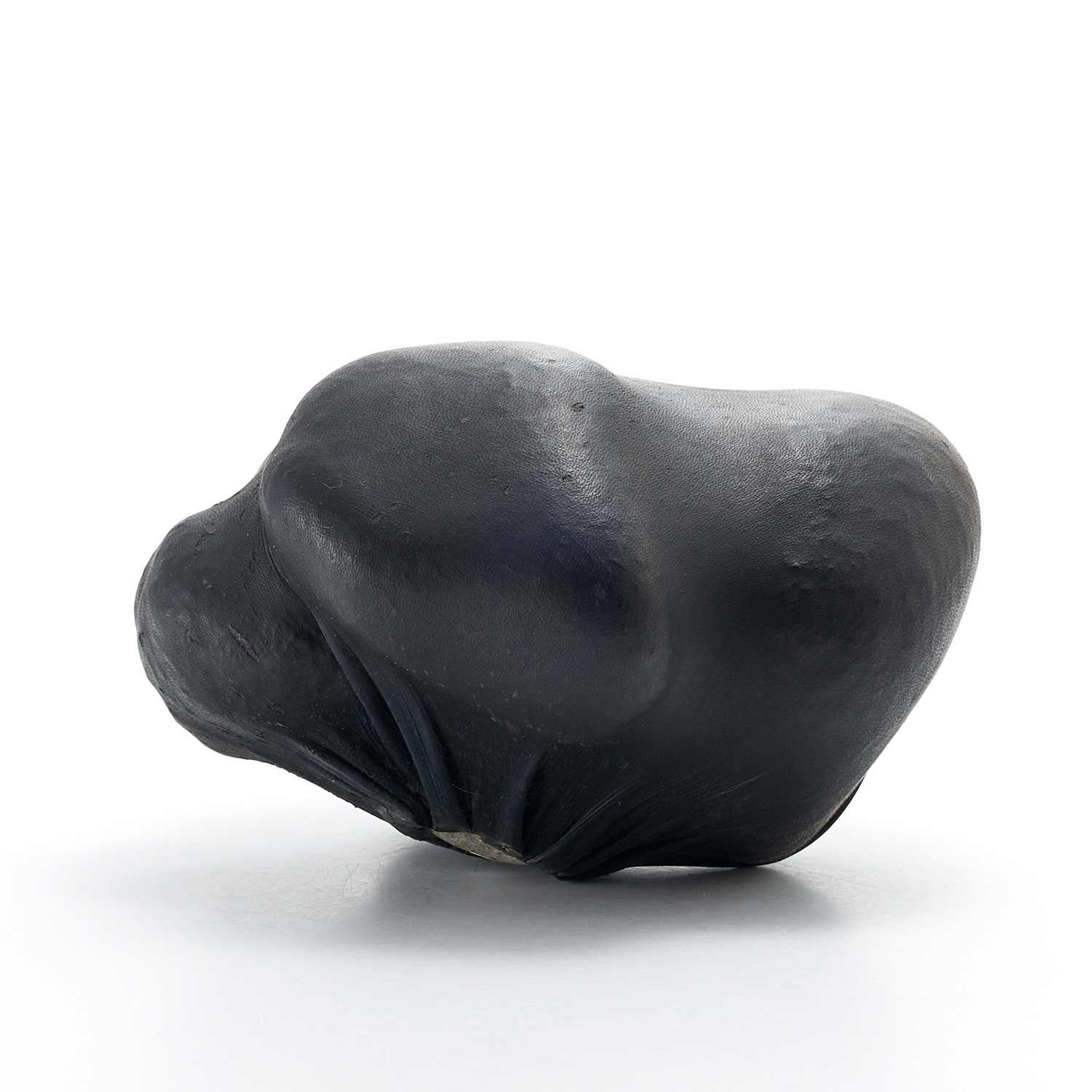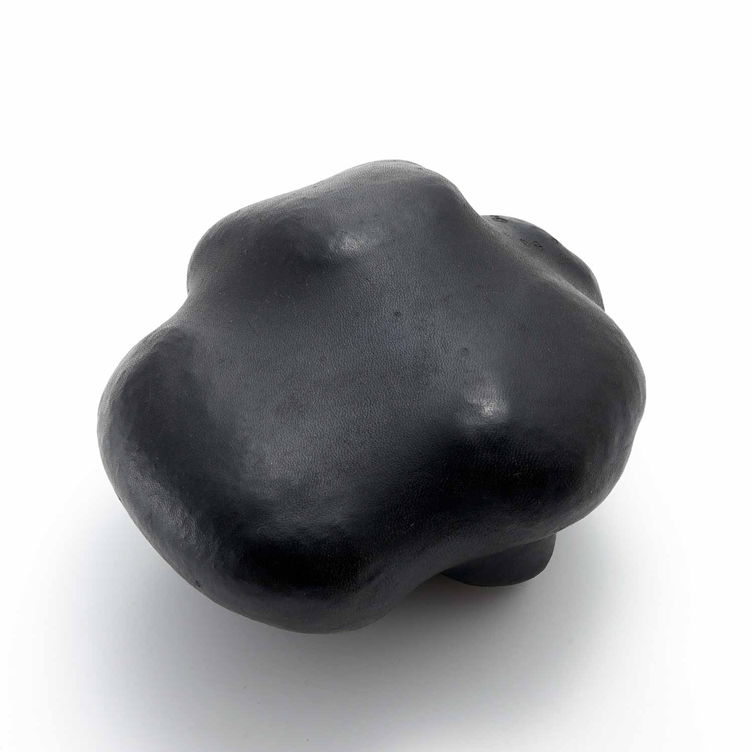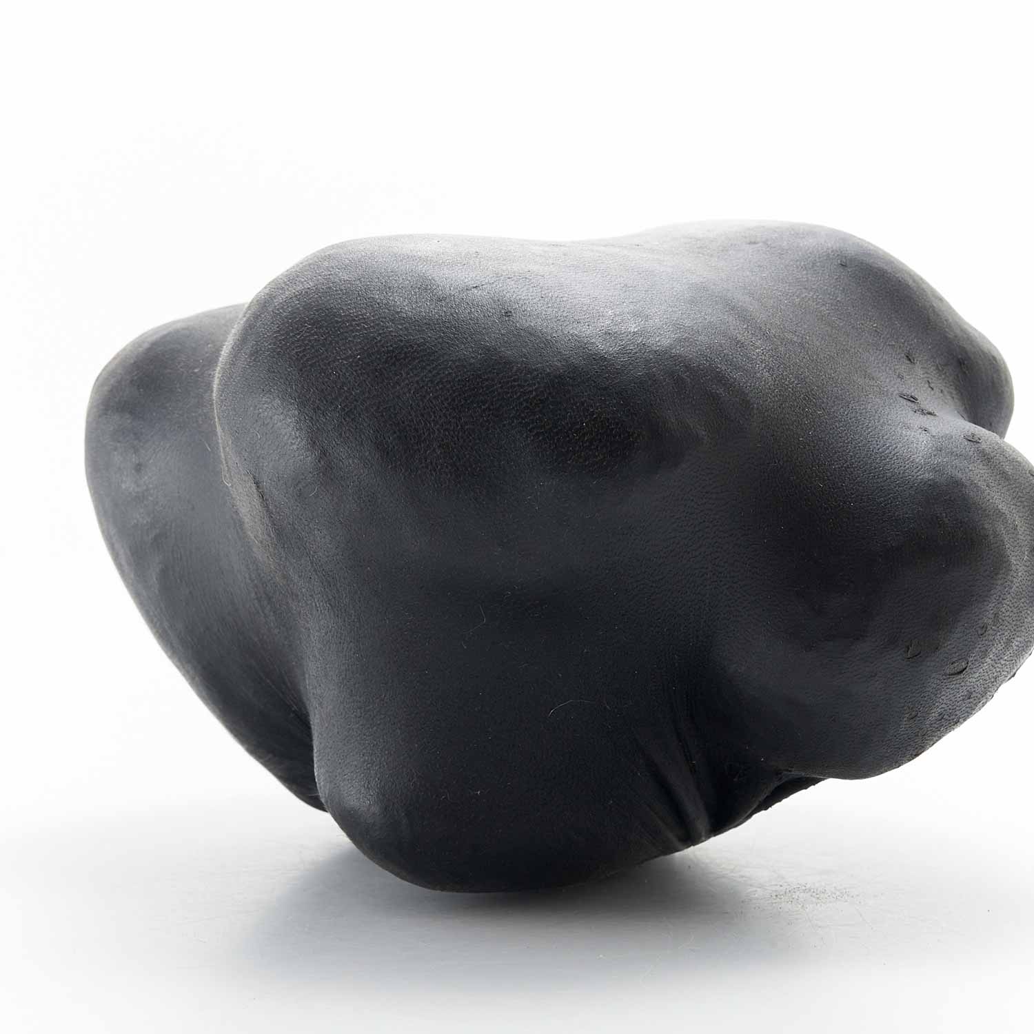 アトリエのある和知の森の石を鹿の皮でぎゅっと包んだ作品です。こちらはお茶のタンニンで黒く染めた皮を使用。丸みのある数個の小石包むことで生まれた形がユニークです。一見、皮とは思えない皮の質感が魅力です。