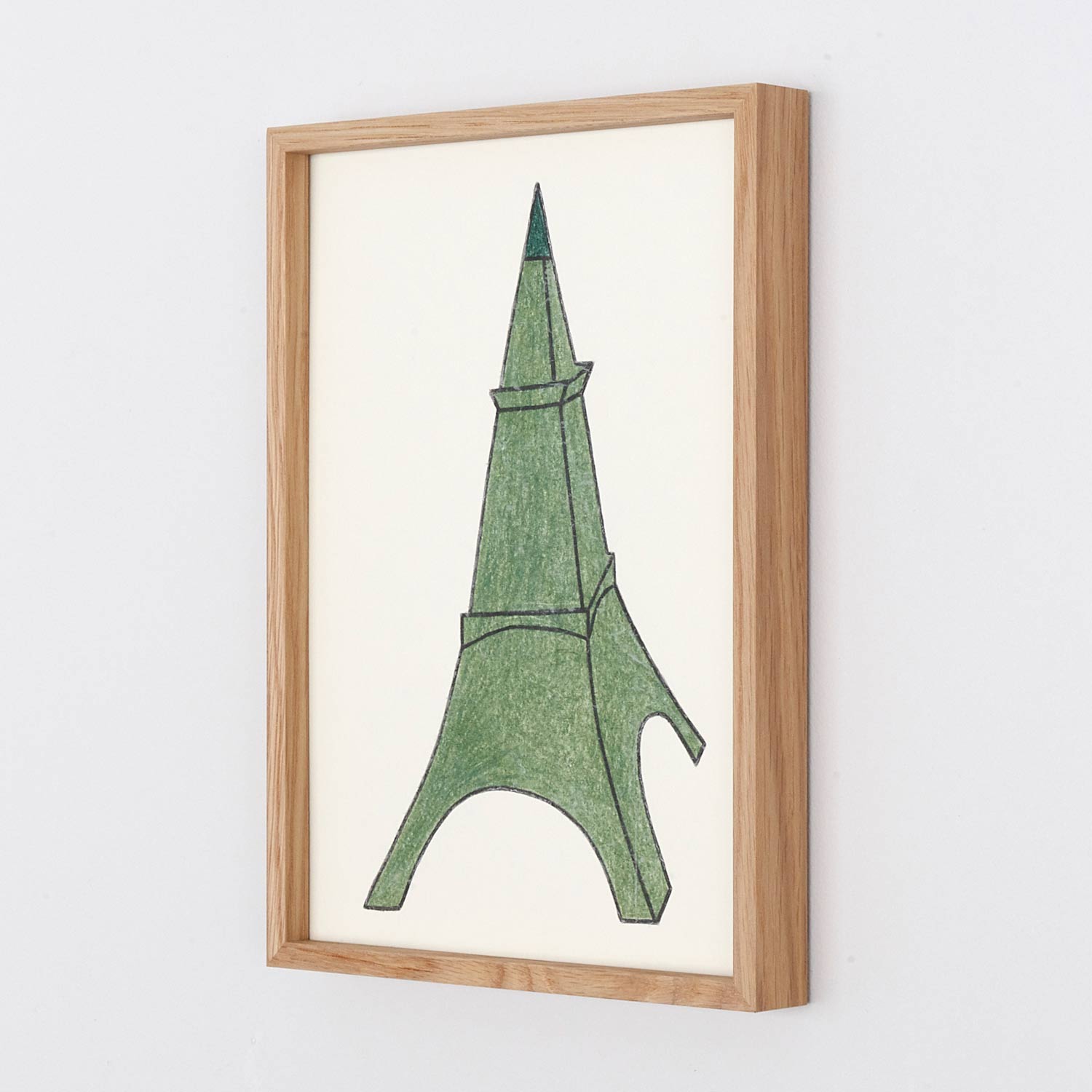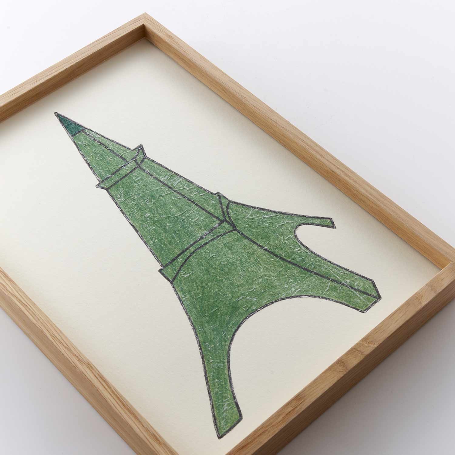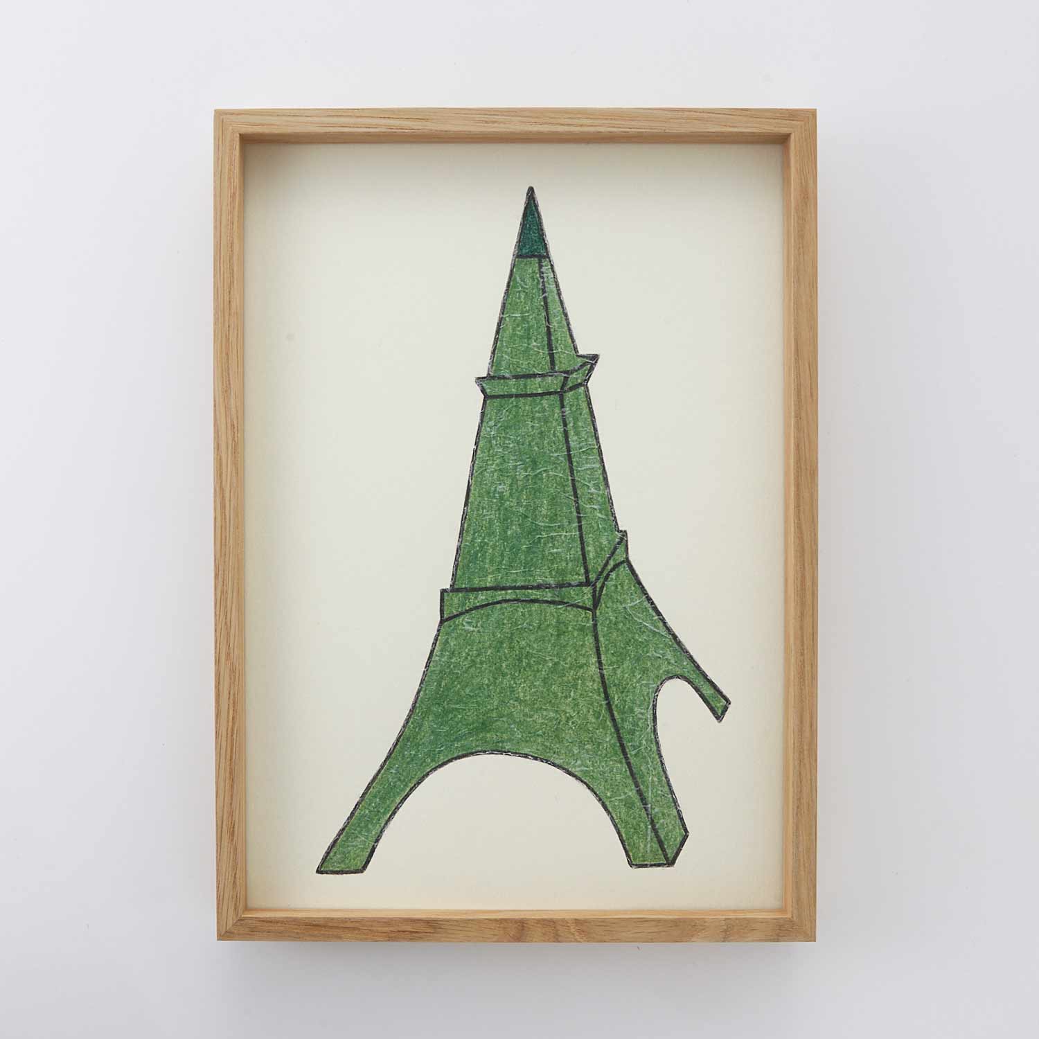 彩色された部分のテクスチャーと鉛筆の線が美しい、塔が描かれた作品。気持ちが豊かに緩みます。