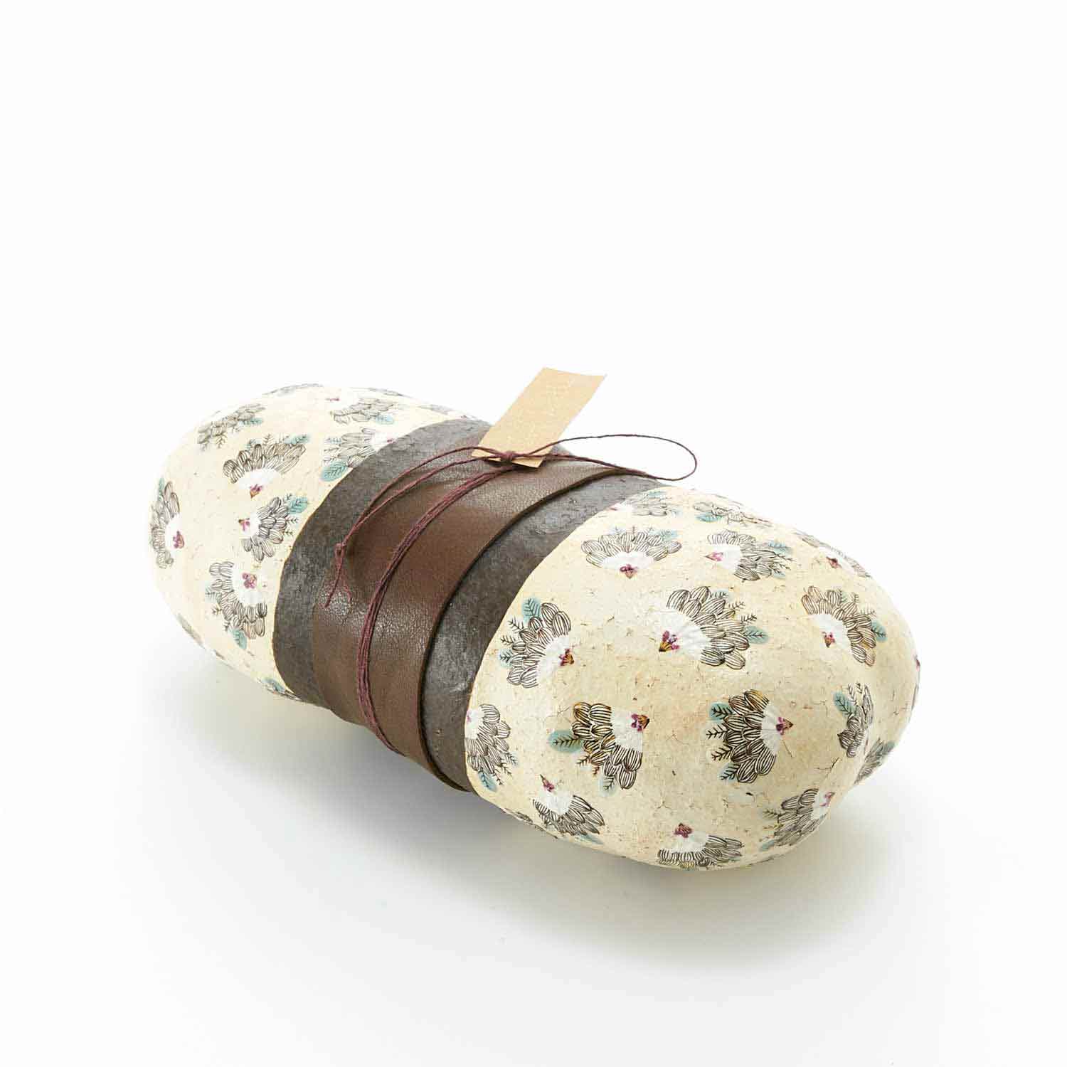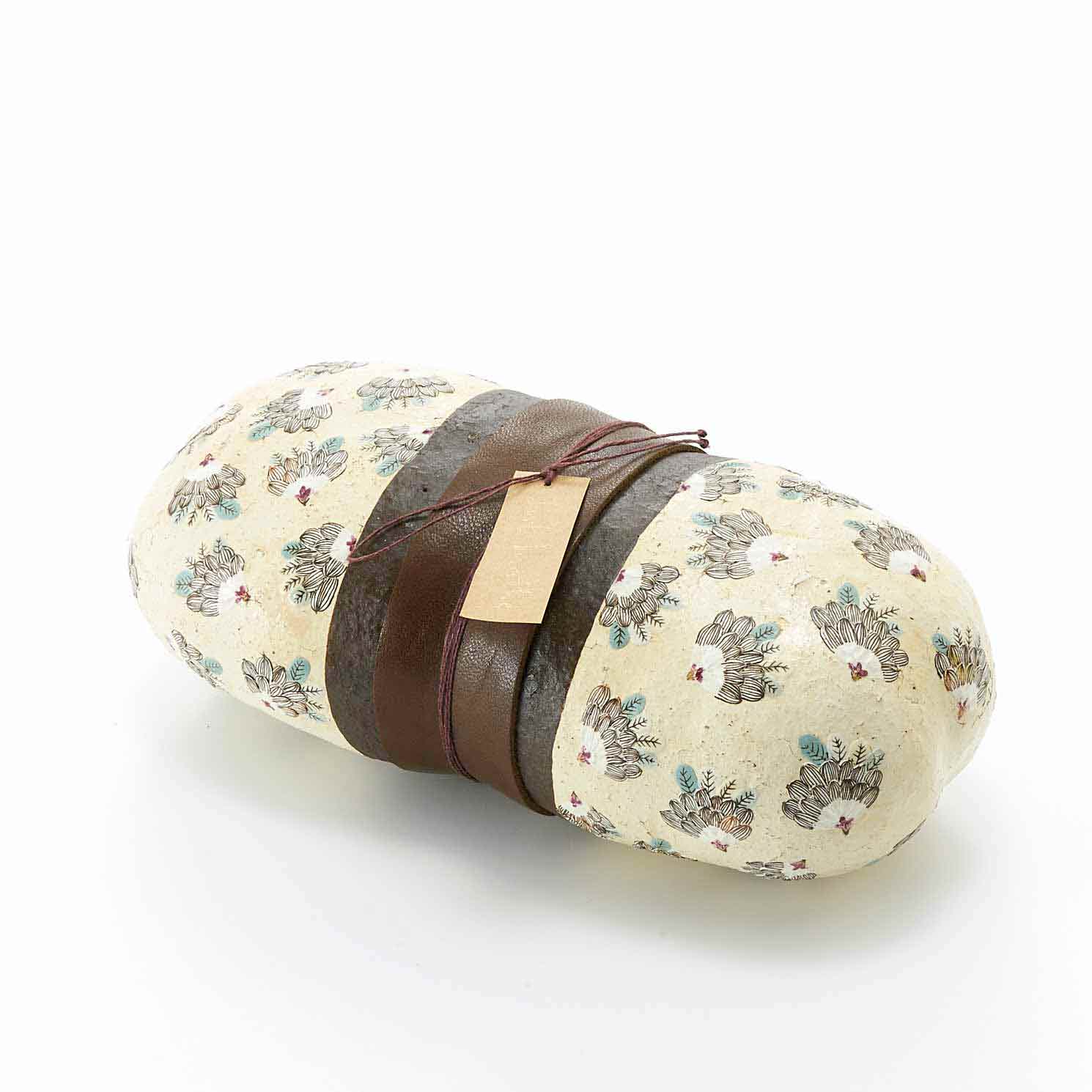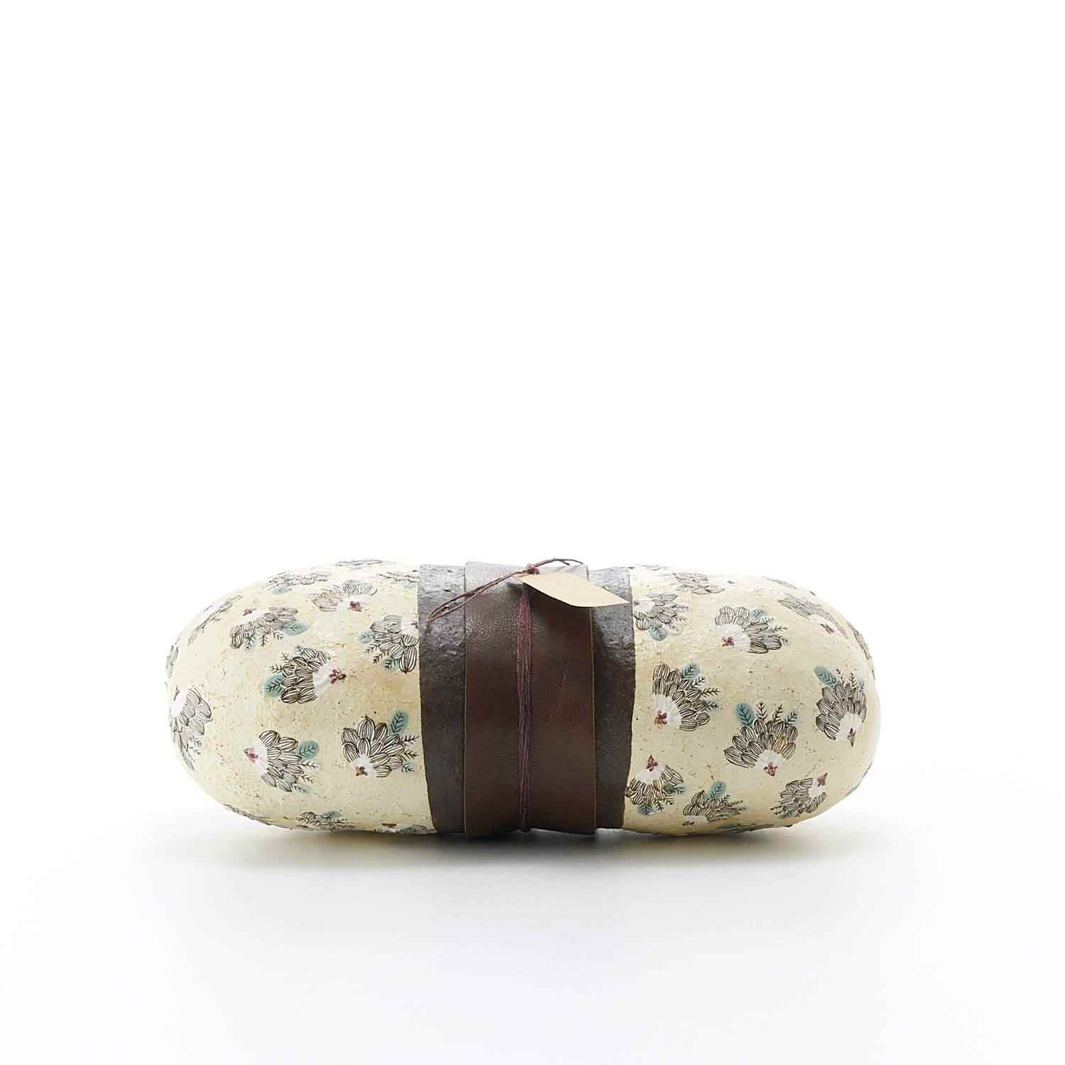 As the title of the work suggests, I would be happy to receive such a work. The shape is like a soft pillow. The white clay is heaped up with a brush to create a three-dimensional effect, and patterns are drawn on it with fine lines. The center of the object is wrapped with a different material, leather, to create a gift.
