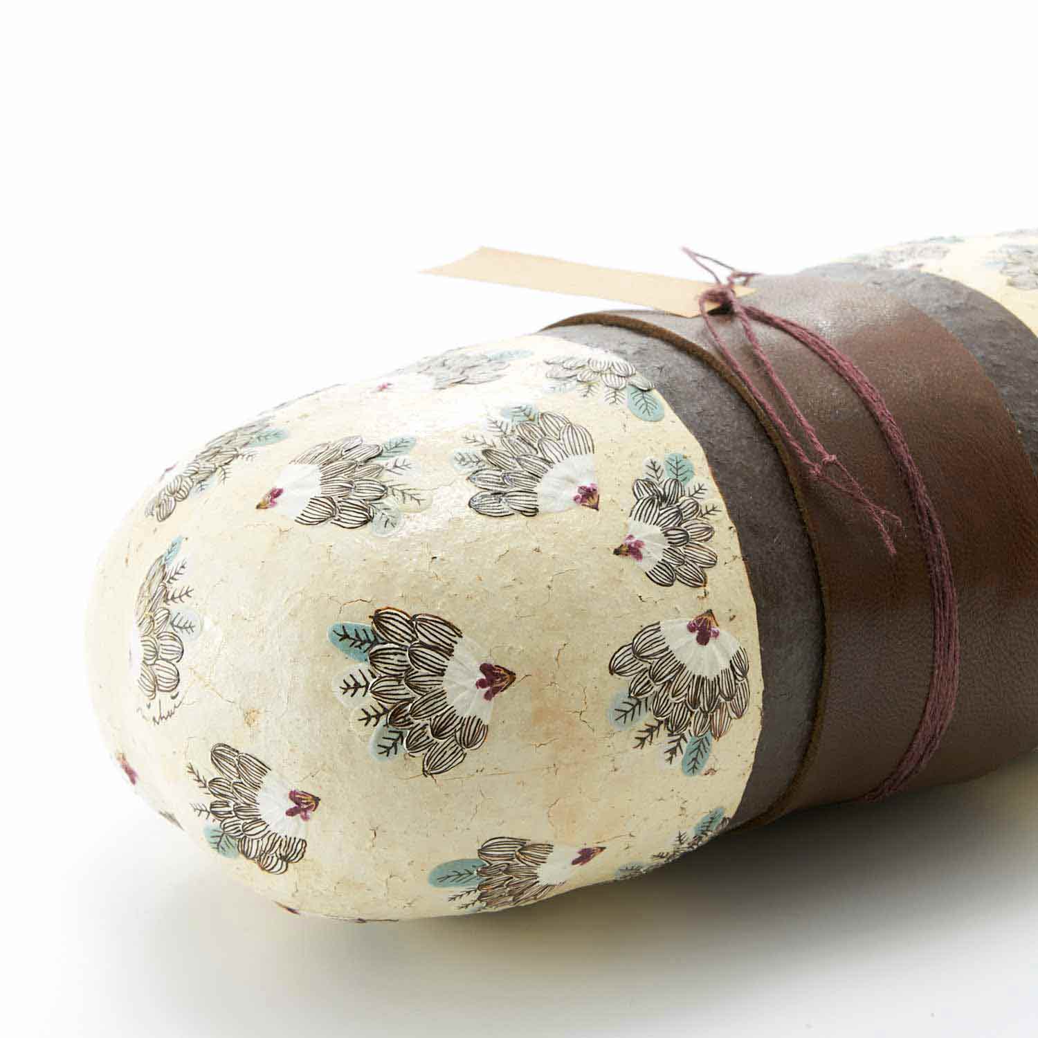 作品のタイトル通り、こんな作品もらったら嬉しいですね。柔らかい枕のような形。白化粧土を筆で盛り立体感を出し、その上に細かな線で紋様を描いています。中央は異素材の革を巻きギフトの演出をしたオブジェです。