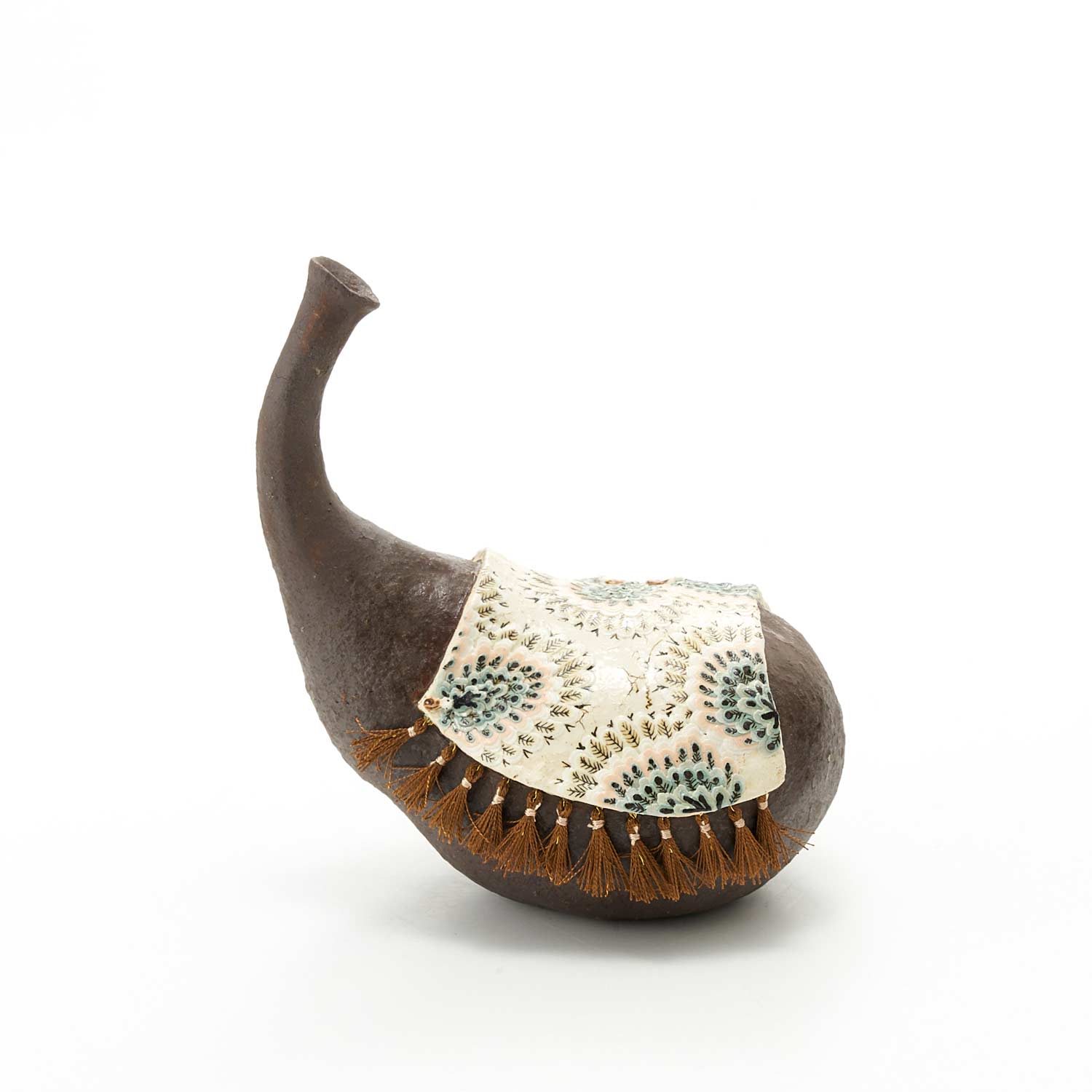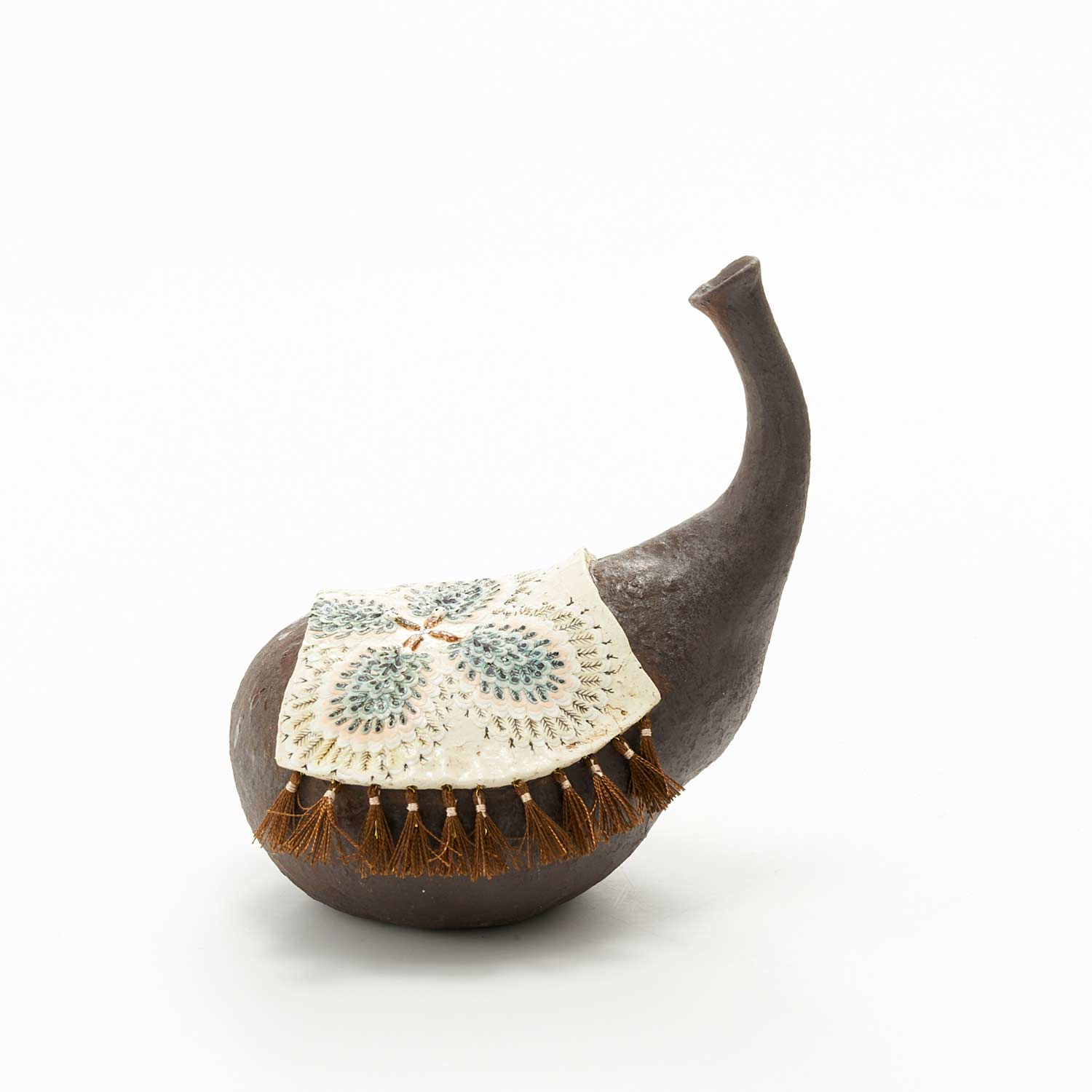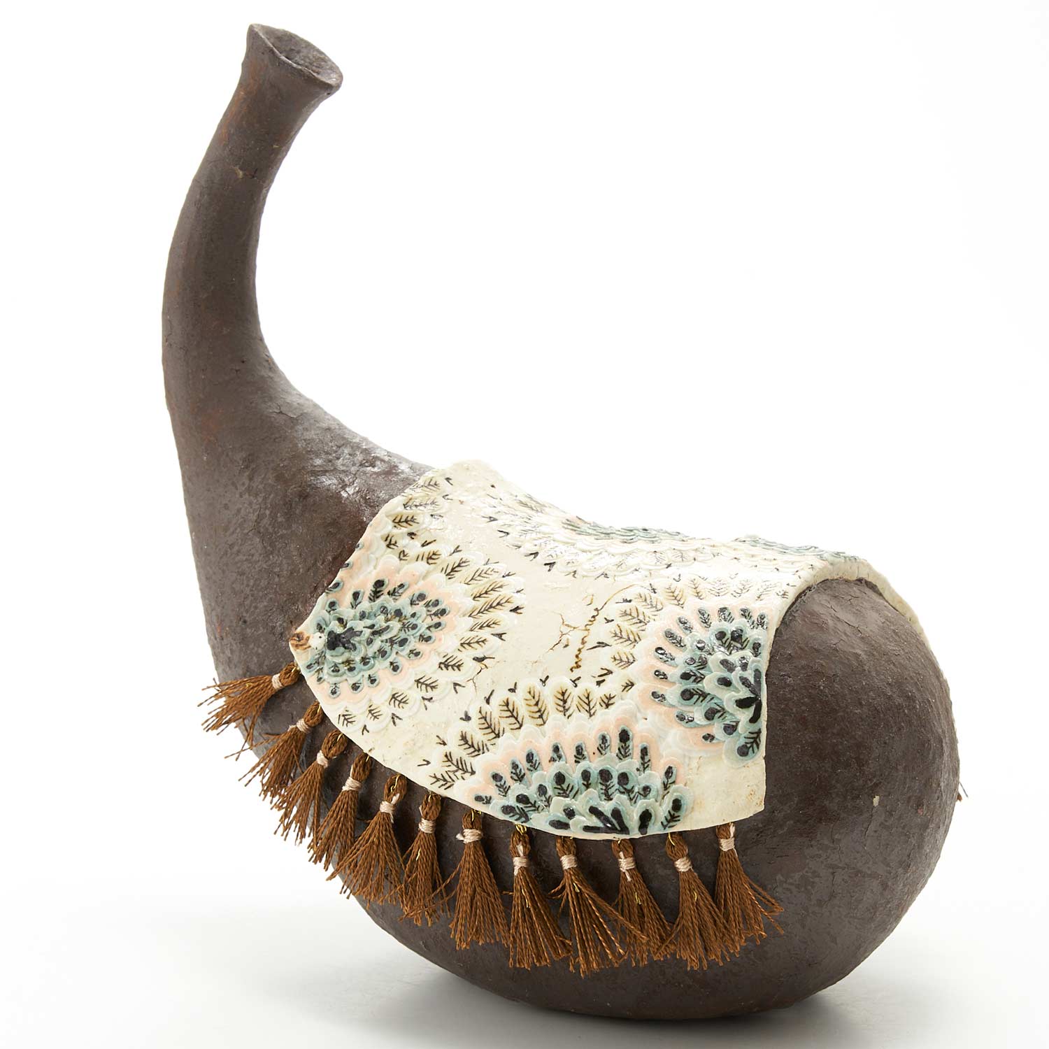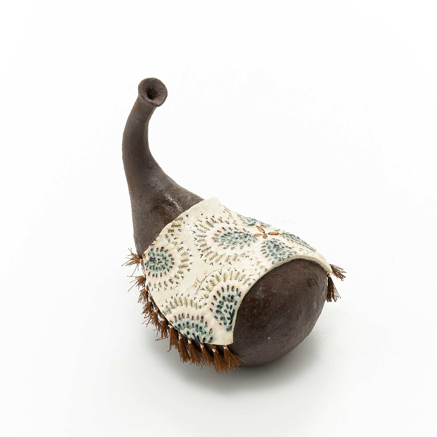 不思議な形の瓶の上に絨毯がかけられています。絨毯には緻密で美しい花が一筆一筆描かれています。絨毯の縁には糸でフリンジが付けられています。ドライフラワーなどを挿しても可愛いと思います。